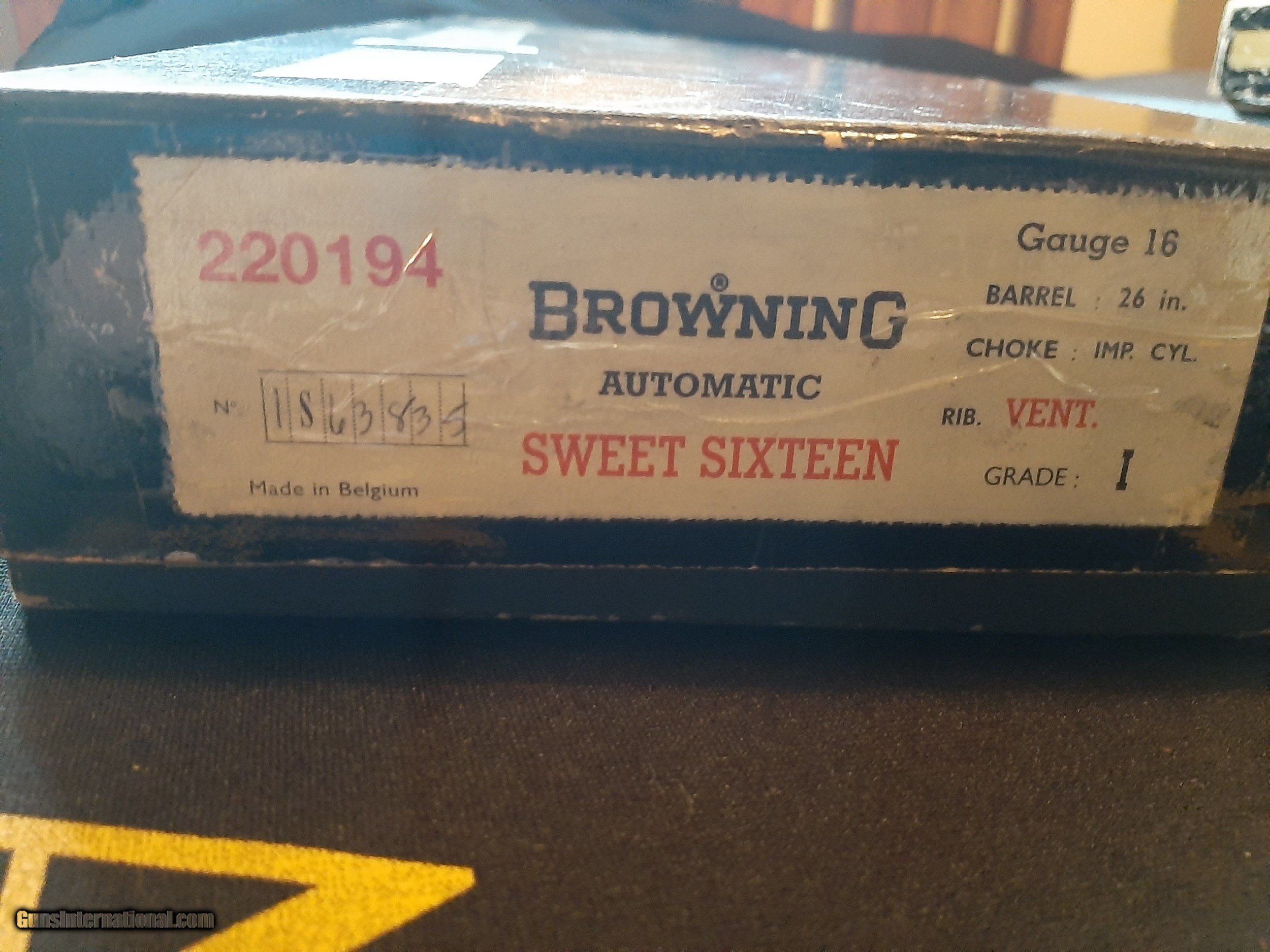 Description: Browning Sweet Sixteen NIB made in 1961. Round Knob Vent Rib 26" Imp Cyl. Credit Cards add 3%. Shipping and Insurance is 60.00 SOLD |