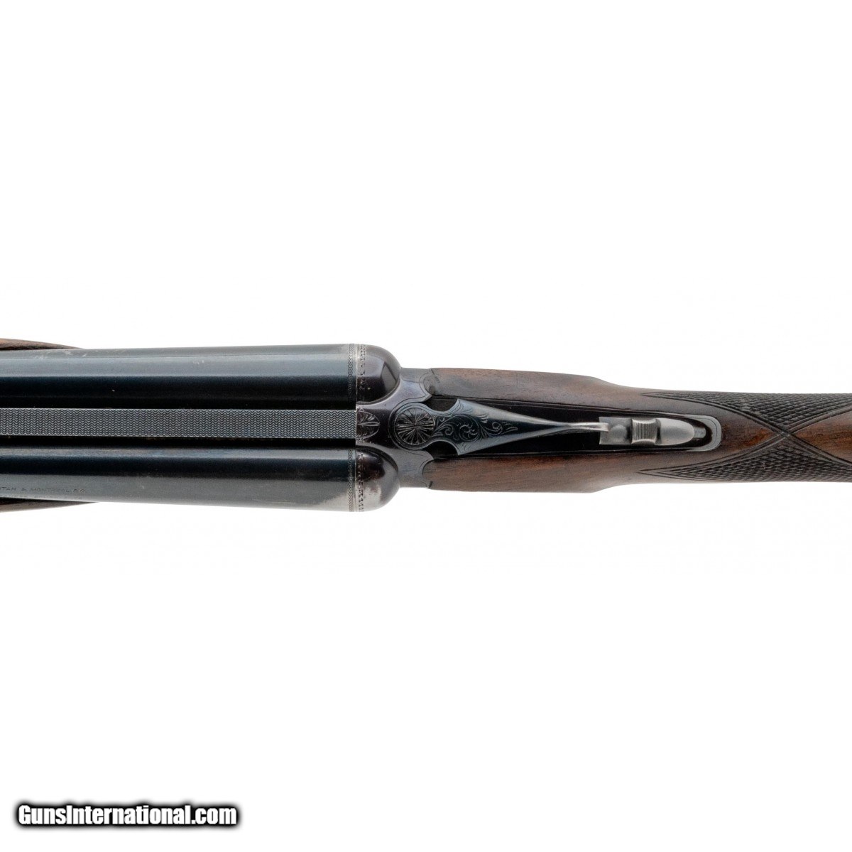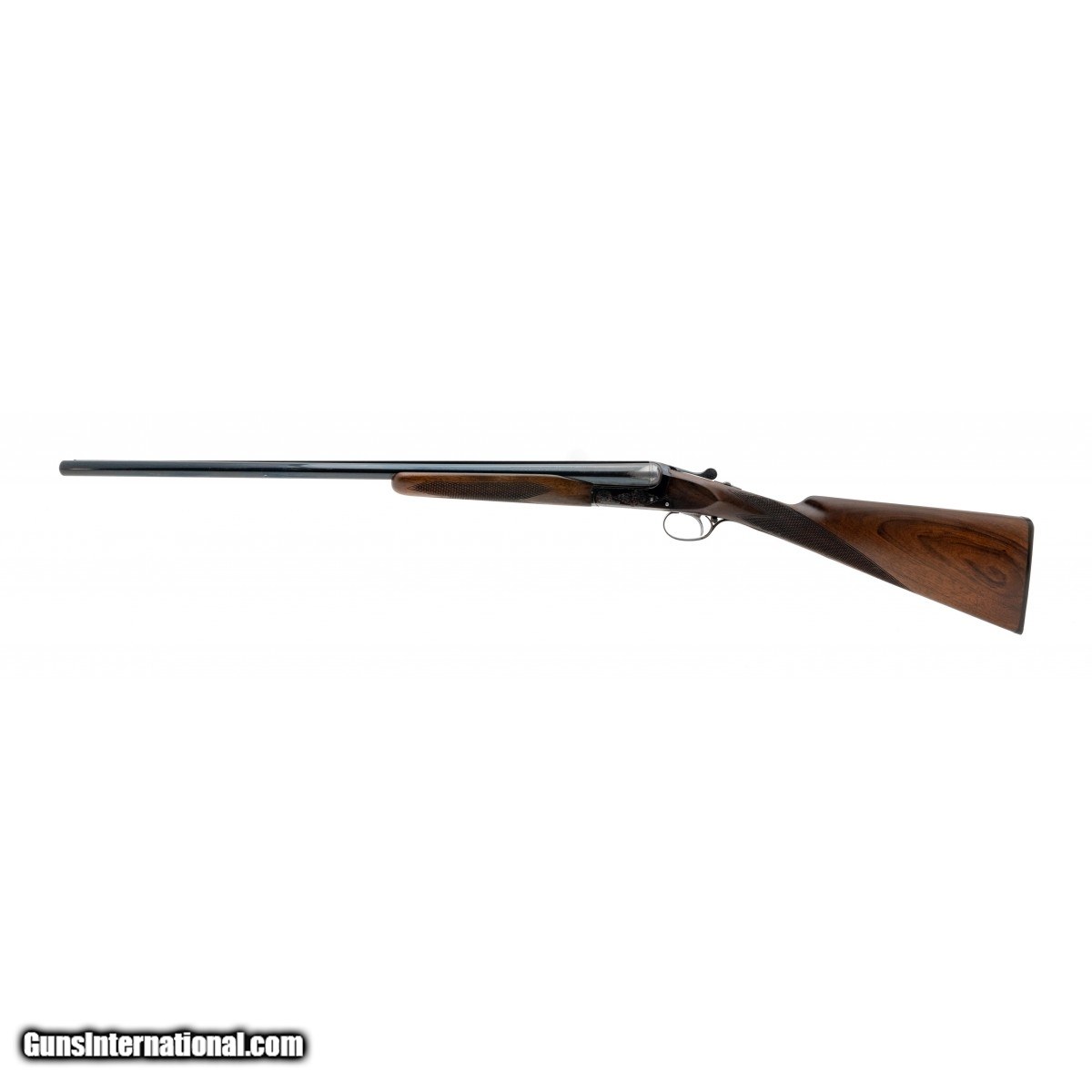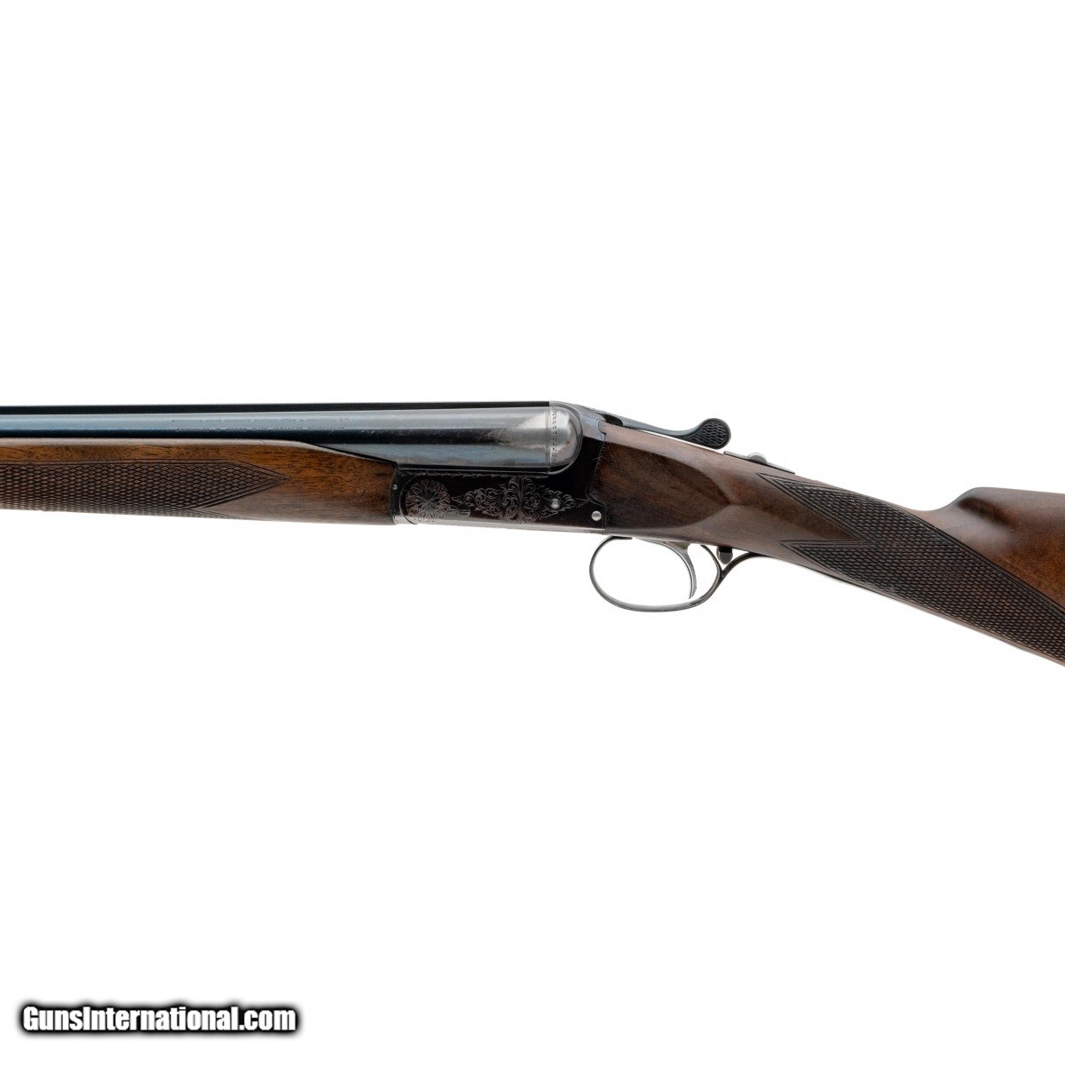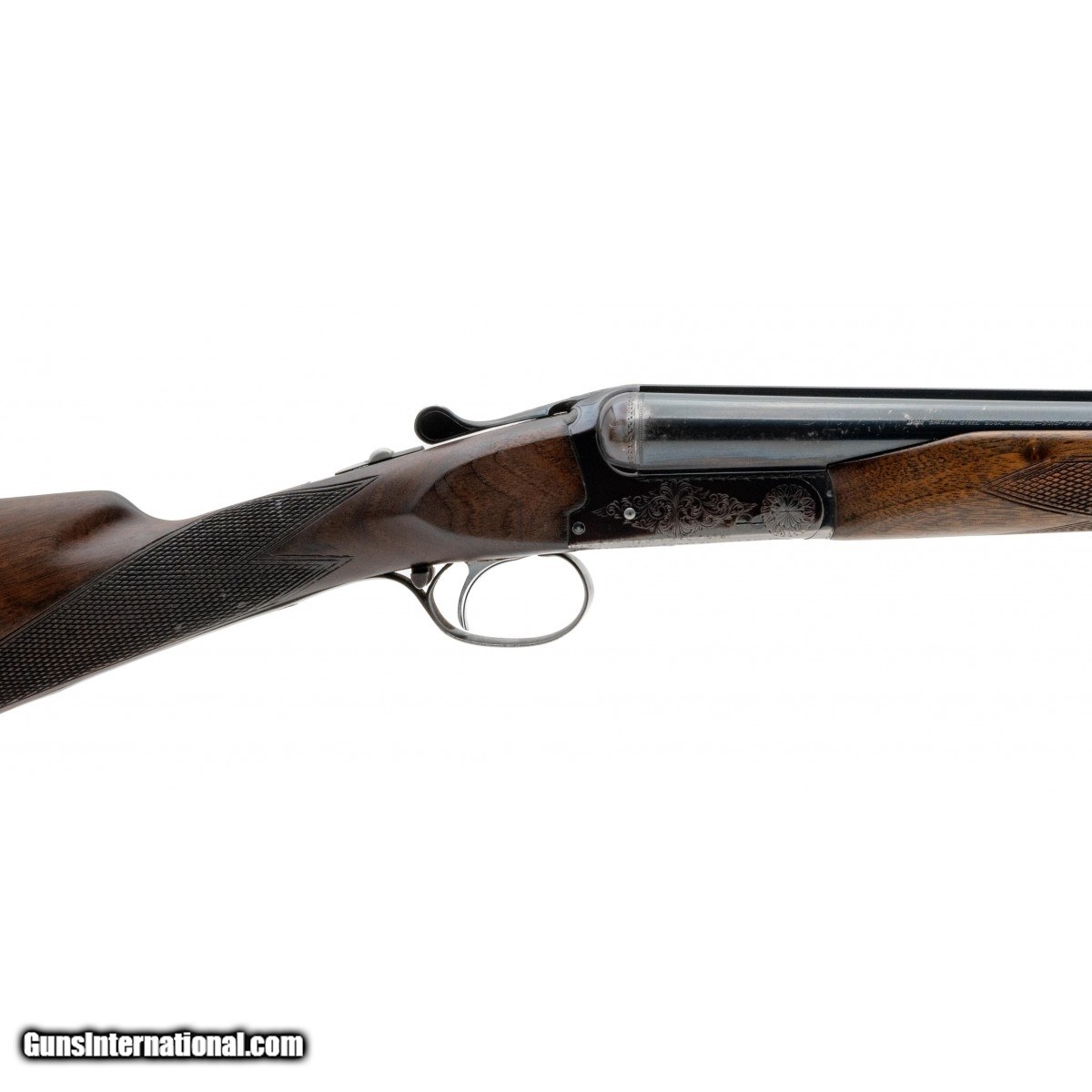 Description: " SN: 01869RR128. Circa 1970s. 20 gauge with a 26"" barrels, bore is excellent. Side by side shotgun with blued finish, engraved receiver, straight grip and checkered walnut stock. Overall very good condition with some wear on receiver and barrel. SOLD |