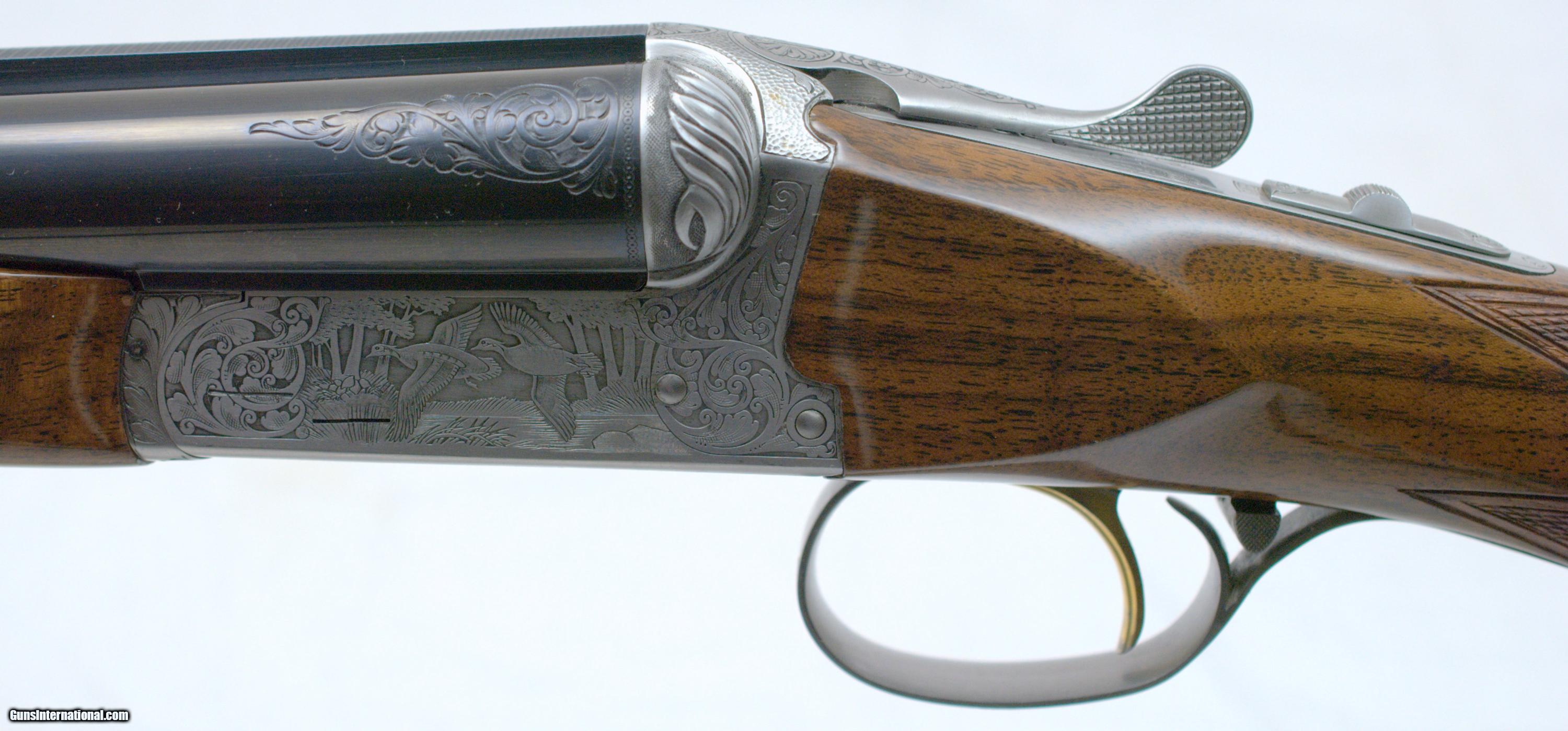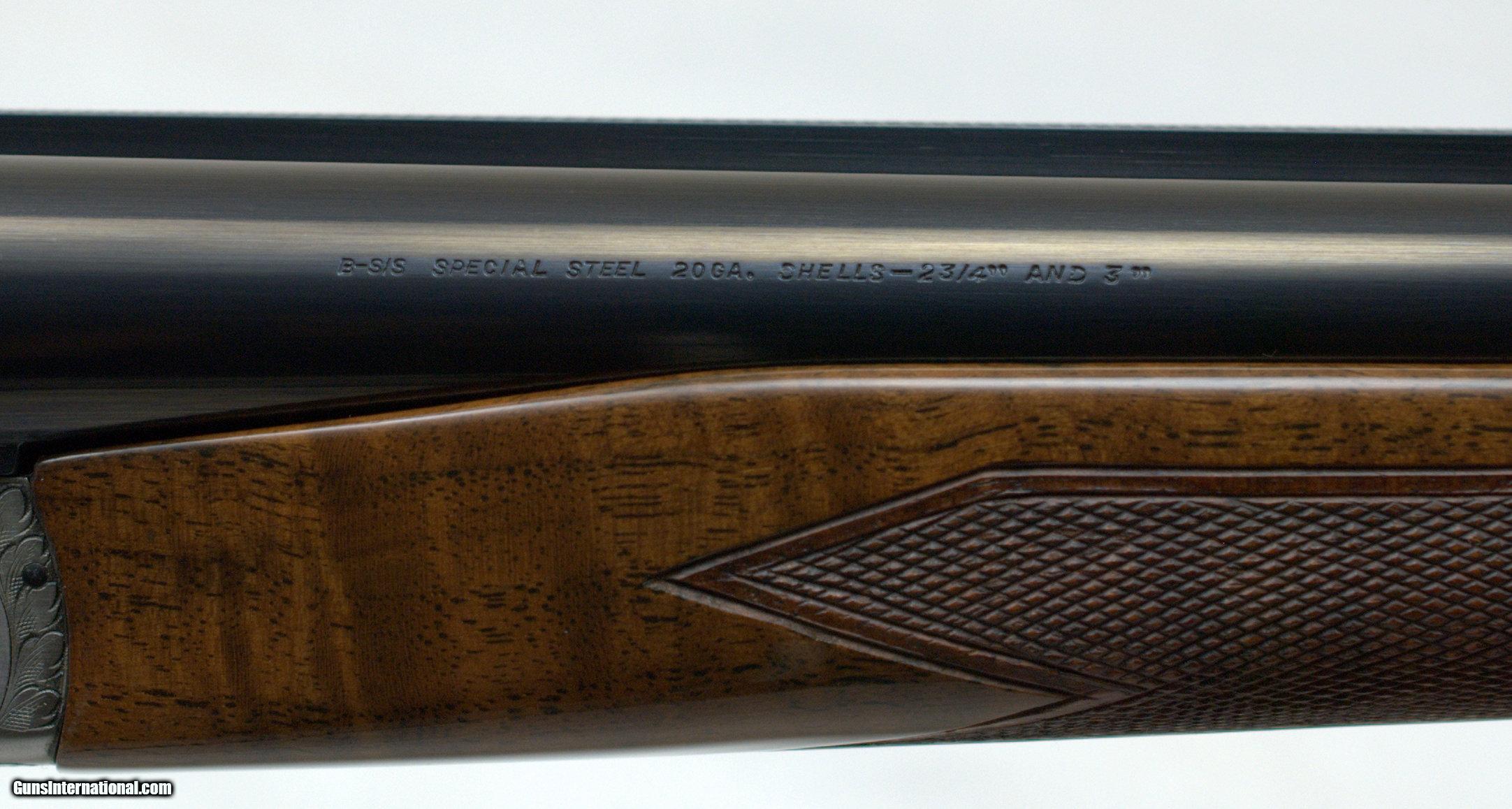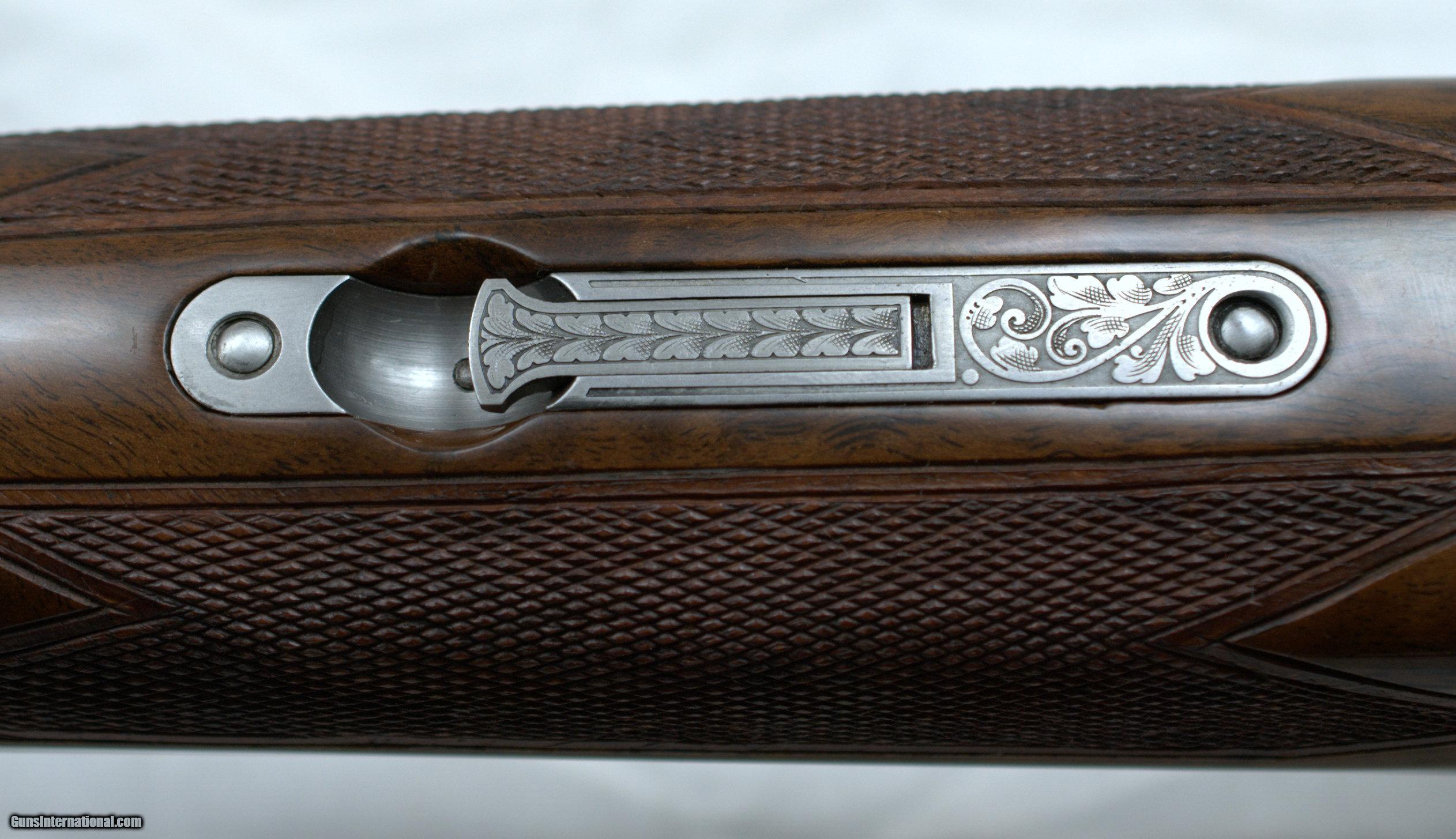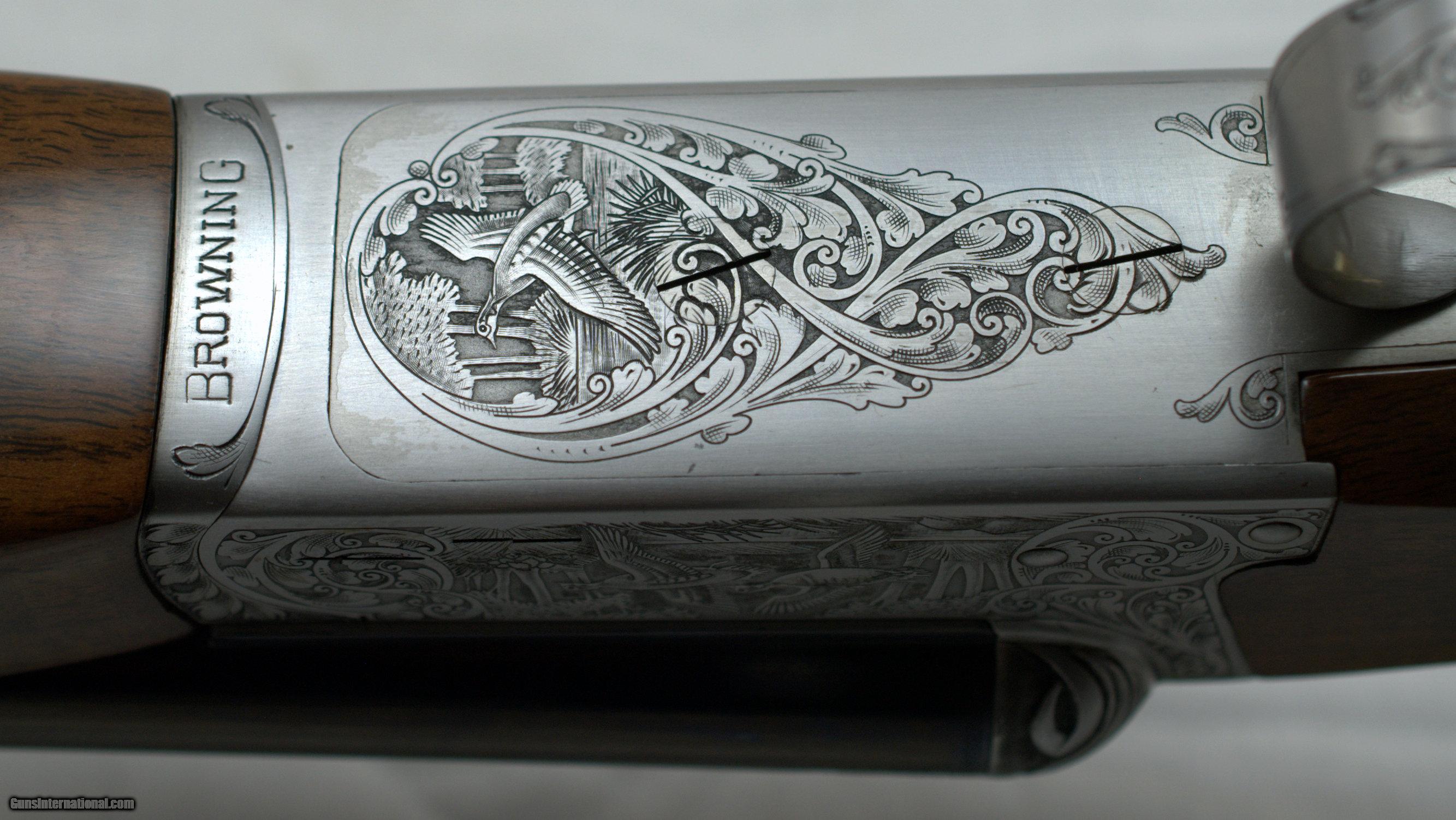 Description: BROWNING B SS 1 OF 100 20GA 26″ Barrels ... 3″ chambers ... Choked: MOD/IMP CYL ... LOP 14 1/8 ... DAH 2 1/2 ... DAC 1 1/2 ... Weight: 6 lb 8 oz ... Matted Rib ... German Silver front bead ... single selective trigger ... auto ejectors ... auto safety PROVENANCE: The Estate of B.E. “Andy” Anderson. CONDITION: Exceptionally fine, near new. Assembled in Korea, from Japanese parts, finished and engraved in Belgium. Full length matted rib with German Silver front bead. Breech end lightly scroll engraved. Gold plated single selective trigger, automatic ejectors, automatic safety. Receiver nicely engraved with flying ducks in game scene on both right and left side, surrounded by scroll. Flying duck in marsh scene on bottom, also surrounded by scroll. Top lever and trigger guard lightly scroll engraved. Trigger guard tang marked “ONE OF ONE HUNDRED”. Barrel fences are deeply carved with floral petals. Retaining nearly all factory finishes to both wood and metal. Mechanics are excellent. Brilliant shiny bores. Straight grained fiddle back walnut stock with 14-1/8″ LOP over Browning black plastic buttplate. Buttstock checkered in 2-point pattern with mullered border. Beavertail forend with Deeley release, checkered with 2-point pattern on sides. Cased in Browning beige wool lined case with instruction manual. Case is excellent with a few minor scuffs. Call with any questions and see our other listings for "Only the best!" SOLD |