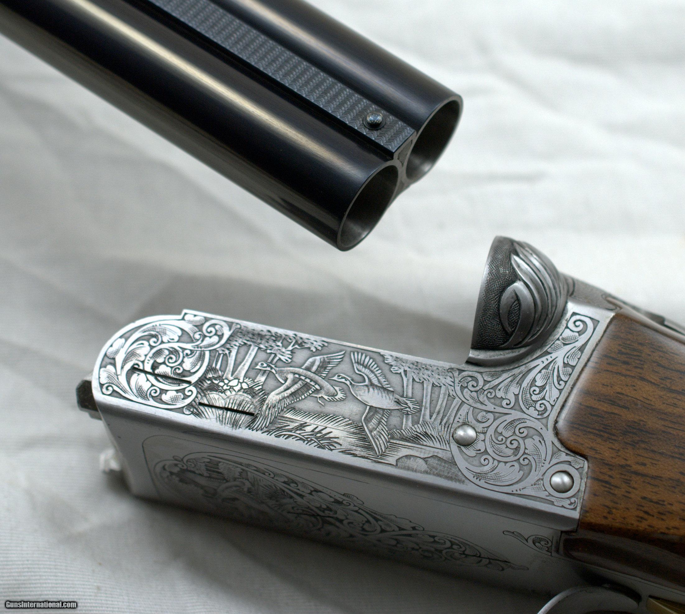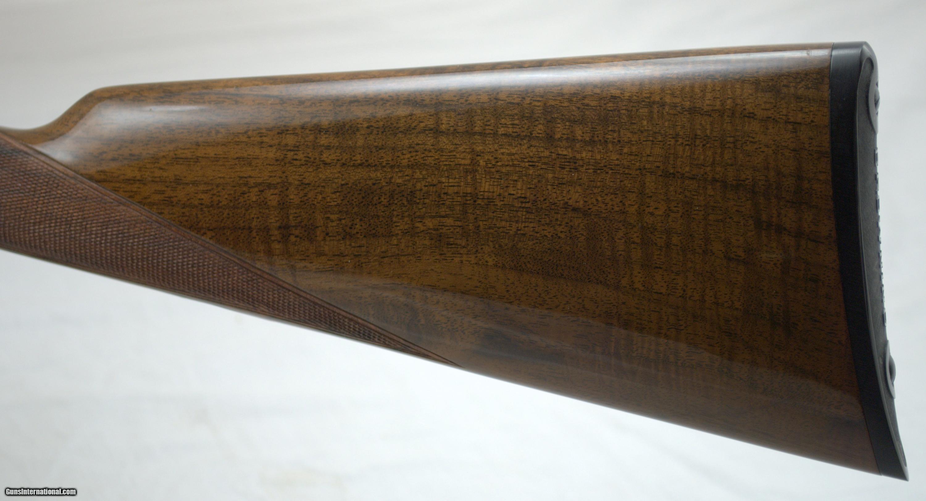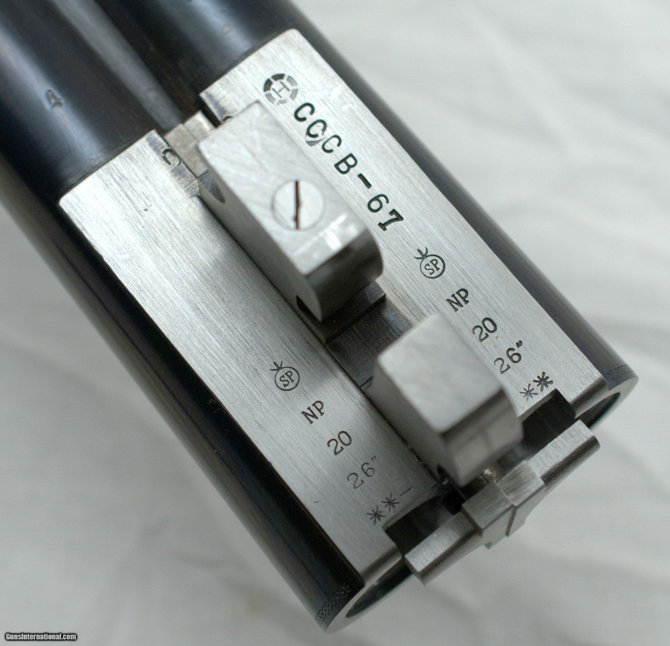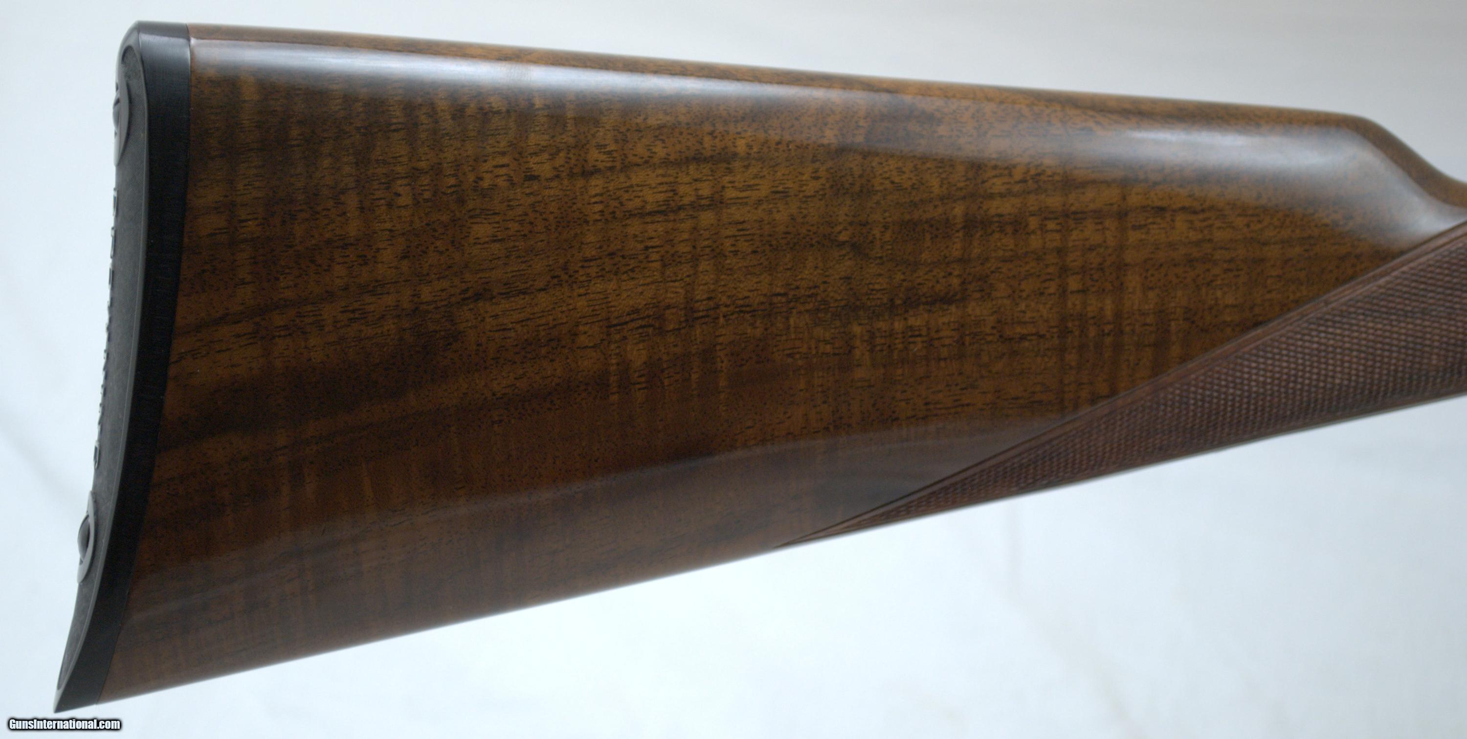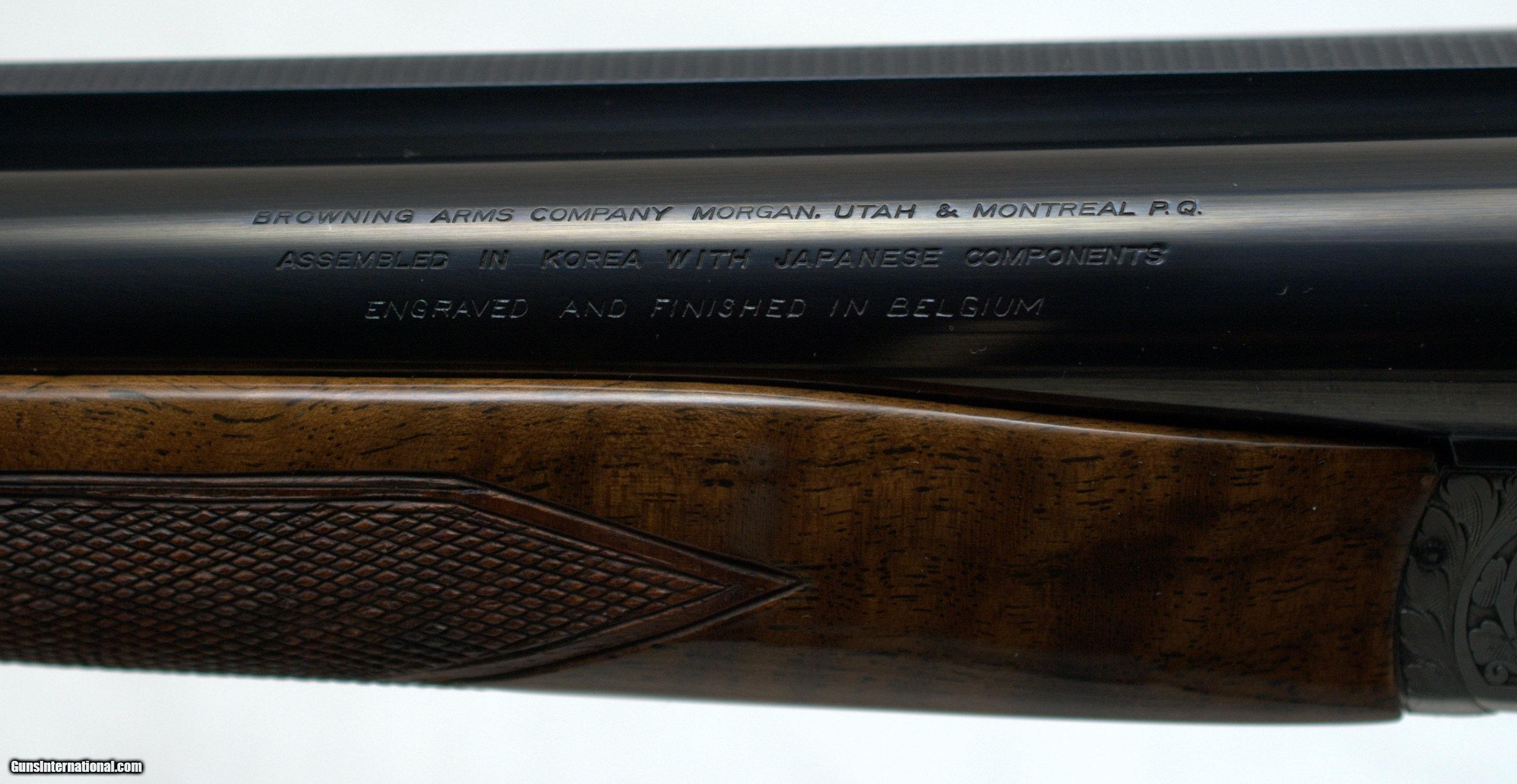 Description: BROWNING B SS 1 OF 100 20GA 26″ Barrels ... 3″ chambers ... Choked: MOD/IMP CYL ... LOP 14 1/8 ... DAH 2 1/2 ... DAC 1 1/2 ... Weight: 6 lb 8 oz ... Matted Rib ... German Silver front bead ... single selective trigger ... auto ejectors ... auto safety PROVENANCE: The Estate of B.E. “Andy” Anderson. CONDITION: Exceptionally fine, near new. Assembled in Korea, from Japanese parts, finished and engraved in Belgium. Full length matted rib with German Silver front bead. Breech end lightly scroll engraved. Gold plated single selective trigger, automatic ejectors, automatic safety. Receiver nicely engraved with flying ducks in game scene on both right and left side, surrounded by scroll. Flying duck in marsh scene on bottom, also surrounded by scroll. Top lever and trigger guard lightly scroll engraved. Trigger guard tang marked “ONE OF ONE HUNDRED”. Barrel fences are deeply carved with floral petals. Retaining nearly all factory finishes to both wood and metal. Mechanics are excellent. Brilliant shiny bores. Straight grained fiddle back walnut stock with 14-1/8″ LOP over Browning black plastic buttplate. Buttstock checkered in 2-point pattern with mullered border. Beavertail forend with Deeley release, checkered with 2-point pattern on sides. Cased in Browning beige wool lined case with instruction manual. Case is excellent with a few minor scuffs. Call with any questions and see our other listings for "Only the best!" SOLD |