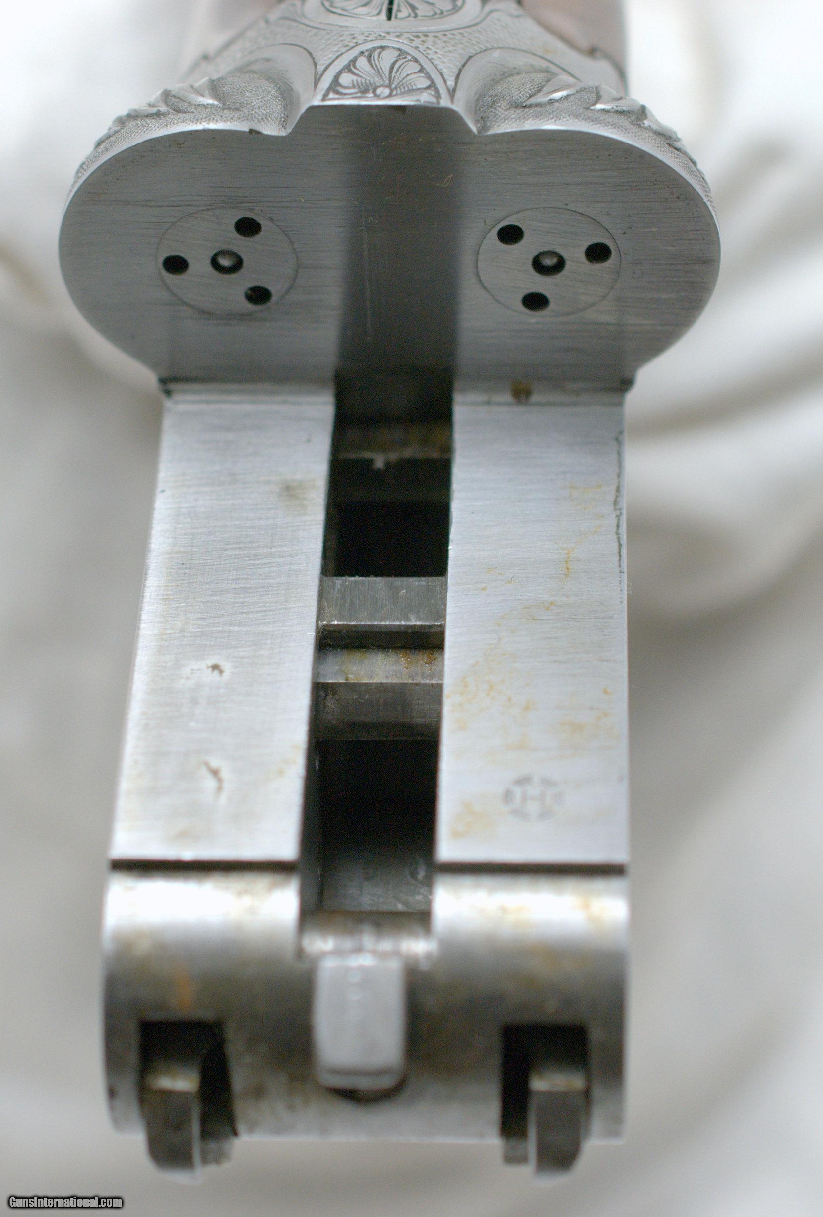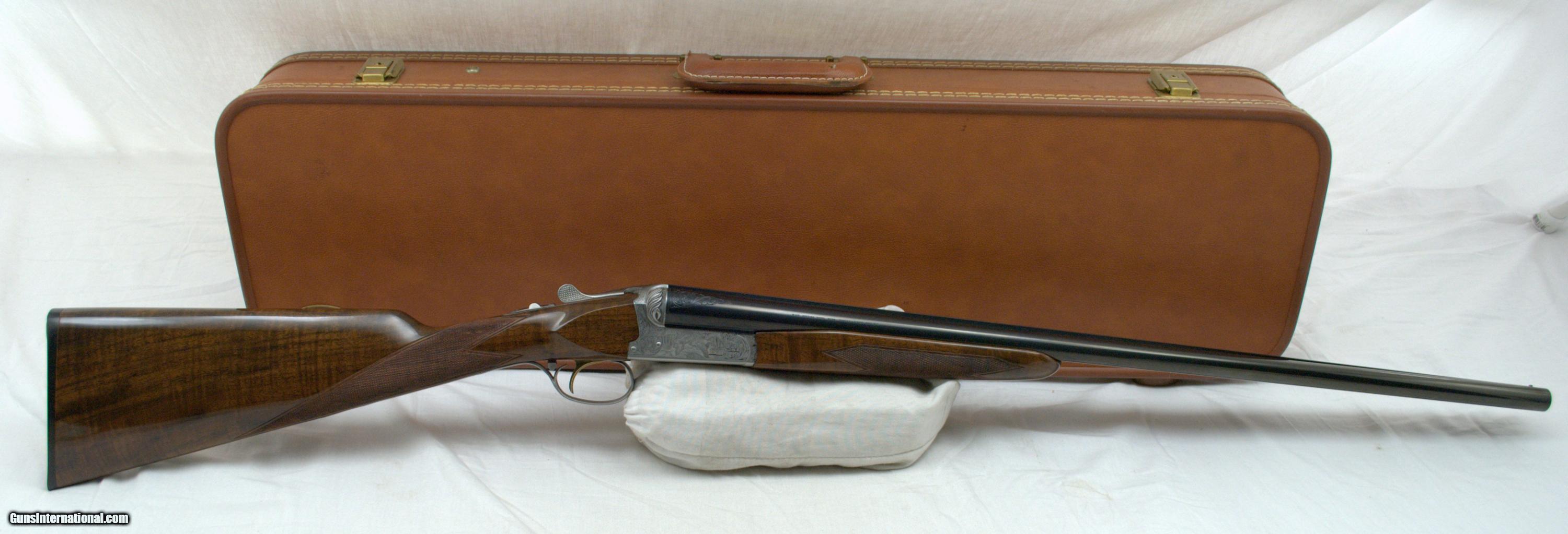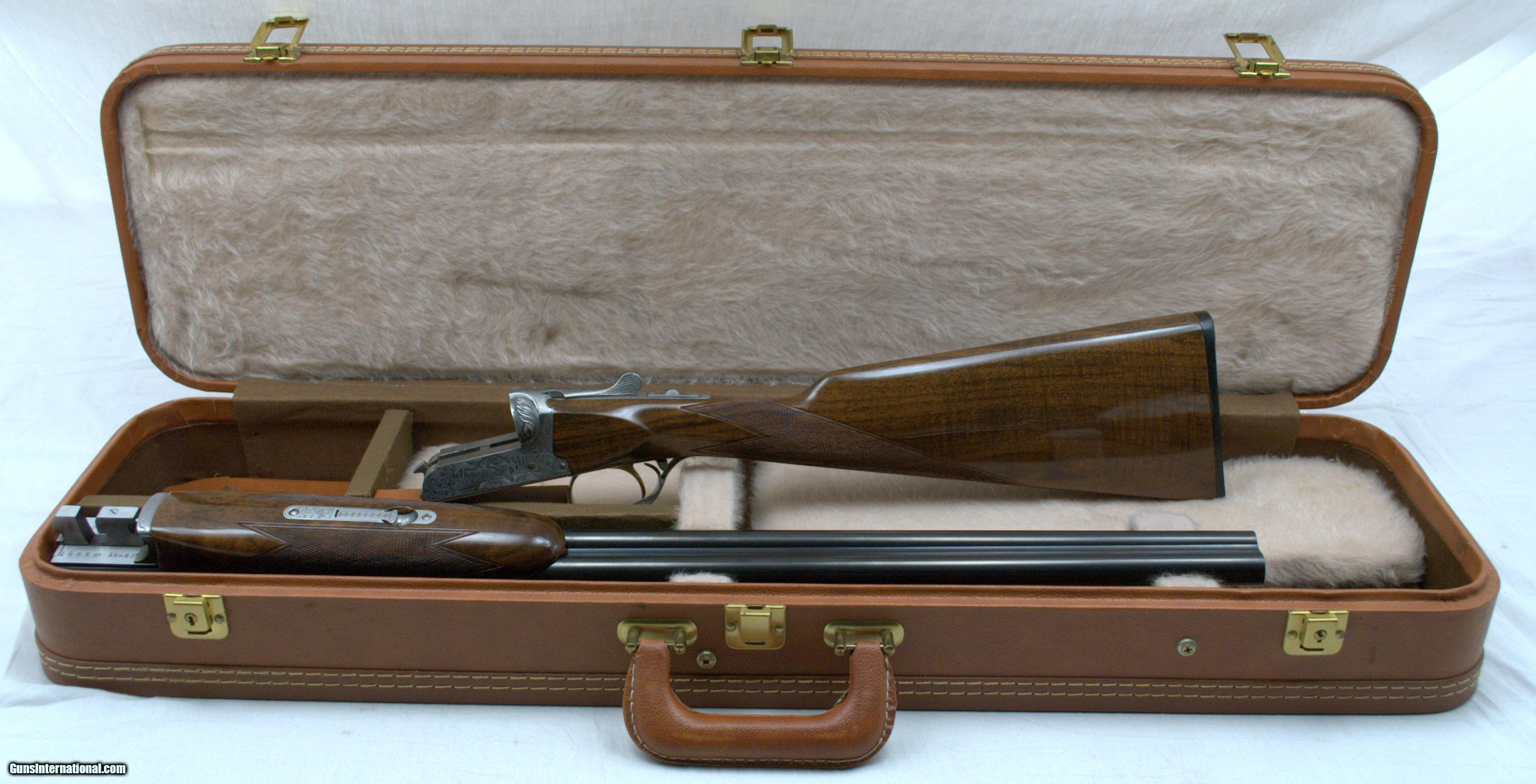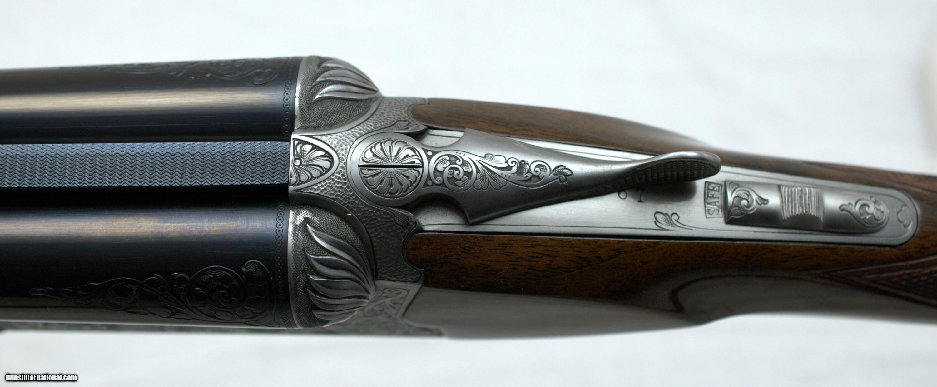 Description: BROWNING B SS 1 OF 100 20GA 26″ Barrels ... 3″ chambers ... Choked: MOD/IMP CYL ... LOP 14 1/8 ... DAH 2 1/2 ... DAC 1 1/2 ... Weight: 6 lb 8 oz ... Matted Rib ... German Silver front bead ... single selective trigger ... auto ejectors ... auto safety PROVENANCE: The Estate of B.E. “Andy” Anderson. CONDITION: Exceptionally fine, near new. Assembled in Korea, from Japanese parts, finished and engraved in Belgium. Full length matted rib with German Silver front bead. Breech end lightly scroll engraved. Gold plated single selective trigger, automatic ejectors, automatic safety. Receiver nicely engraved with flying ducks in game scene on both right and left side, surrounded by scroll. Flying duck in marsh scene on bottom, also surrounded by scroll. Top lever and trigger guard lightly scroll engraved. Trigger guard tang marked “ONE OF ONE HUNDRED”. Barrel fences are deeply carved with floral petals. Retaining nearly all factory finishes to both wood and metal. Mechanics are excellent. Brilliant shiny bores. Straight grained fiddle back walnut stock with 14-1/8″ LOP over Browning black plastic buttplate. Buttstock checkered in 2-point pattern with mullered border. Beavertail forend with Deeley release, checkered with 2-point pattern on sides. Cased in Browning beige wool lined case with instruction manual. Case is excellent with a few minor scuffs. Call with any questions and see our other listings for "Only the best!" SOLD |