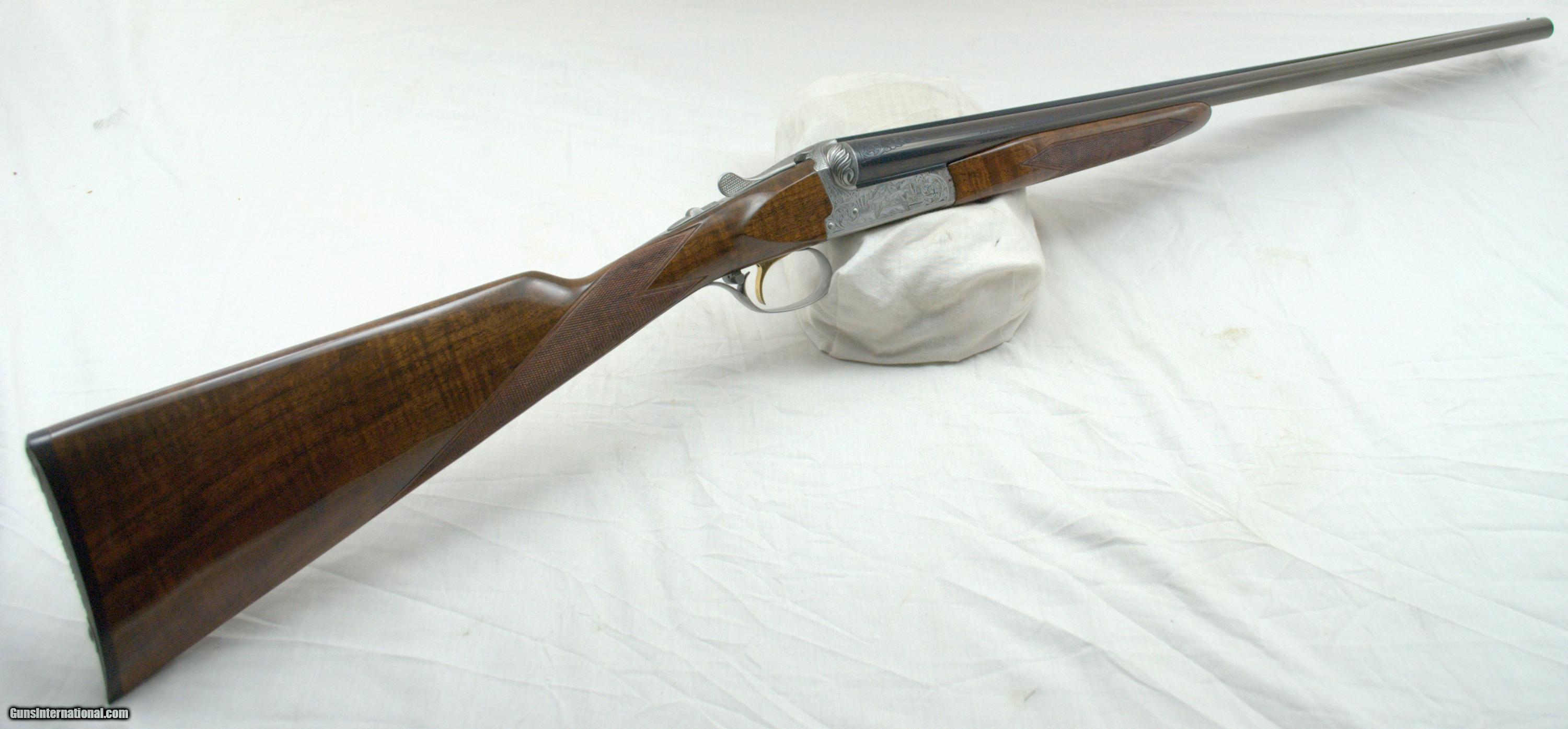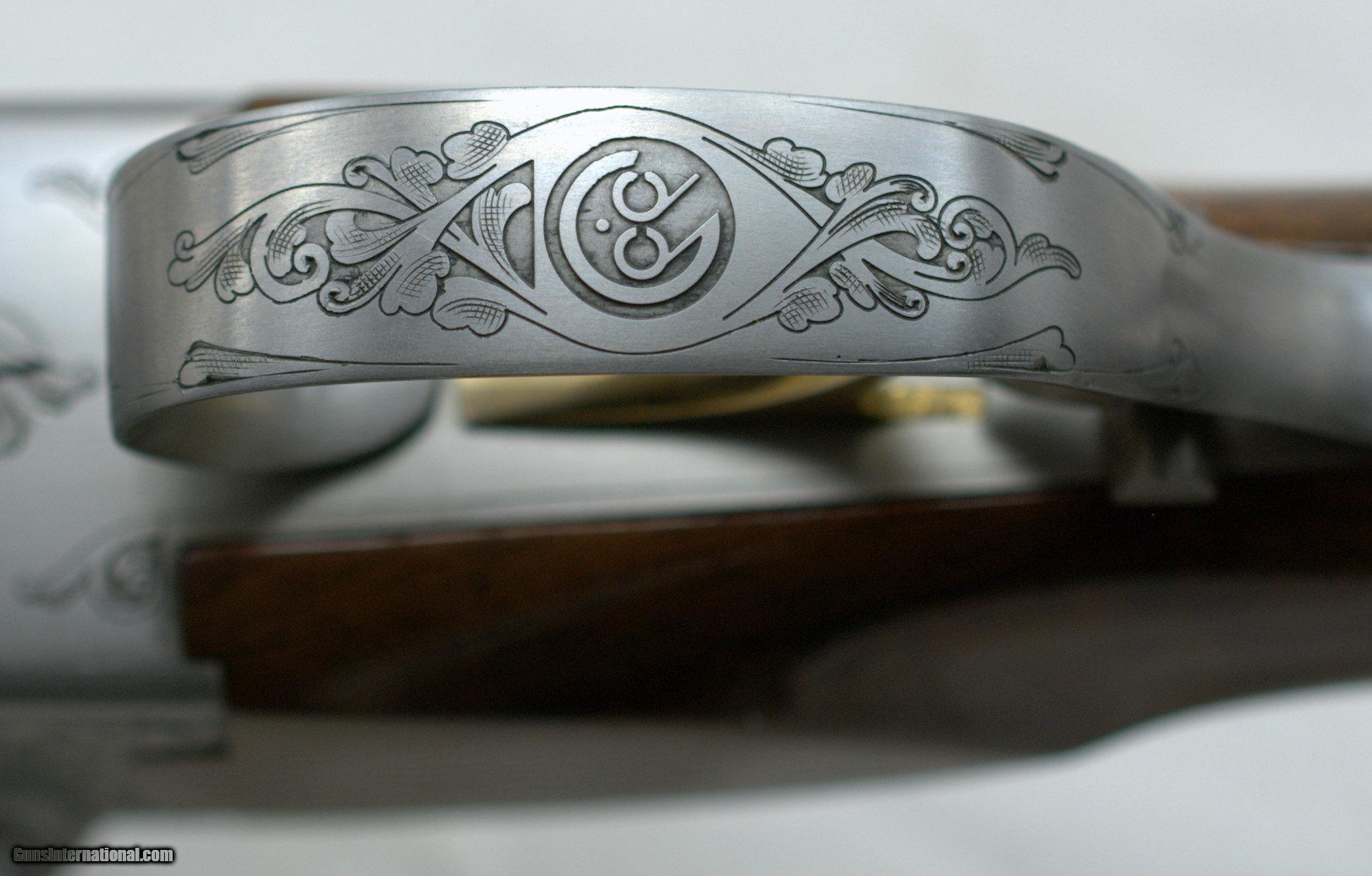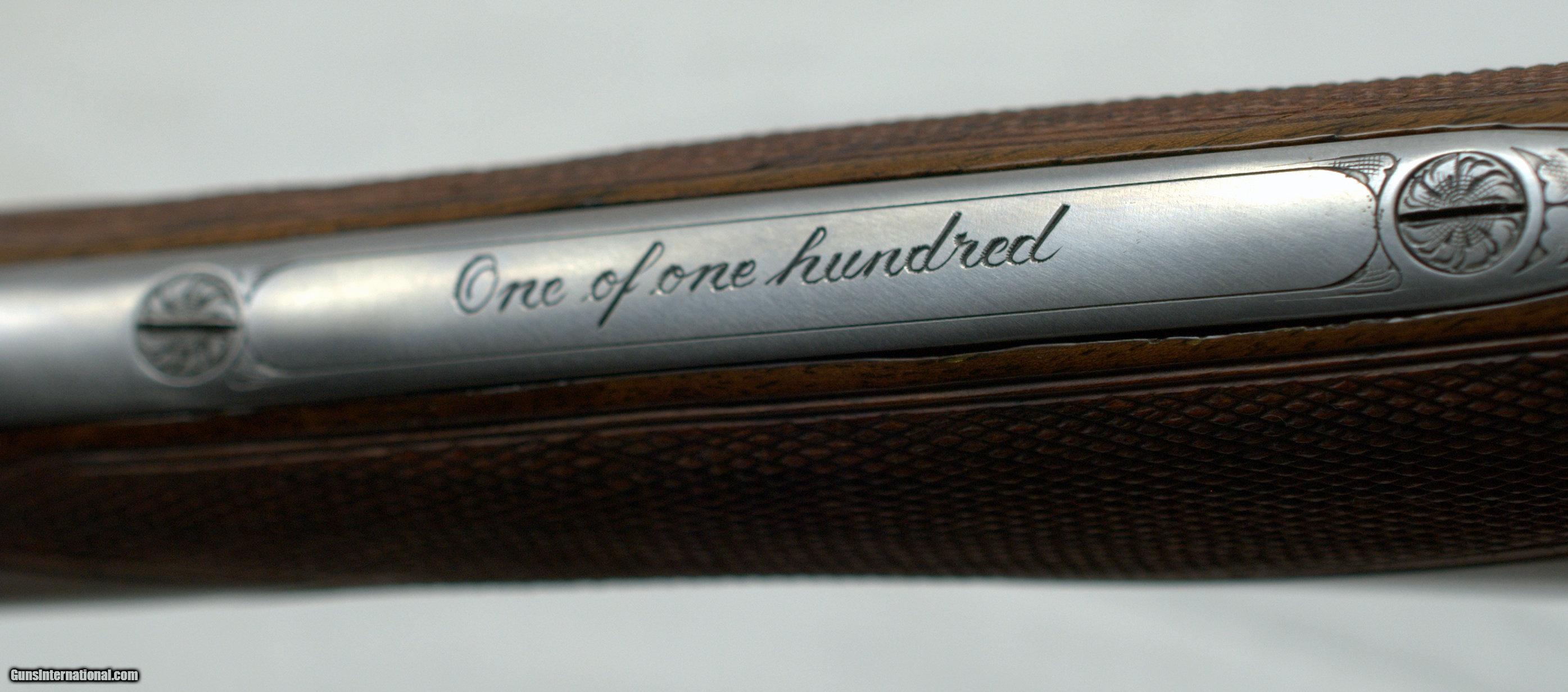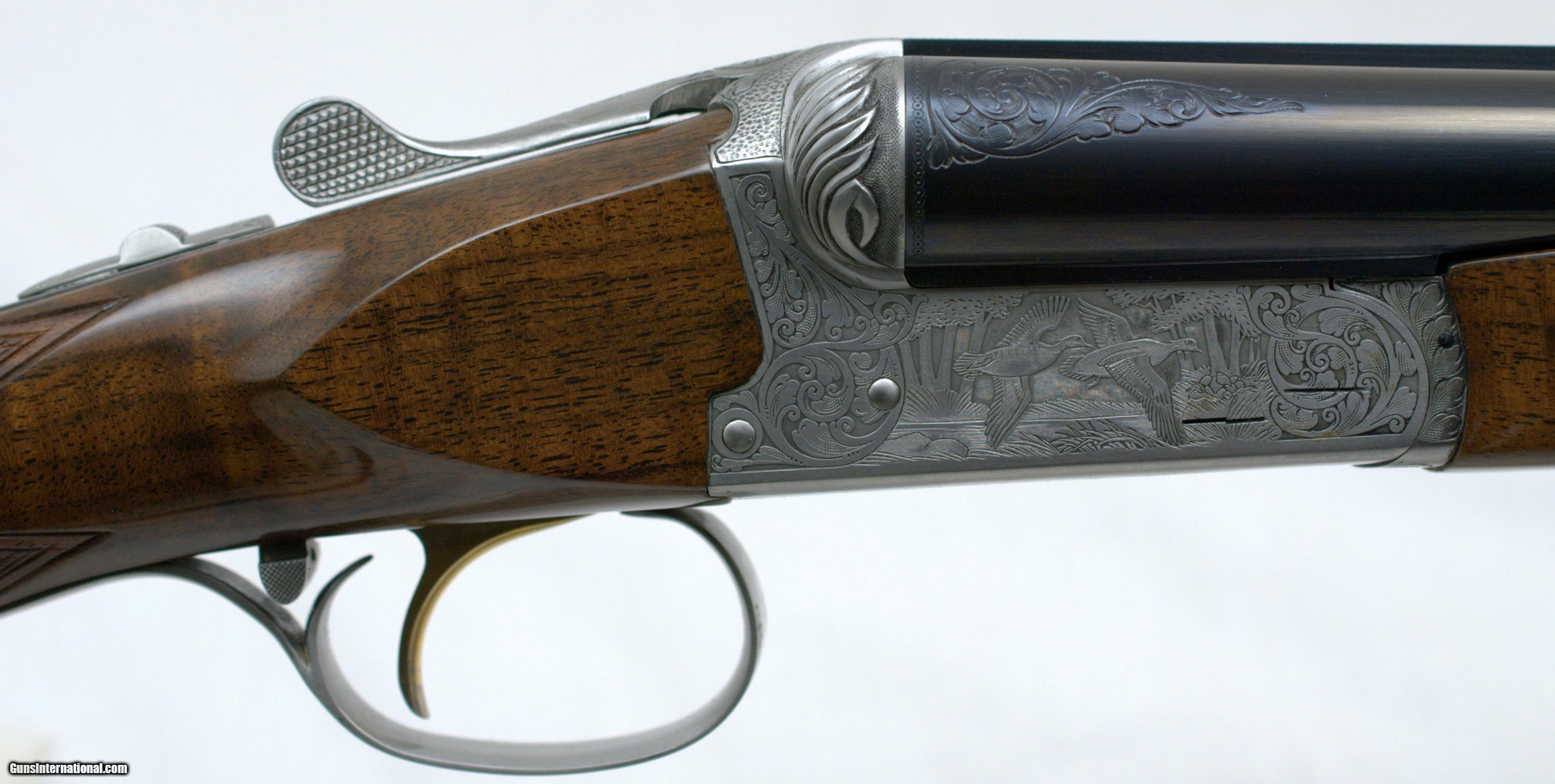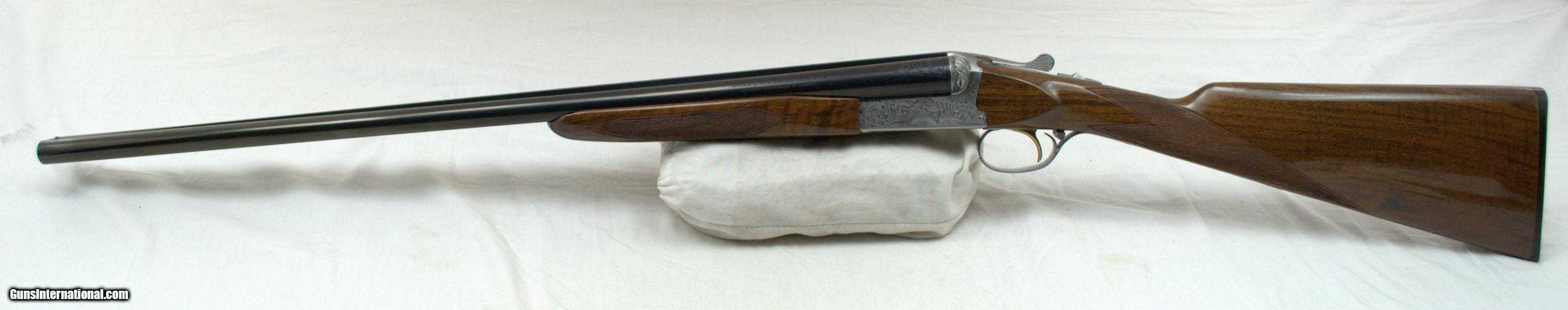Description: BROWNING B SS 1 OF 100 20GA 26″ Barrels ... 3″ chambers ... Choked: MOD/IMP CYL ... LOP 14 1/8 ... DAH 2 1/2 ... DAC 1 1/2 ... Weight: 6 lb 8 oz ... Matted Rib ... German Silver front bead ... single selective trigger ... auto ejectors ... auto safety PROVENANCE: The Estate of B.E. “Andy” Anderson. CONDITION: Exceptionally fine, near new. Assembled in Korea, from Japanese parts, finished and engraved in Belgium. Full length matted rib with German Silver front bead. Breech end lightly scroll engraved. Gold plated single selective trigger, automatic ejectors, automatic safety. Receiver nicely engraved with flying ducks in game scene on both right and left side, surrounded by scroll. Flying duck in marsh scene on bottom, also surrounded by scroll. Top lever and trigger guard lightly scroll engraved. Trigger guard tang marked “ONE OF ONE HUNDRED”. Barrel fences are deeply carved with floral petals. Retaining nearly all factory finishes to both wood and metal. Mechanics are excellent. Brilliant shiny bores. Straight grained fiddle back walnut stock with 14-1/8″ LOP over Browning black plastic buttplate. Buttstock checkered in 2-point pattern with mullered border. Beavertail forend with Deeley release, checkered with 2-point pattern on sides. Cased in Browning beige wool lined case with instruction manual. Case is excellent with a few minor scuffs. Call with any questions and see our other listings for "Only the best!" SOLD |