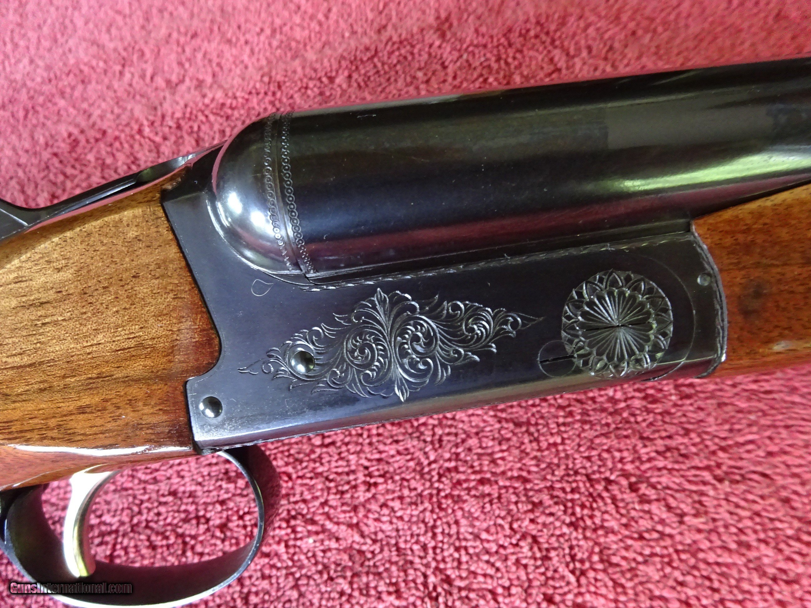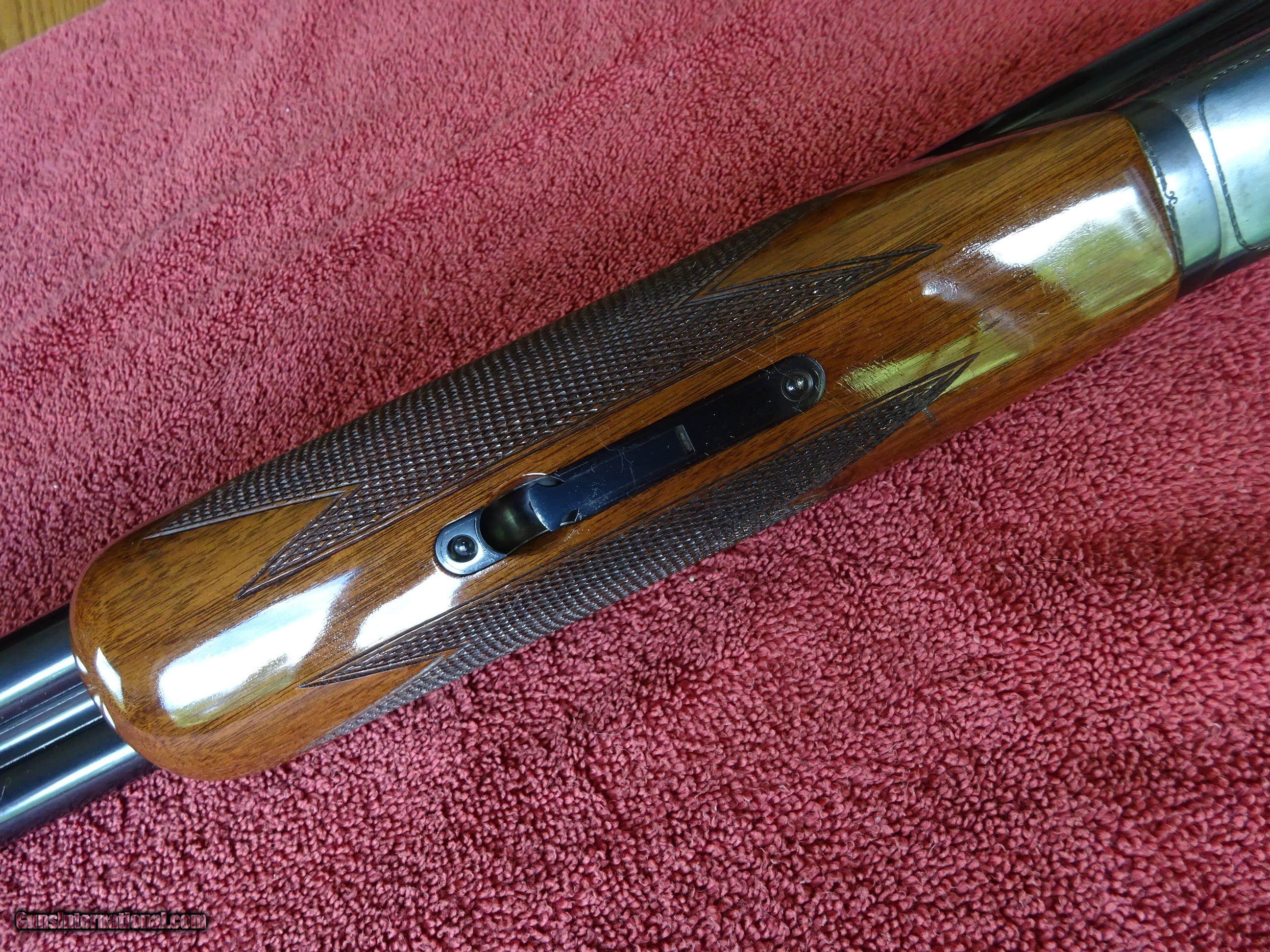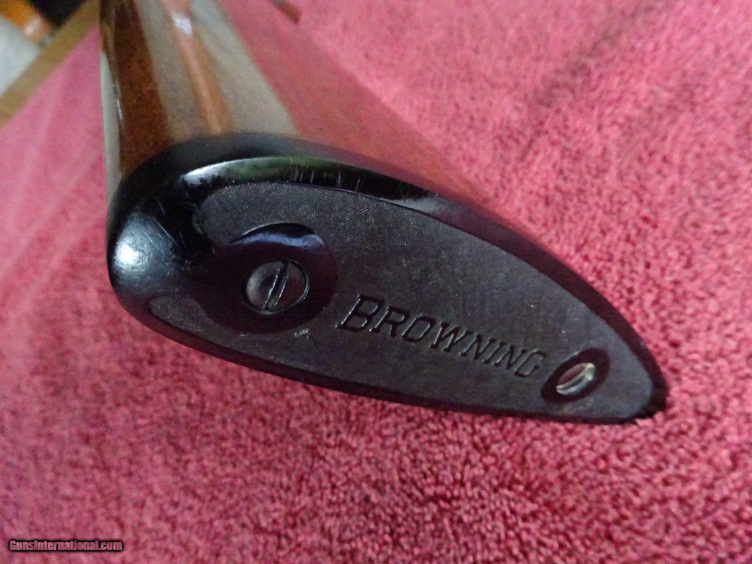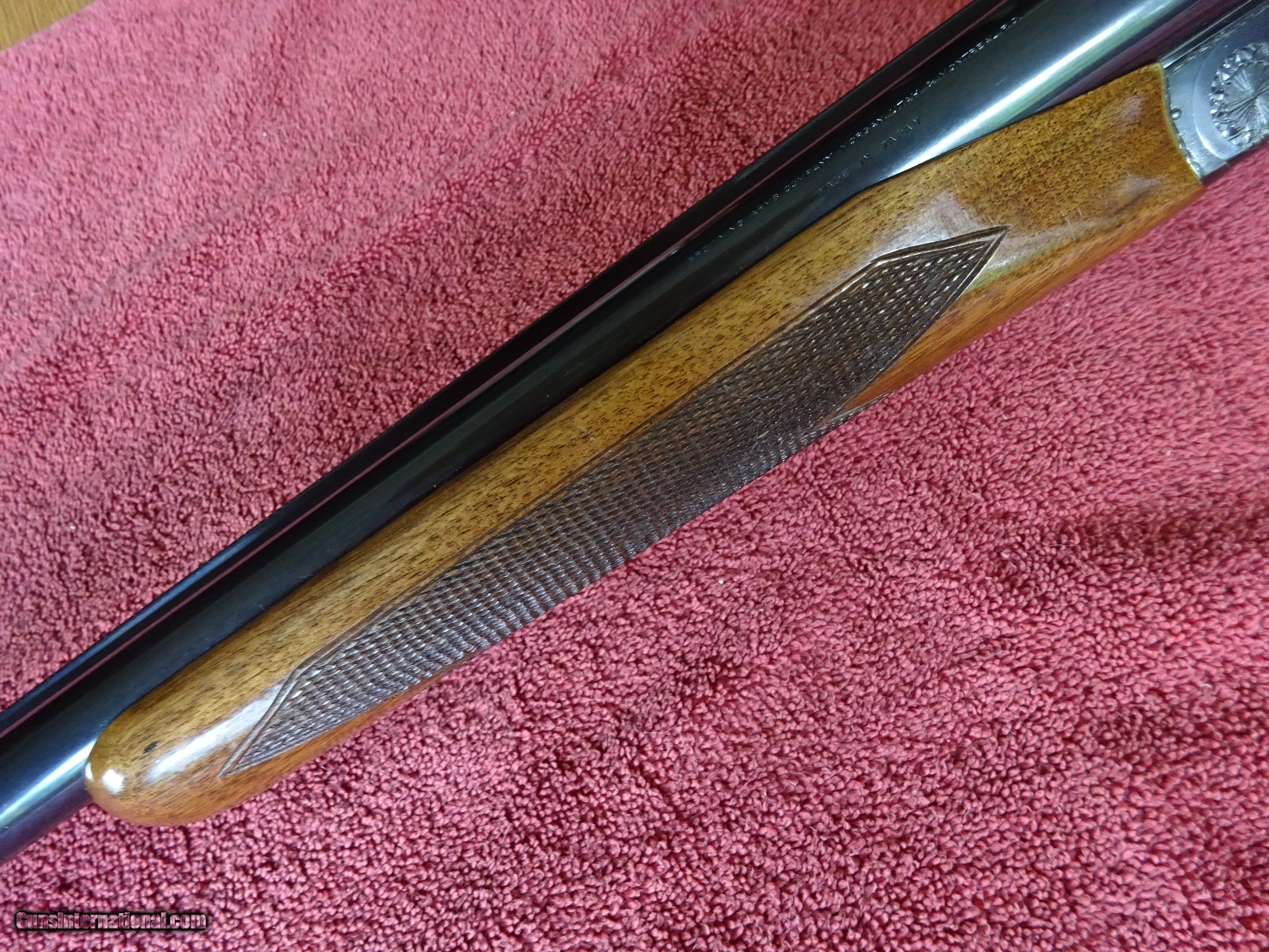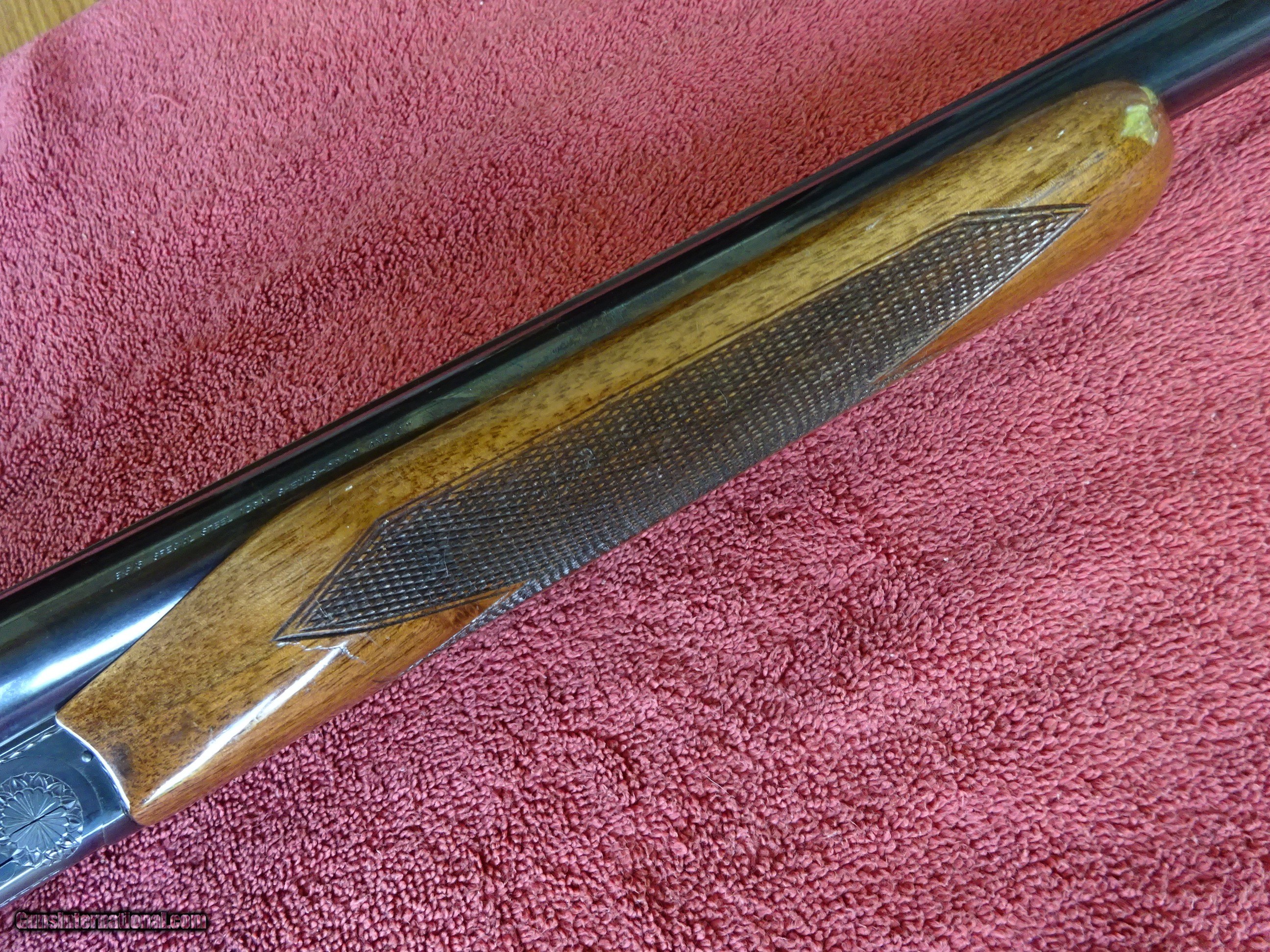 Description: BROWNING BSS 12 GAUGE, 28" BARRELS. MODIFIED AND FULL, MARKED "SPECIAL STEEL 2 3/4" AND 3" SHELLS". EXCELLENT BLUE, MIRROR PERFECT BORES, SINGLE BEAD SIGHT, AUTOMATIC EJECTORS. BOXLOCK FRAME WITH SCROLL ENGRAVING PATTERN, FINE BORDERS, ENGRAVED SCREWS, GOLD SINGLE SELECTIVE TRIGGER, AUTO-SAFETY, TOP LEVER TO THE FAR RIGHT, TIGHT ON FACE. APPEARS TO BE SHOT VERY LITTLE, STILL STIFF TO OPEN AND CLOSE. PISTOL GRIP STOCK, BEAVERTAIL FOREARM. EXCELLENT WOOD AND CHECKERING, NORMAL HANDLING MARKS IN THE VARNISH. BROWNING MARKED BAKELITE BUTTPLATE, EARLY EXAMPLE. MARKED MADE IN JAPAN, 1 1/2" X 2 1/2" X 14 1/4", 7 POUNDS 13 OUNCES. MADE 1971 TO 1988 BY MIROKU. 100% ORIGINAL CONDITION. $1575.00 + $70.00 Insured shipping to an FFL address. Layaway is available. See all Pats gun listings on this site! We also have hundreds of ORIGINAL gun company advertising & memorabilia pieces available for sale on our site SPORTINGCOLLECTIBLES. We have no reprints or reproductions. Email for more information. If you need to call, morning or evening is best, and please note the Seller's Inventory number. SOLD |