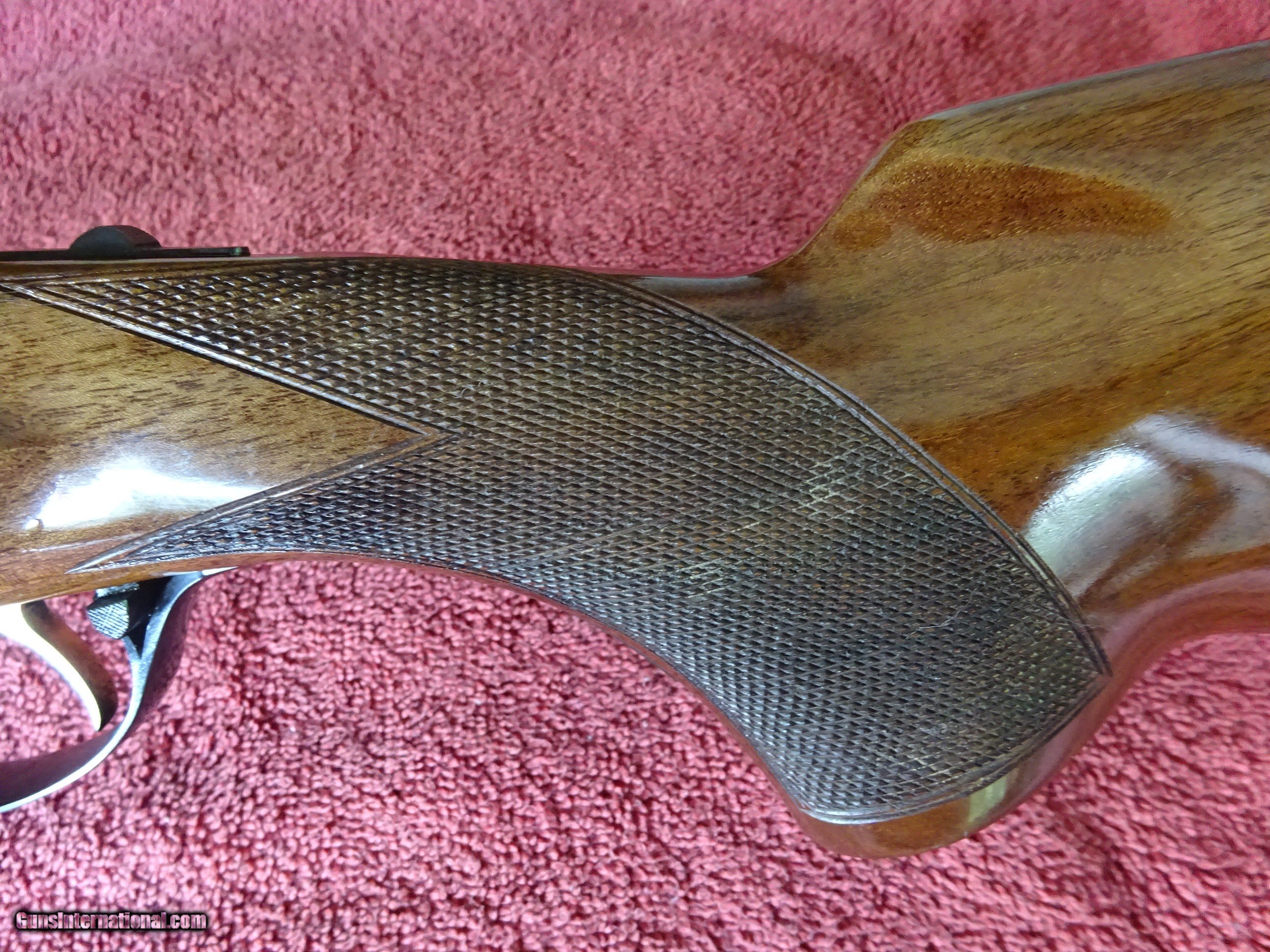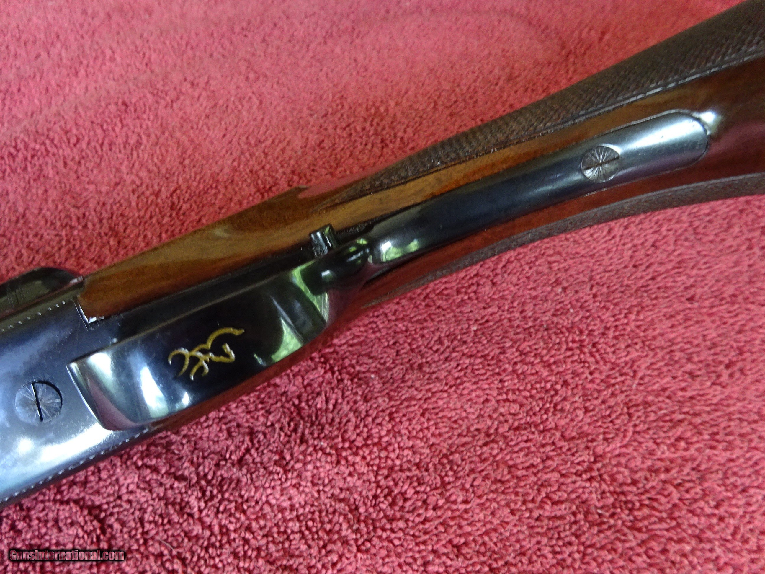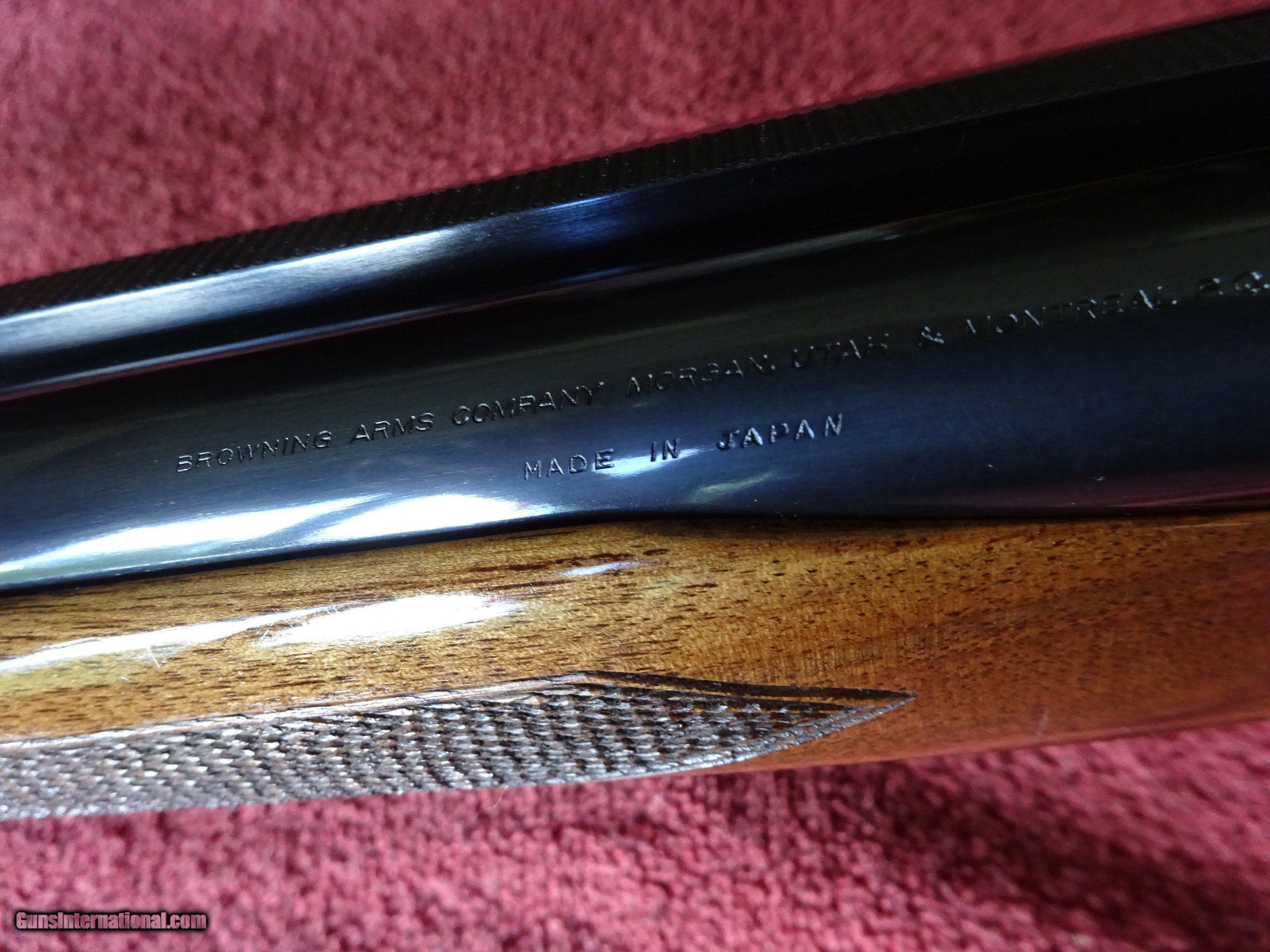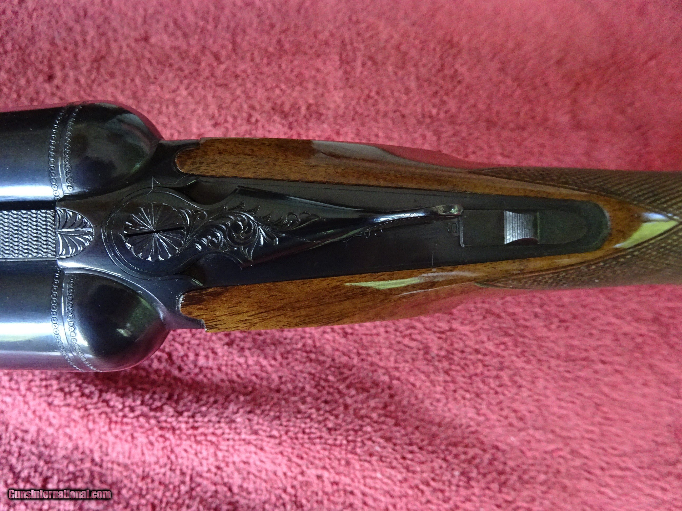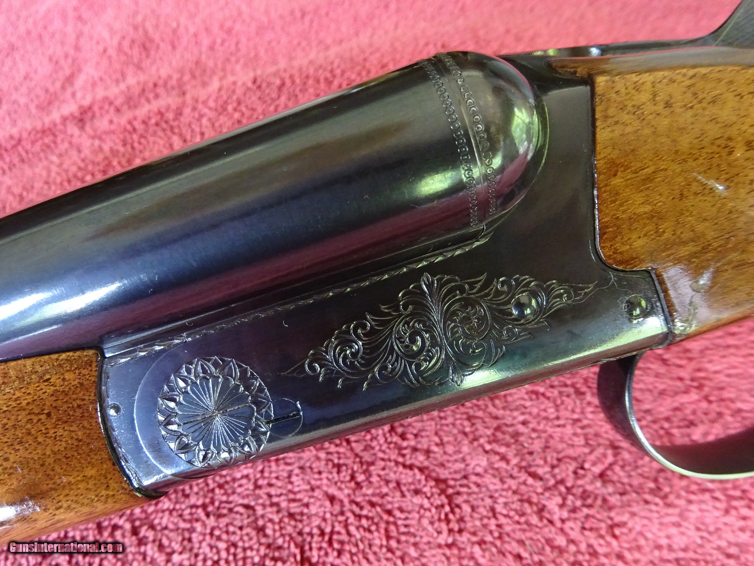 Description: BROWNING BSS 12 GAUGE, 28" BARRELS. MODIFIED AND FULL, MARKED "SPECIAL STEEL 2 3/4" AND 3" SHELLS". EXCELLENT BLUE, MIRROR PERFECT BORES, SINGLE BEAD SIGHT, AUTOMATIC EJECTORS. BOXLOCK FRAME WITH SCROLL ENGRAVING PATTERN, FINE BORDERS, ENGRAVED SCREWS, GOLD SINGLE SELECTIVE TRIGGER, AUTO-SAFETY, TOP LEVER TO THE FAR RIGHT, TIGHT ON FACE. APPEARS TO BE SHOT VERY LITTLE, STILL STIFF TO OPEN AND CLOSE. PISTOL GRIP STOCK, BEAVERTAIL FOREARM. EXCELLENT WOOD AND CHECKERING, NORMAL HANDLING MARKS IN THE VARNISH. BROWNING MARKED BAKELITE BUTTPLATE, EARLY EXAMPLE. MARKED MADE IN JAPAN, 1 1/2" X 2 1/2" X 14 1/4", 7 POUNDS 13 OUNCES. MADE 1971 TO 1988 BY MIROKU. 100% ORIGINAL CONDITION. $1575.00 + $70.00 Insured shipping to an FFL address. Layaway is available. See all Pats gun listings on this site! We also have hundreds of ORIGINAL gun company advertising & memorabilia pieces available for sale on our site SPORTINGCOLLECTIBLES. We have no reprints or reproductions. Email for more information. If you need to call, morning or evening is best, and please note the Seller's Inventory number. SOLD |