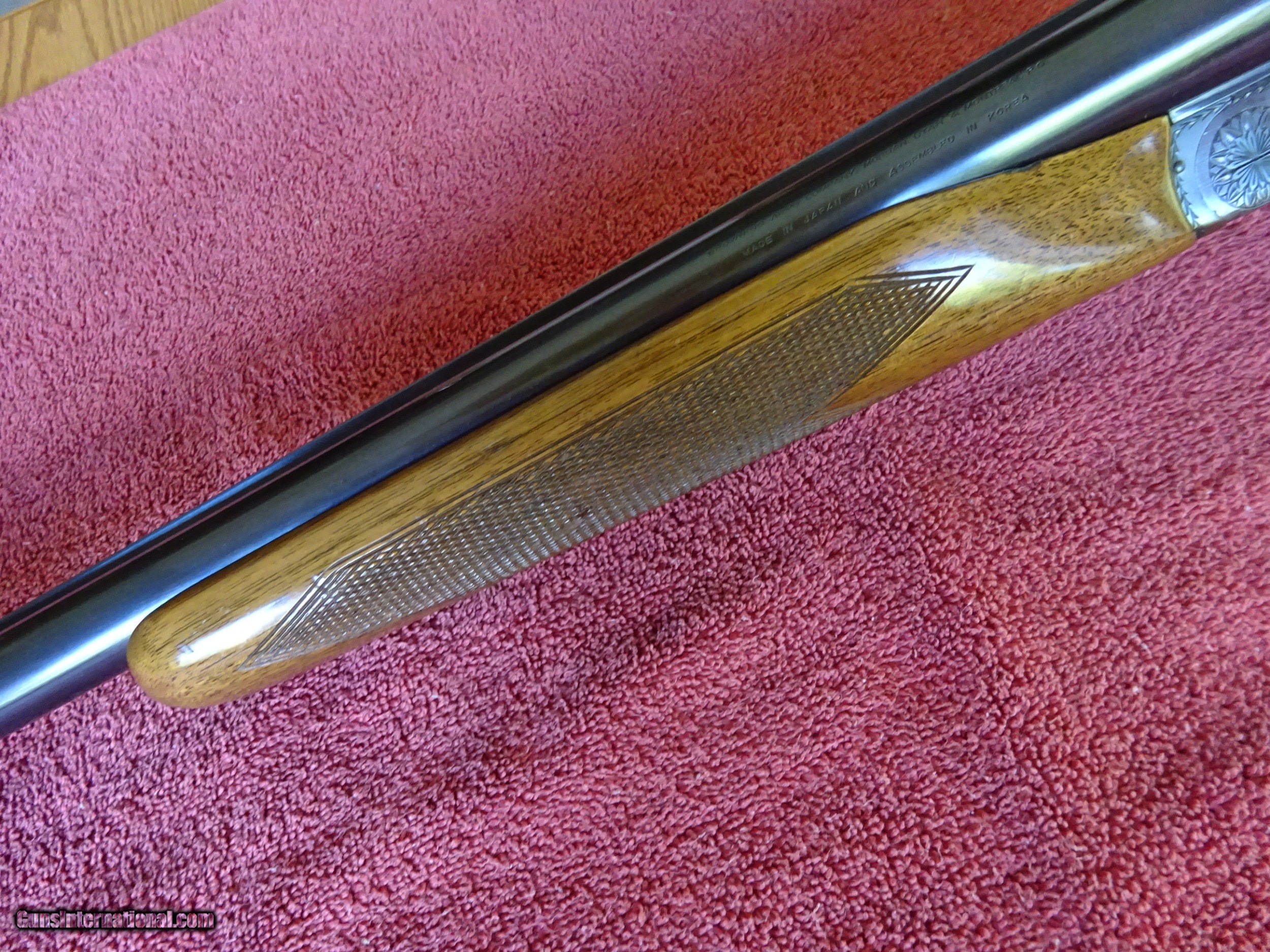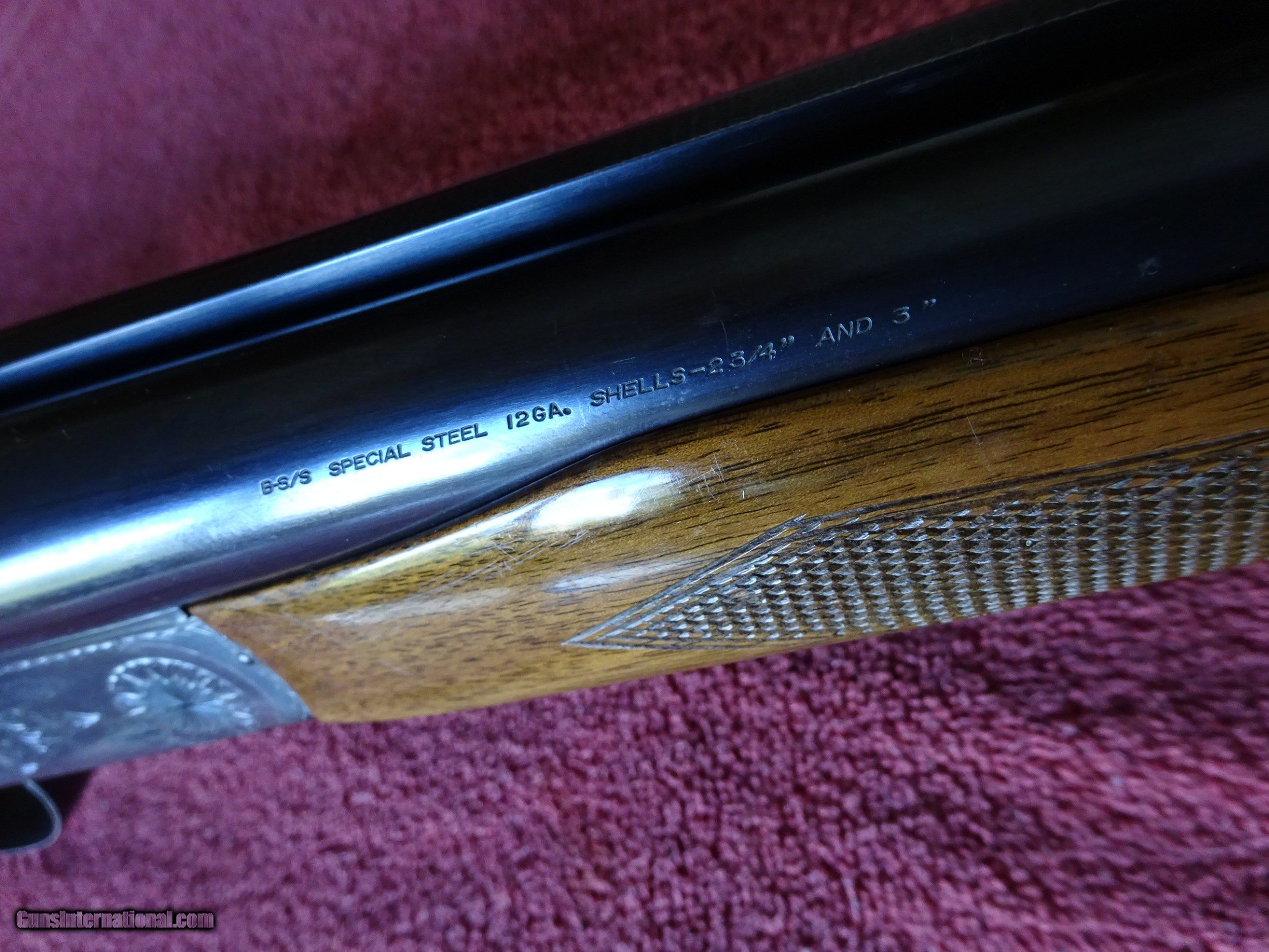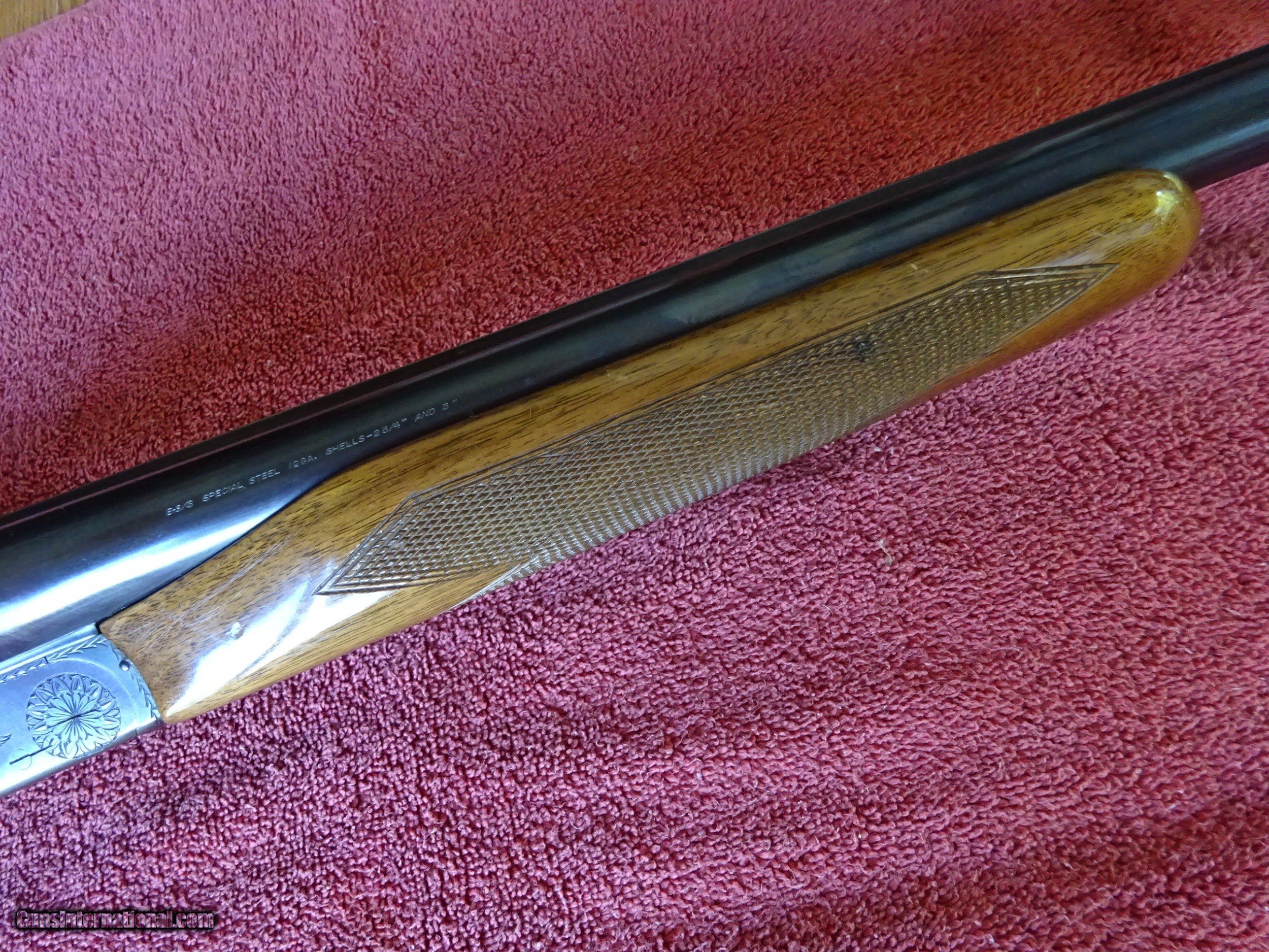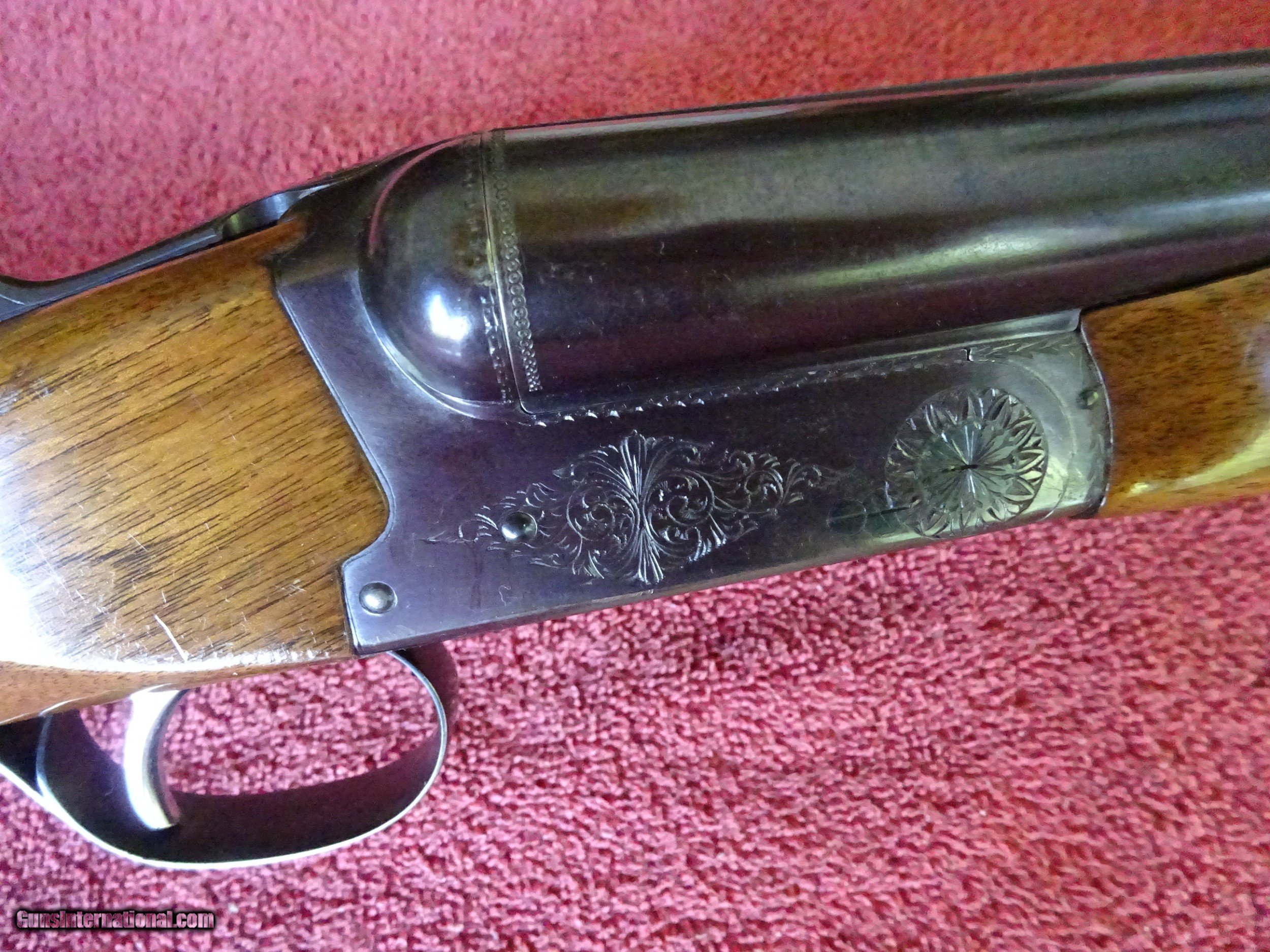Description: BROWNING BSS 12 GAUGE, 26" BARRELS. MODIFIED AND FULL, 3" CHAMBERS, MIRROR PERFECT BORES, BARRELS RING NICELY, VERY GOOD BLUE. STANDARD SCROLL ENGRAVING PATTERN, AUTOMATIC EJECTORS, SINGLE NON-SELECTIVE TRIGGER. PISTOL GRIP STOCK, BEAVERTAIL FOREARM, VERY GOOD WOOD WITH NORMAL HANDLING MARKS, SOME SCRATCHES IN THE VARNISH, 1 1/2" X 2 1/4" X 14 1/4", 7 POUNDS 6 OUNCES. TOP LEVER TO THE RIGHT, TIGHT ON FACE. $1275.00 + $50.00 Insured shipping to an FFL address. See all Pats gun listings on this site! We also have hundreds of pieces of ORIGINAL gun company advertising & memorabilia available for sale on our site SPORTINGCOLLECTIBLES. We have no reprints or reproductions. Email for more information. SOLD |