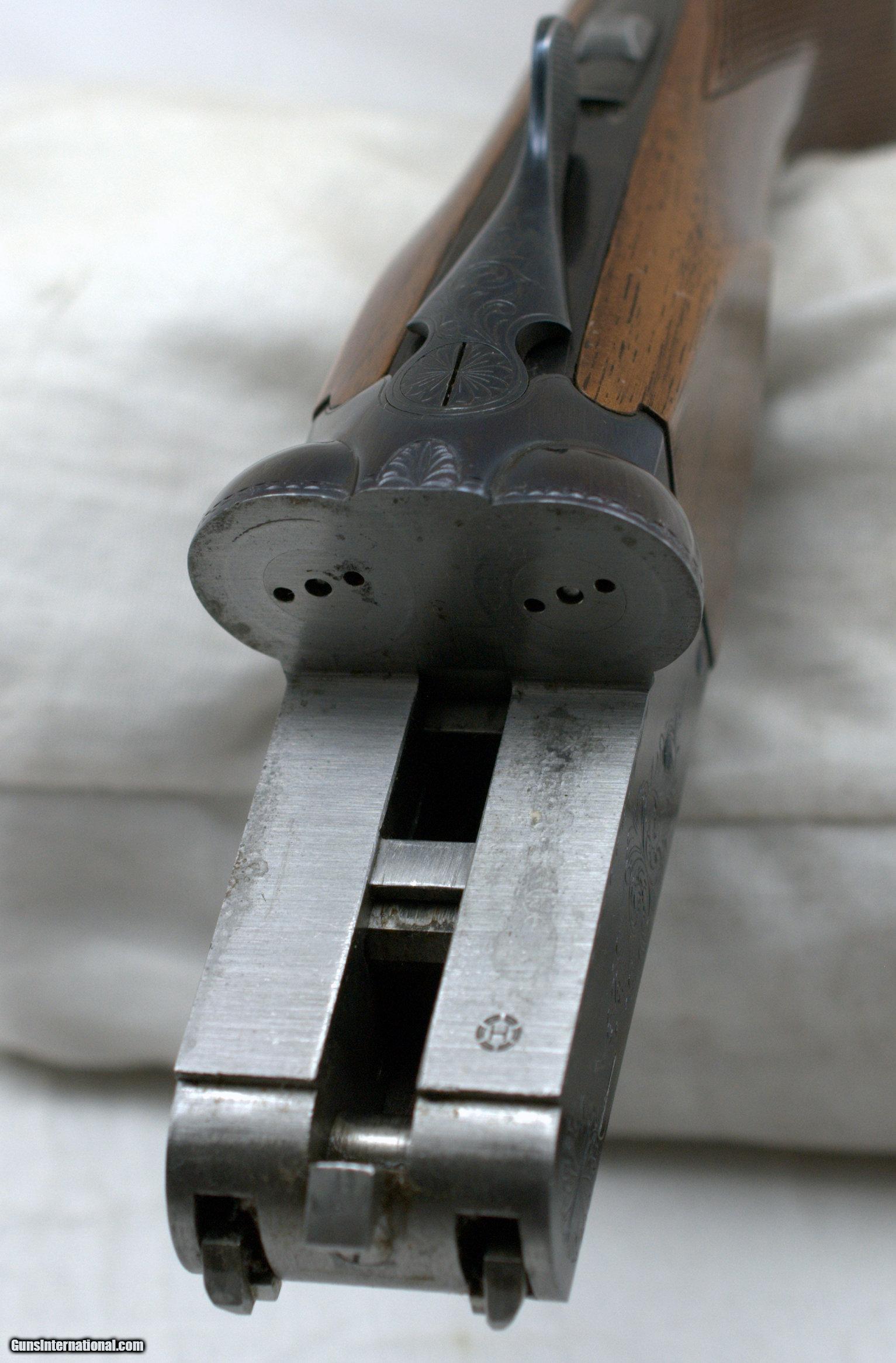 Description: BROWNING B SS GRADE 1 20 GA 28″ bbls. 3″ chambers. Choked IC/Skeet (marked full and mod) ... LOP 14 1/4 ... DAH 2 1/2 ... DAC 1 5/8 ... Weight 7lbs ... Single selective trigger ... auto ejectors ... auto safety ... Matted rib ... Steel bead ... Box not numberd to gun PROVENANCE: The Estate of B.E. “Andy” Anderson. CONDITION: 1) Very good. Light handling marks and scratches throughout. Engraved in standard Grade 1 pattern, with light scroll on sides, top and trigger guard. Full length matted rib with white plastic front bead and steel mid bead. Nickel plated single selective trigger, automatic ejectors, automatic safety. Mechanics are excellent. Bores are bright and shiny. Retains 95-98% orig finish to wood & metal. Full knob pistol grip stock checkered in classic 2-point pattern with 14-1/4″ LOP over Browning black plastic buttplate. Beavertail forend with Deeley release, checkered in 2-point pattern on sides. Contained in a Browning shipping box not numbered to this gun. Also in box is an unused Browning end label. Box is excellent. SOLD |