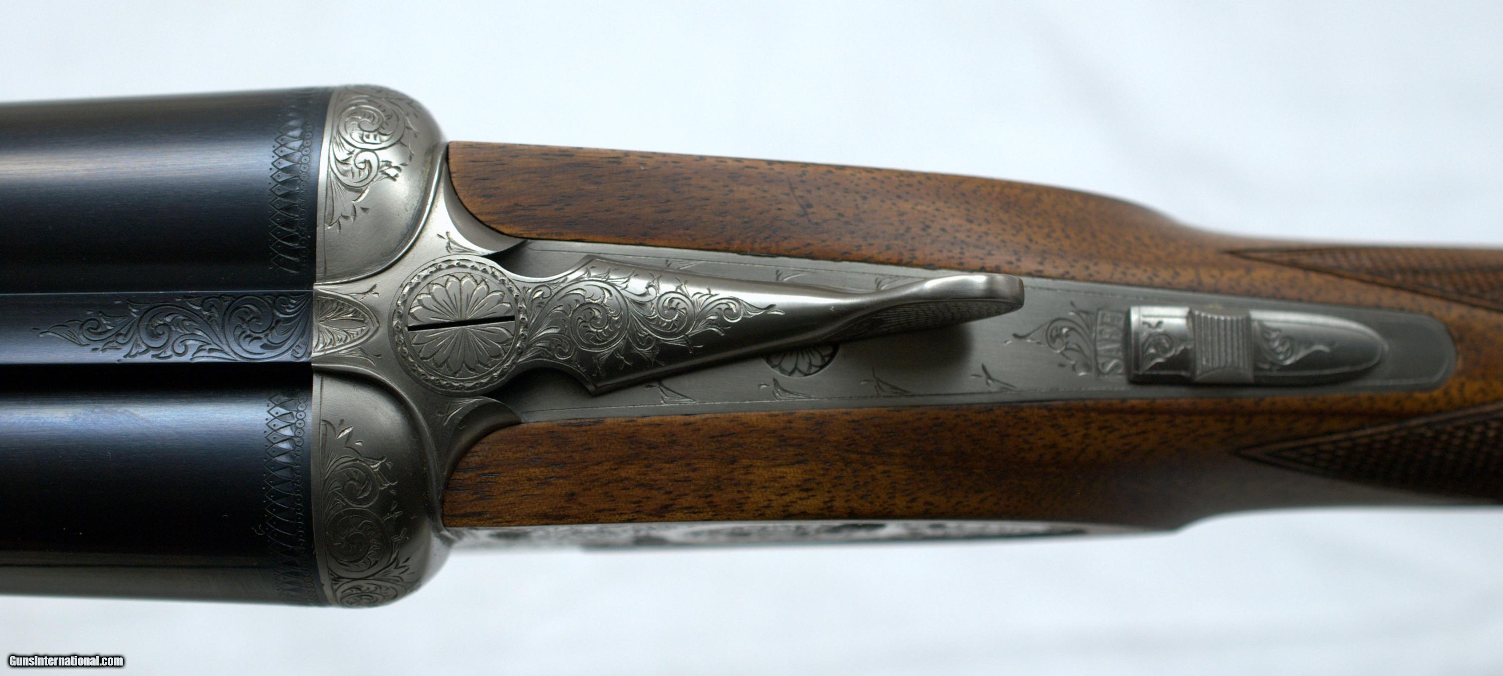 Description: BROWNING B SS SIDELOCK 12GA 26″ Barrels ... 2-3/4″ chambers ... Choked: IMP CYL/MOD .. LOP 14 5/16 ... DAH 2 3/8 ... DAC 1 5/8 ... Weight: 6 lb 7 oz ... Plain rib ... Steel bead ... Double triggers ... auto safety ... auto ejectors PROVENANCE: The Estate of B.E. “Andy” Anderson. CONDITION: Extraordinarily fine, near new, . Full length plain steel rib with steel front bead and light scroll engraving at breech end. Double triggers, automatic ejectors, automatic safety. Receiver is lightly scroll and floral engraved, as is trigger guard bow and top lever. The gun retains virtually all of its original factory finishes to wood and metal with minute handling marks throughout. Likely test fired only. Mechanics are excellent. Brilliant shiny bore. Made in Japan. Date code 1983. Buttstock checkered in 3-point pattern. Splinter forend with Curtis release, checkered in 3-point pattern. Straight grip walnut stock with silver oval with 14-5/16″ LOP over skip line checkered butt. Accompanied by a dark brown Browning wool lined case. Case is excellent with a few light handling marks and scuffs. Call with any questions and see our other listings for "Only the best!" SOLD |