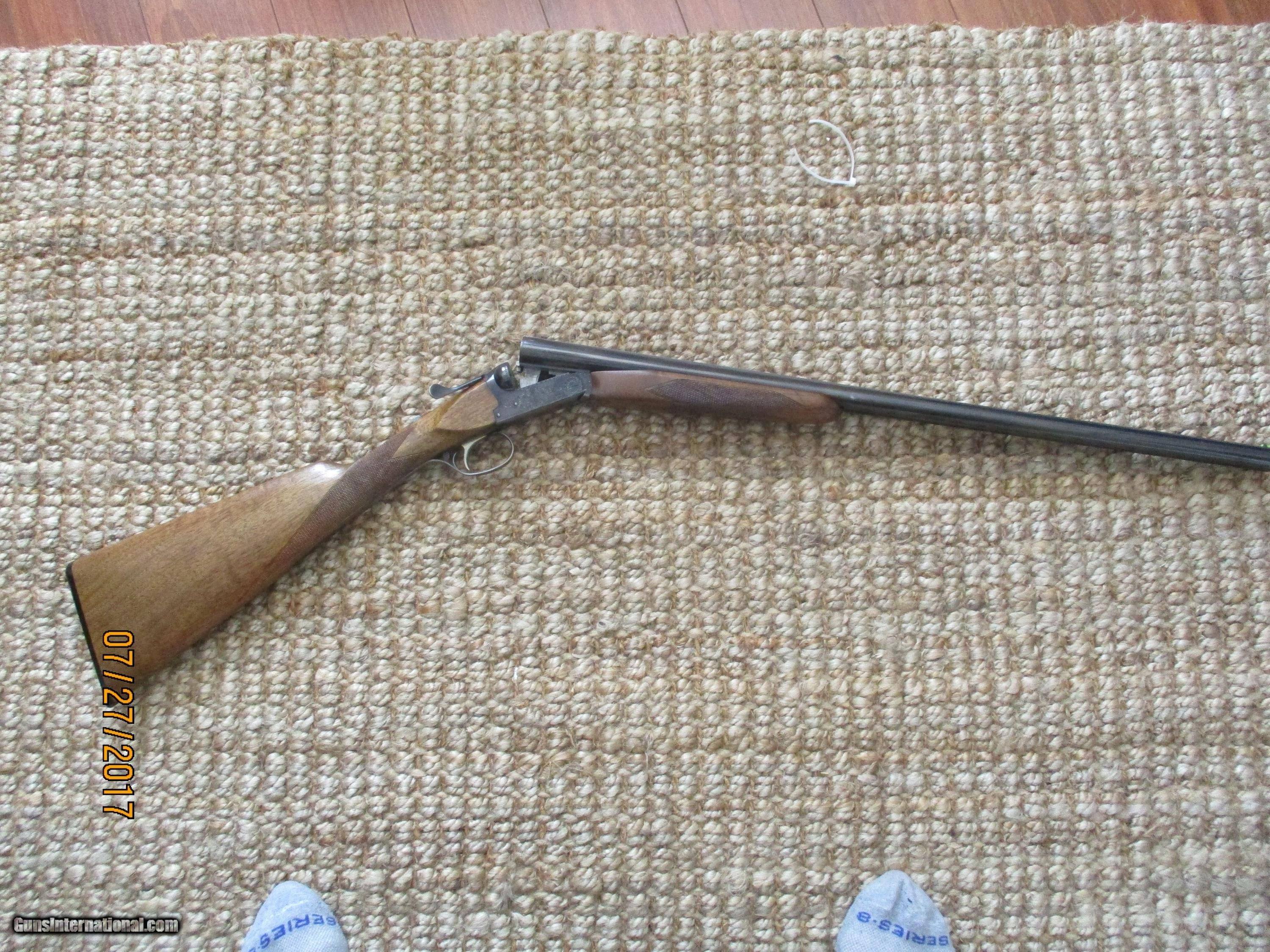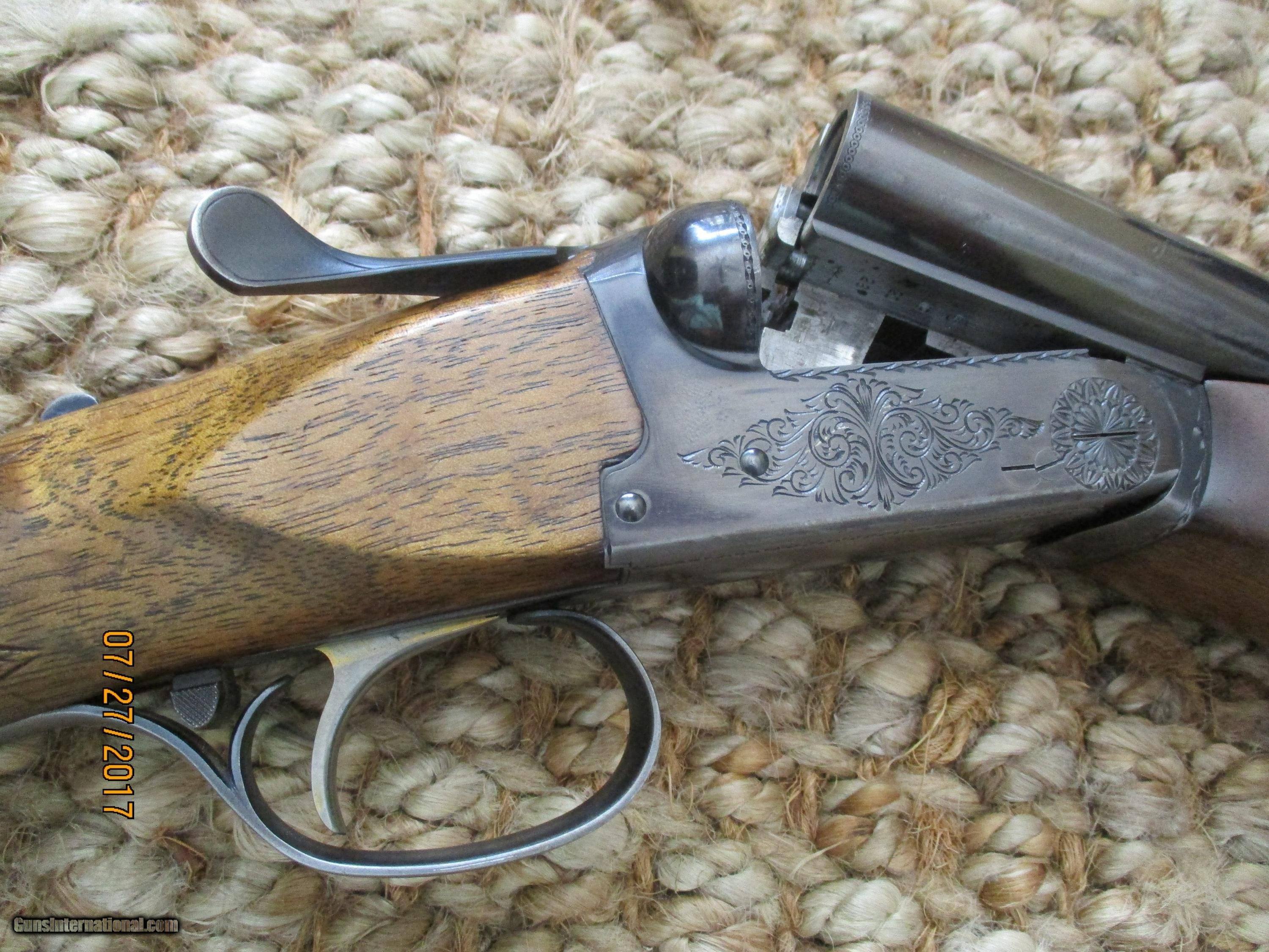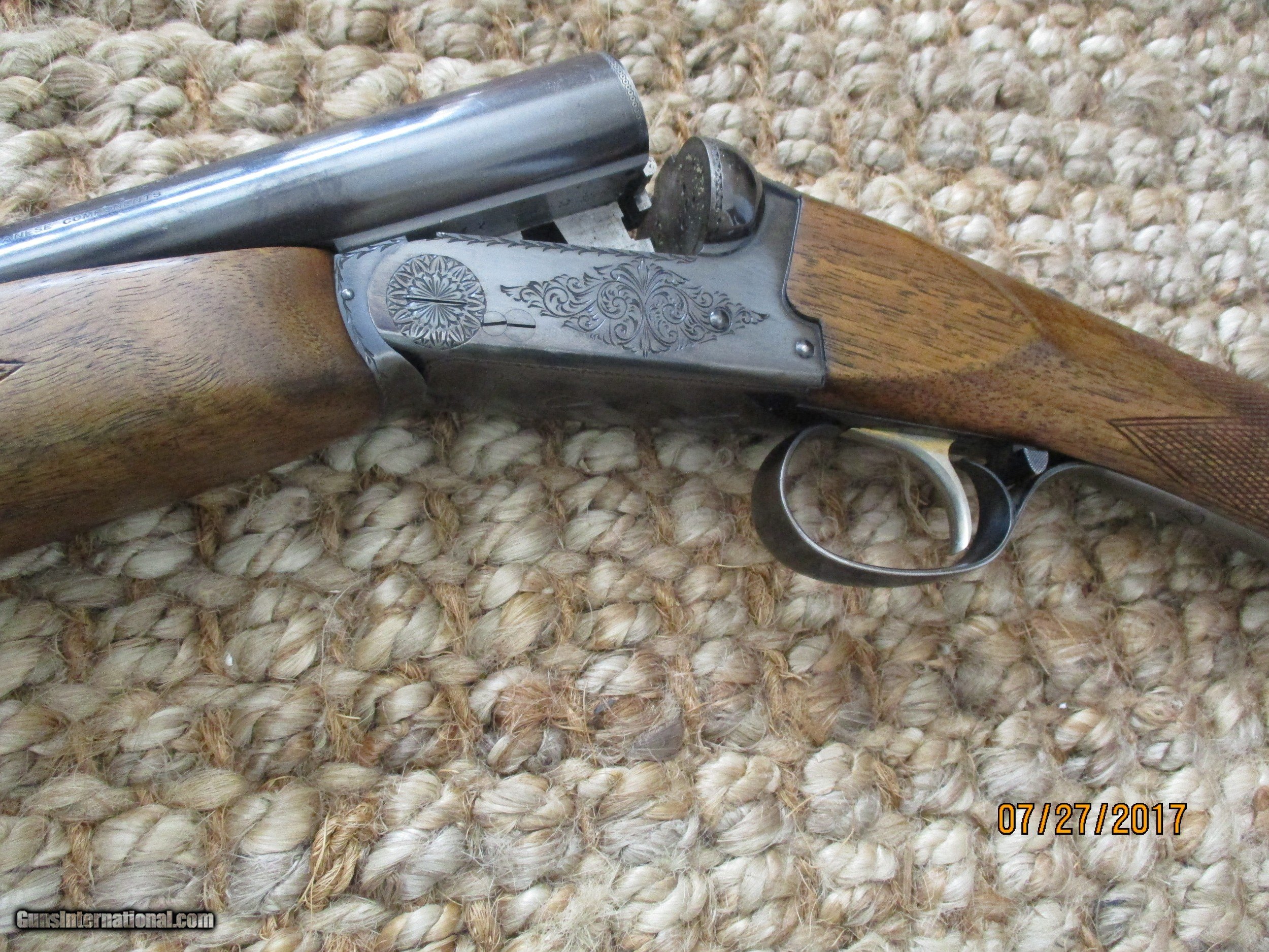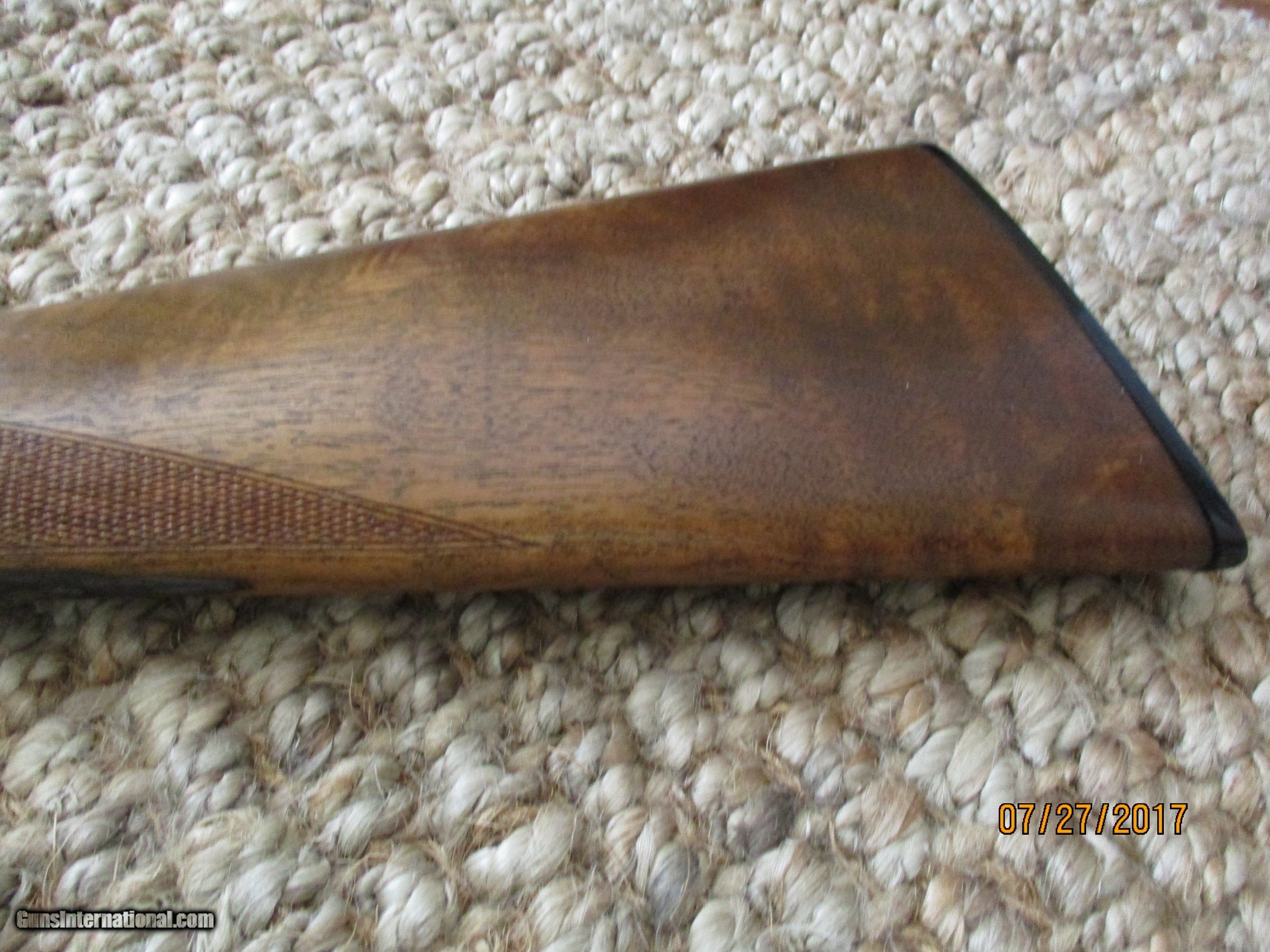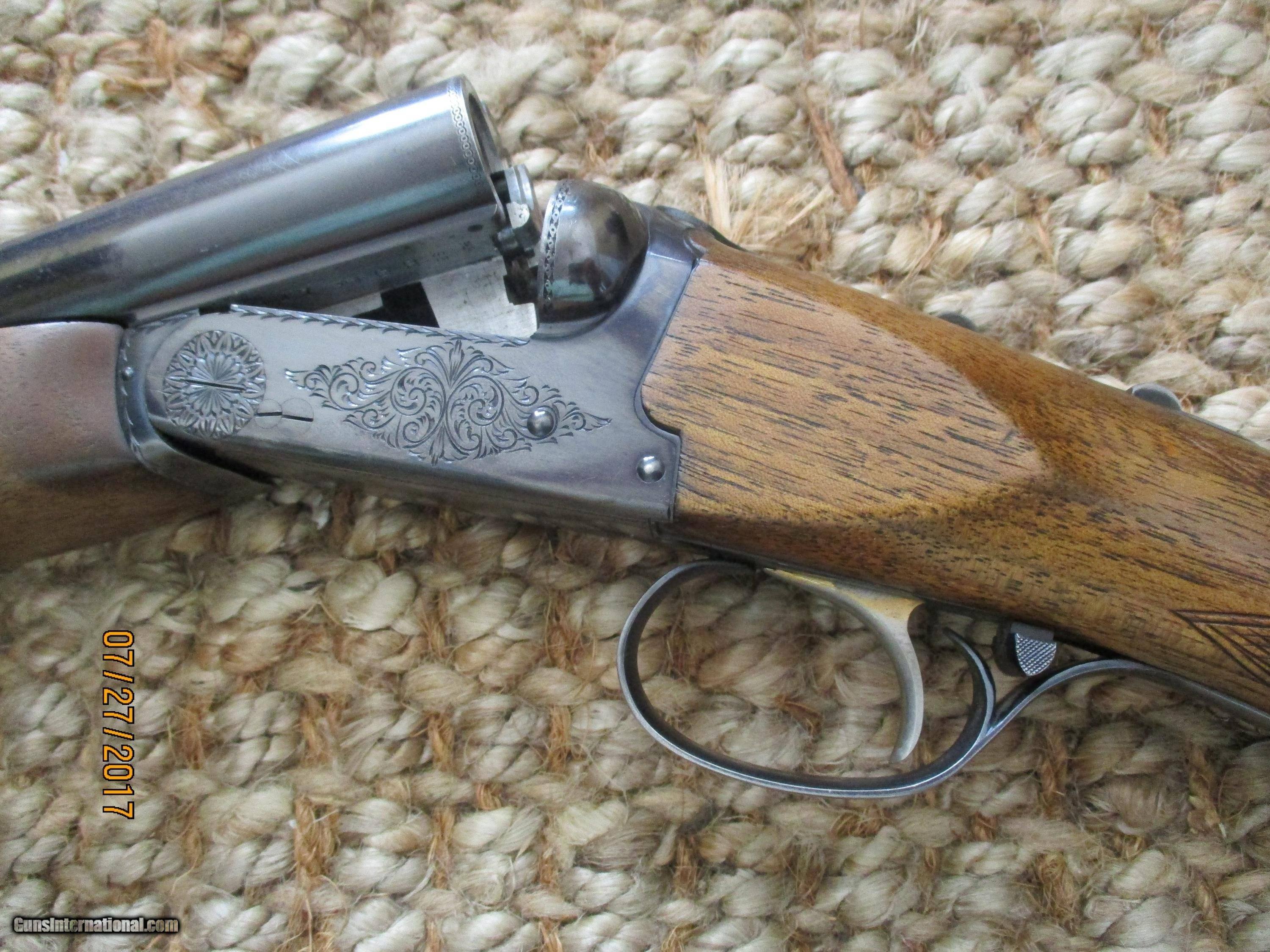 Description: 26" SR, IC/M, Browning style engraved receiver, single select trigger, ejectors, English style straight checkered oil finished hand checkered walnut stock, beavertail forearm, 14 1/4" LOP over factory buttplate, factory buttplate, 6 lbs.,98%, shot little only! SOLD |