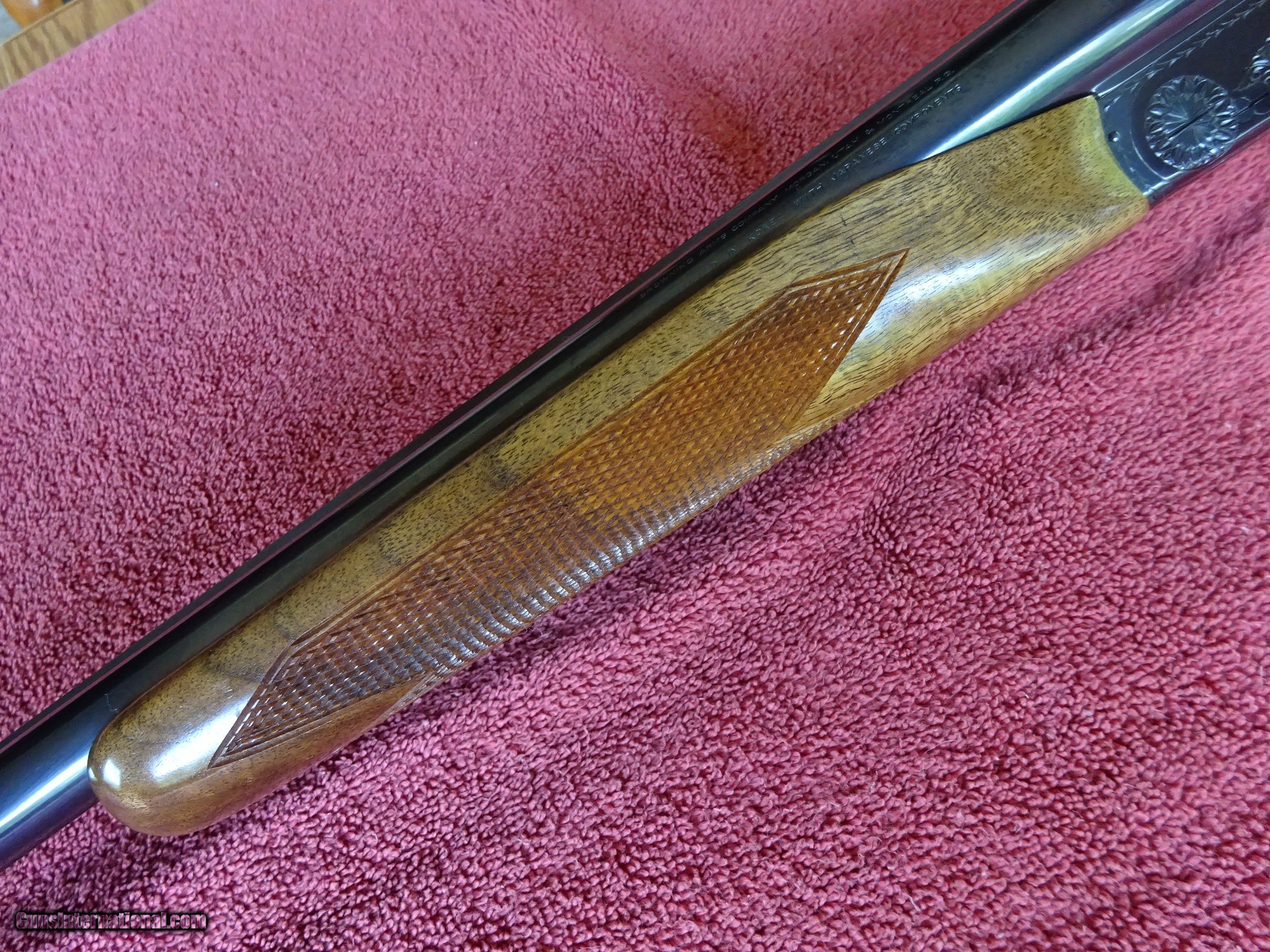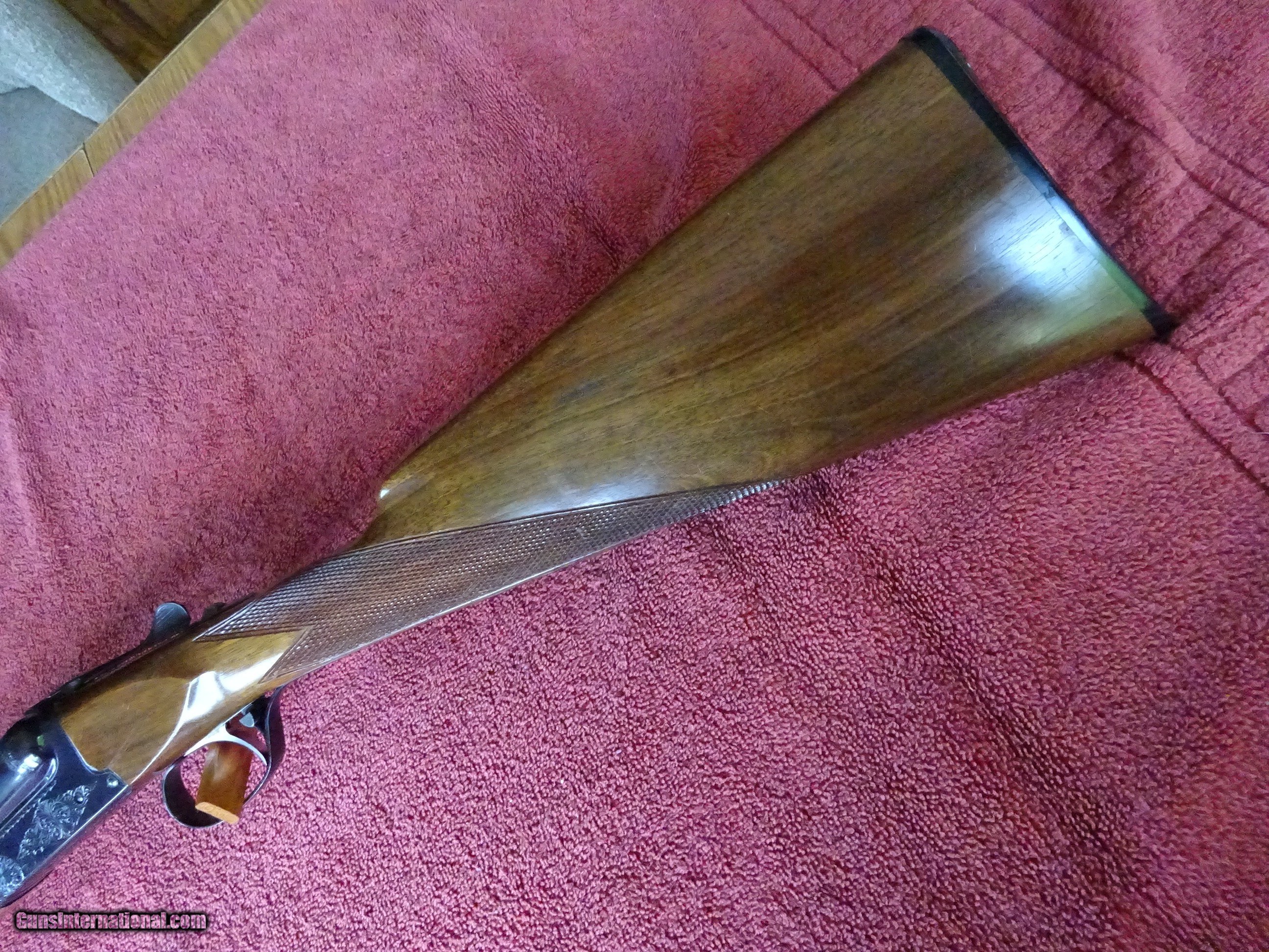 Description: BROWNING BSS SPORTER, 20 GAUGE. 28" BARRELS, MODIFIED (.020) AND FULL (.035), 3" CHAMBERS, AUTOMATIC EJECTORS, SINGLE SELECTIVE TRIGGER, AUTO SAFETY, 100% BRIGHT BLUE, NO WEAR ON ANY METAL SURFACE. MIRROR PERFECT BORES, SINGLE BEAD SIGHT. BOXLOCK FRAME WITH SCROLL ENGRAVING PATTERN, FINE LINE BORDERS, ENGRAVED SCREWS. THE TOP LEVER TO THE FAR RIGHT, STILL STIFF TO OPEN AND CLOSE. STRAIGHT GRIP STOCK, BEAVERTAIL FOREARM, EXCELLENT WOOD AND CHECKERING. ORIGINAL BROWNING MARKED BUTTPLATE, 1 1/2" X 2 1/4" X 14 1/4", 6 POUNDS 13 OUNCES. 100% ORIGINAL CONDITION, NICE GUN MADE 1971 - 1988. $2350.00 + $70.00 Insured shipping to an FFL address. Layaway is available. See all Pats gun listings on this site! We also have hundreds of ORIGINAL gun company advertising & memorabilia pieces available for sale on our site SPORTINGCOLLECTIBLES. We have no reprints or reproductions. Email for more information. If you need to call, morning or evening is best, and please note the Seller's Inventory number. SOLD |