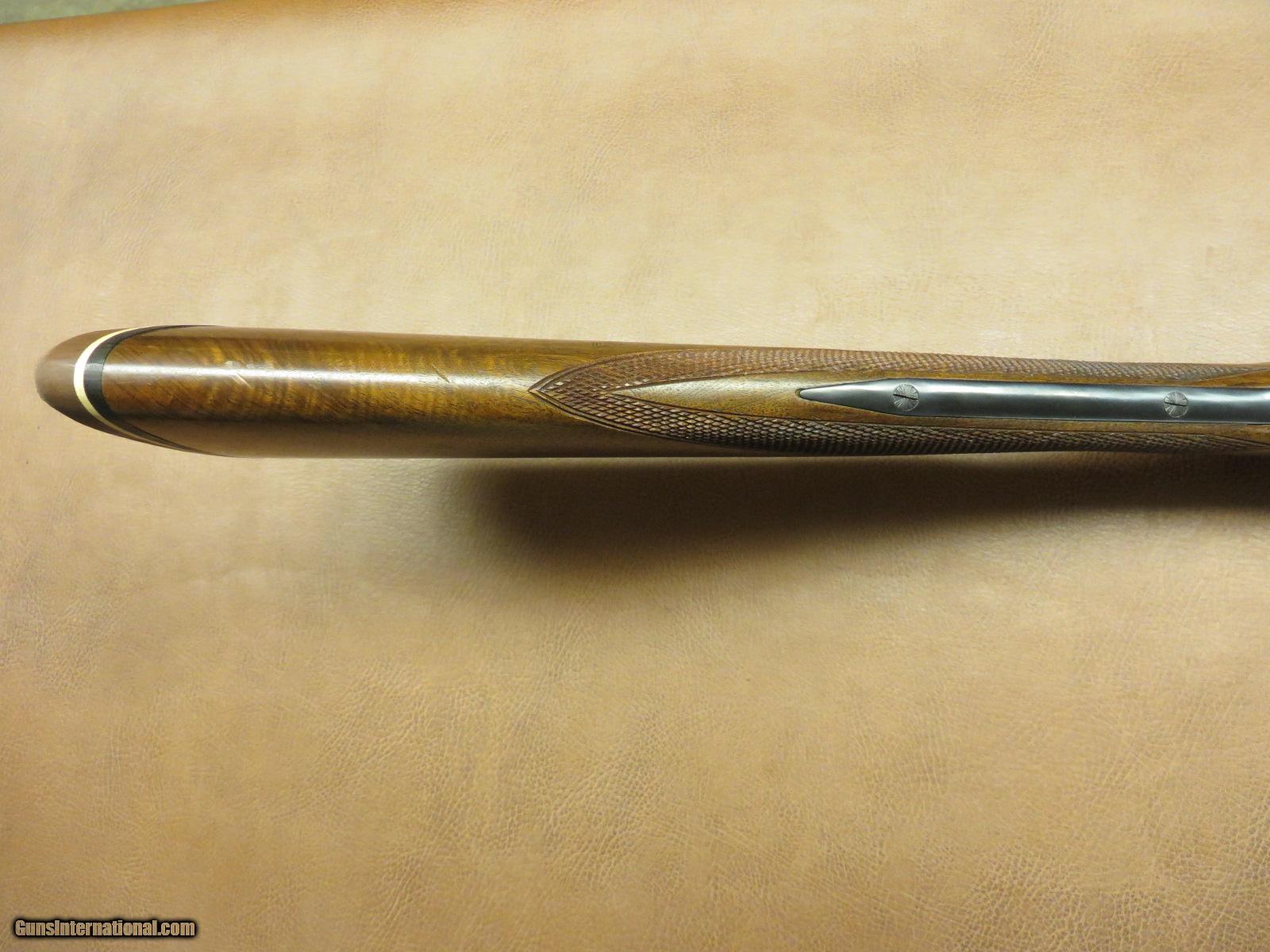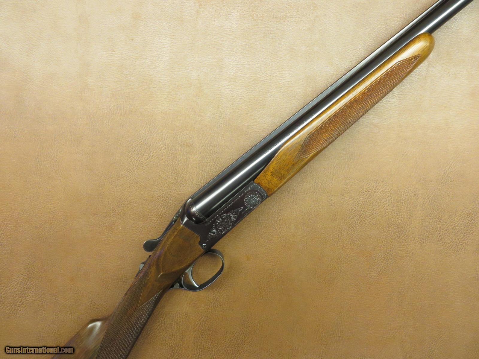 Description: 20 ga. for 2 3/4 and 3 inch shells has 26 inch barrels choked improved cylinder and modified. Engraved receiver has single selective trigger and automatic ejectors. Oil finish checkered walnut beavertail forend and straight grip stock has thin Pachmayr rubber butt pad with 14 1/4 inch length of pull. Blue is 98% and wood about 95%. SOLD |