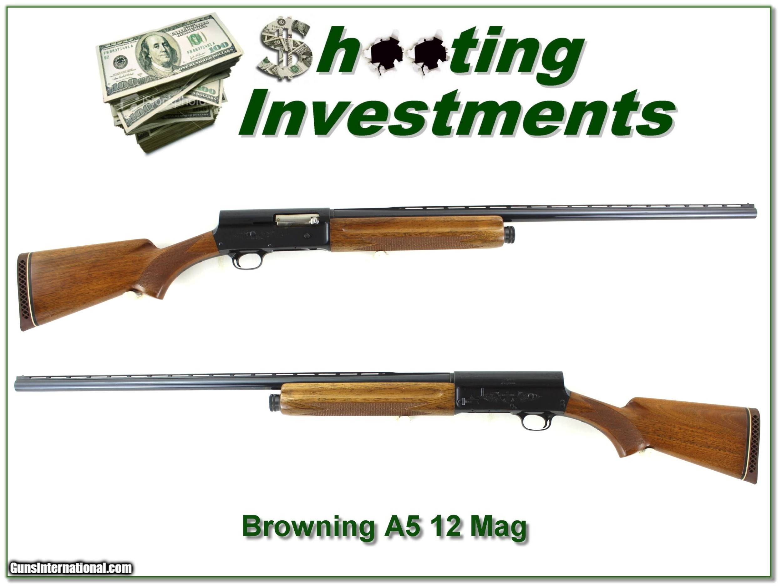 Description: Collectors and shooters, this is a beautiful Browning A5 Magnum 12 gauge. It was made in Belgium in 1968 and has beautiful honey blond wood. I believe it I unfired! It has a 30in Vent Rib full barrel and I find no marks of note! It will make a fine addition to your collection. It is a real Shooting Investment! Shipping and insurance is $39. Please email me with any questions or larger pictures. (Consign your quality firearms with Shooting Investments for only 12%! Let me know if you have any you would like to sell!) 21-1048 Payment: Payment is by Money Order, Cashier’s Check or Personal Check. I can now also accept Credit Cards (MasterCard, Visa, Discover & American Express) with a 3% convenience fee. Shipping: The shipping charge will be listed in each description. It is $39 for most firearms. Some heavy guns or those insured for over $2000 will be higher. Shipments to Alaska and Hawaii are higher because air shipment is required. Most firearms are shipped on Tuesday and Thursday and usually in 5 days of receipt of payment. We package all shipments carefully and insure them. Optics are shipped Priority Mail and most other non-firearm shipments are shipped First Class. Returns: Our return policy is simple. If for any reason you are not pleased with your purchase, you may return your item for a full refund of purchase price. Ammunition cannot be returned. It is important to us that you are happy. Guns cannot be fired or dissembled before returning them and they must be returned in the same condition as received. Notification of a return must occur within 3 days of receipt at your dealer. Shipping, convenience and dealer fees are not refundable and are the responsibility of the buyer. Lay-a-way: If needed, we offer a 60 day lay-a-way option on most firearms. It is 1/3 now, 1/3 in 30 days and 1/3 in 60 days. Lay-a-way firearm sales are final and cannot be returned. If a lay-a-way is not completed the first payment cannot be refunded. Consigning your firearms with Shooting Investments: We will help you get top dollar for your firearms. While most local guns shops charge 20% or more, our fee is only 12% with a minimum of $75. At your local gun shop it might take months to sell. Selling on-line provides instant access to thousands of interested buyers. You won’t find any other on-line dealer willing to sell your firearms for only 12% or listing every gun on 3 separate s. Selling through an House typically costs the seller 15% and the buyer an addition 15% (so 30%) and you have to wait several months to sell and longer to receive funds. If properly priced, we will sell your firearms within a few weeks. Send us an email or give us a call and we’ll explain how easy it is for you to get top dollar. Trading: Trading for us is really just buying your gun to re-sell. If you have a gun you want to trade, please email a picture and we will let you know what we can give for it. You will always get more if we sell it for you on consignment. Help for California Buyers: We are happy to ship to California. It is the buyer’s responsibility to make sure any item you buy is legal in your state. We are also happy to help with your purchase of a firearm from someone other than us. If you see a gun you would like to buy but the seller can’t or won’t ship to California they can ship to use and we’ll then ship it to your California dealer. The cost for this service is only $30 + shipping. Let us know if we can help! SOLD |
