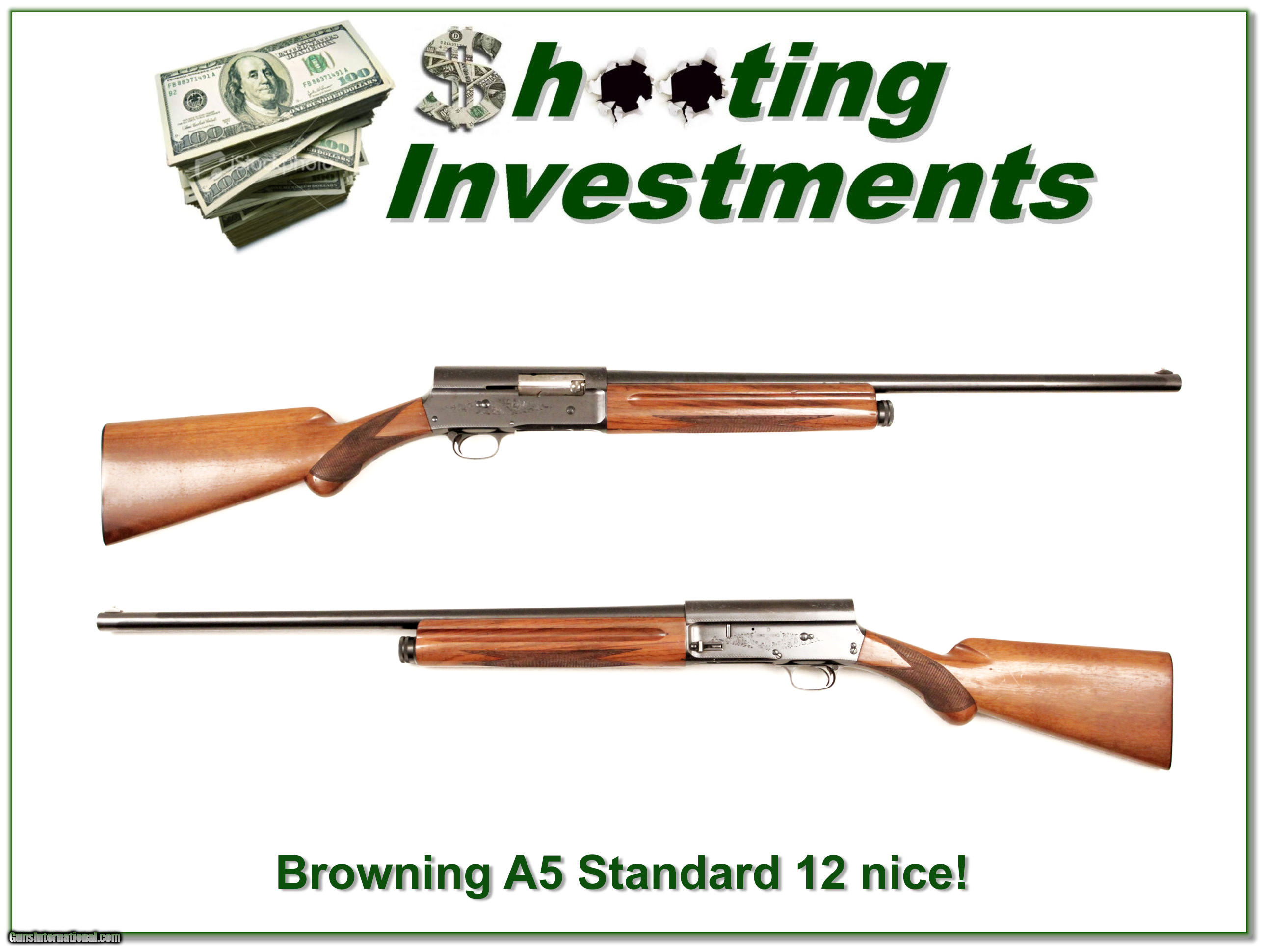 Description: This is a very nice all original Browning A5 12 Gauge. It was made in Belgium in 1958 and has nice wood with a 26in IC barrel. It has only minor marks from use and will make a great classic field gun. It is a real Shooting Investment! I am selling this one on consignment and as such lay-a-way can’t be used. It does of course have the standard 3 day inspection. Shipping and insurance is $35. Please email me with any questions or larger pictures. (I now consign quality firearms only 10%! Let me know if you have any you would like to sell!) [16-0597] Payment: Payment is by Money Order, Cashiers Check or Personal Check. I can now also accept MasterCard and Visa with a 3% convenience fee. PayPal can be used for some items but never firearms. Please let us know if you would like to pay via PayPal. Shipping: The shipping charge will be listed in each description. It is $35 for most guns. Some heavy guns or those insured for over $2000 will be higher. Shipments to Alaska and Hawaii are higher because air shipment is required. Most firearms are shipped within 5 days of receipt of payment. We prefer shipping at the beginning of the week to avoid firearms in transit over weekends. We package all shipments carefully and insure them for the full purchase price, rounded up to the next $100. In the unlikely event that damage occurs, it is important that you save all packaging material for the claims process. Optics are shipped Priority Mail and most other non-firearm shipments are shipped First Class. Returns: Our return policy is simple. If for any reason you are not pleased with your purchase, you may return your item for a refund. The only exception is ammunition, it cannot be returned. It is important to us that you are happy. Guns cannot be fired or dissembled before returning them and must be returned in the same condition as received. Notification of a return must occur with-in 3 days of receipt at your dealer. Shipping, convenience and dealer fees are not refundable and are the responsibility of the buyer. Lay-a-way: If needed, we offer a 60 day lay-a-way option on most firearms. It is 1/3 now, 1/3 in 30 days and 1/3 in 60 days. Lay-a-way firearm sales are final. Consigning your firearms with Shooting Investments: We will help you get top dollar for your firearms. While most local guns shops charge 20% or more, our fee is only 10% with a minimum of $50. At your local gun shop it might take months to sell. Selling on-line provides instant access to thousands of interested buyers. You won’t find any other on-line dealer willing to sell your firearms for only 10% or listing every gun on 4 separate s. Selling through an House typically costs the seller 15% and the buyer an addition 15% (so 30%) and you have to wait several months to sell and longer to receive funds. If properly priced, we will sell your firearms in a week or two. Send us an email or give us a call and we’ll explain how easy it is for you to get top dollar. Trading: We collect guns and usually just trade for guns we want to add to our collections. We often sell guns for others wanting to purchase one of ours. We find this the most fair to both of us. Our Commission is only 10% and we hold the gun you want until yours sells. Please contact us if you want to sell one of yours to buy one of ours. Help for California Buyers: We are happy to ship to California. It is the buyer’s responsibility to make sure any item you buy is legal in your state. We are also happy to help with your purchase of a firearm from someone other than us. If you see a gun you would like to buy but the seller can’t or won’t ship to California we can help. You buy the gun and have it shipped to us. We’ll then ship it to your California dealer. The cost for this service is only $30 + shipping. Let me know if we can help! SOLD |