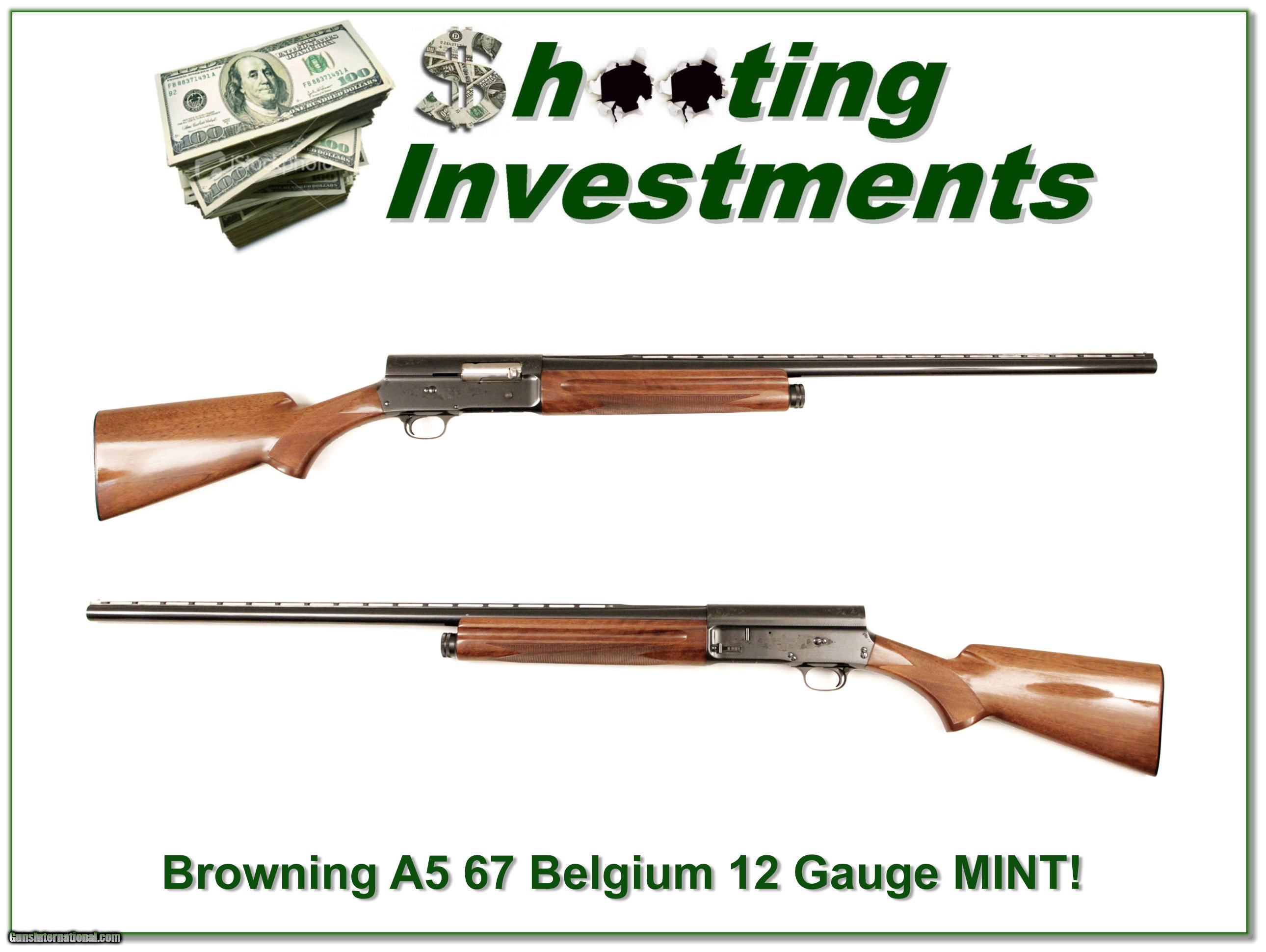 Description: Collectors, this is a first year flat knob 1967 A5 12 gauge. It is in collector condition with no edge, recoil or trigger wear. I see no marks of note on the beautiful wood. It has a 30in Vent Rib full barrel. This will make a fine addition to your collection and is sure to increase in value over time. That makes it a real Shooting Investment! Shipping and insurance is $35 or $15 more if you want it shipped in a new Plano hard case. Please email me with any questions or larger pictures. (I now consign quality firearms only 10%! Let me know if you have any you would like to sell!) [16-0395] Payment: Payment is by Money Order, Cashiers Check or Personal Check. I can now also accept MasterCard and Visa with a 3% convenience fee. PayPal can be used for some items but never firearms. Please let us know if you would like to pay via PayPal. Shipping: The shipping charge will be listed in each description. It is $35 for most guns. Some heavy guns or those insured for over $2000 will be higher. Shipments to Alaska and Hawaii are higher because air shipment is required. Most firearms are shipped within 5 days of receipt of payment. We prefer shipping at the beginning of the week to avoid firearms in transit over weekends. We package all shipments carefully and insure them for the full purchase price, rounded up to the next $100. In the unlikely event that damage occurs, it is important that you save all packaging material for the claims process. Optics are shipped Priority Mail and most other non-firearm shipments are shipped First Class. Returns: Our return policy is simple. If for any reason you are not pleased with your purchase, you may return your item for a refund. The only exception is ammunition, it cannot be returned. It is important to us that you are happy. Guns cannot be fired or dissembled before returning them and must be returned in the same condition as received. Notification of a return must occur with-in 3 days of receipt at your dealer. Shipping, convenience and dealer fees are not refundable and are the responsibility of the buyer. Lay-a-way: If needed, we offer a 60 day lay-a-way option on most firearms. It is 1/3 now, 1/3 in 30 days and 1/3 in 60 days. Lay-a-way firearm sales are final. Consigning your firearms with Shooting Investments: We will help you get top dollar for your firearms. While most local guns shops charge 20% or more, our fee is only 10% with a minimum of $50. At your local gun shop it might take months to sell. Selling on-line provides instant access to thousands of interested buyers. You won’t find any other on-line dealer willing to sell your firearms for only 10% or listing every gun on 4 separate s. Selling through an House typically costs the seller 15% and the buyer an addition 15% (so 30%) and you have to wait several months to sell and longer to receive funds. If properly priced, we will sell your firearms in a week or two. Send us an email or give us a call and we’ll explain how easy it is for you to get top dollar. Trading: We collect guns and usually just trade for guns we want to add to our collections. We often sell guns for others wanting to purchase one of ours. We find this the most fair to both of us. Our Commission is only 10% and we hold the gun you want until yours sells. Please contact us if you want to sell one of yours to buy one of ours. Help for California Buyers: We are happy to ship to California. It is the buyer’s responsibility to make sure any item you buy is legal in your state. We are also happy to help with your purchase of a firearm from someone other than us. If you see a gun you would like to buy but the seller can’t or won’t ship to California we can help. You buy the gun and have it shipped to us. We’ll then ship it to your California dealer. The cost for this service is only $30 + shipping. Let me know if we can help! SOLD |