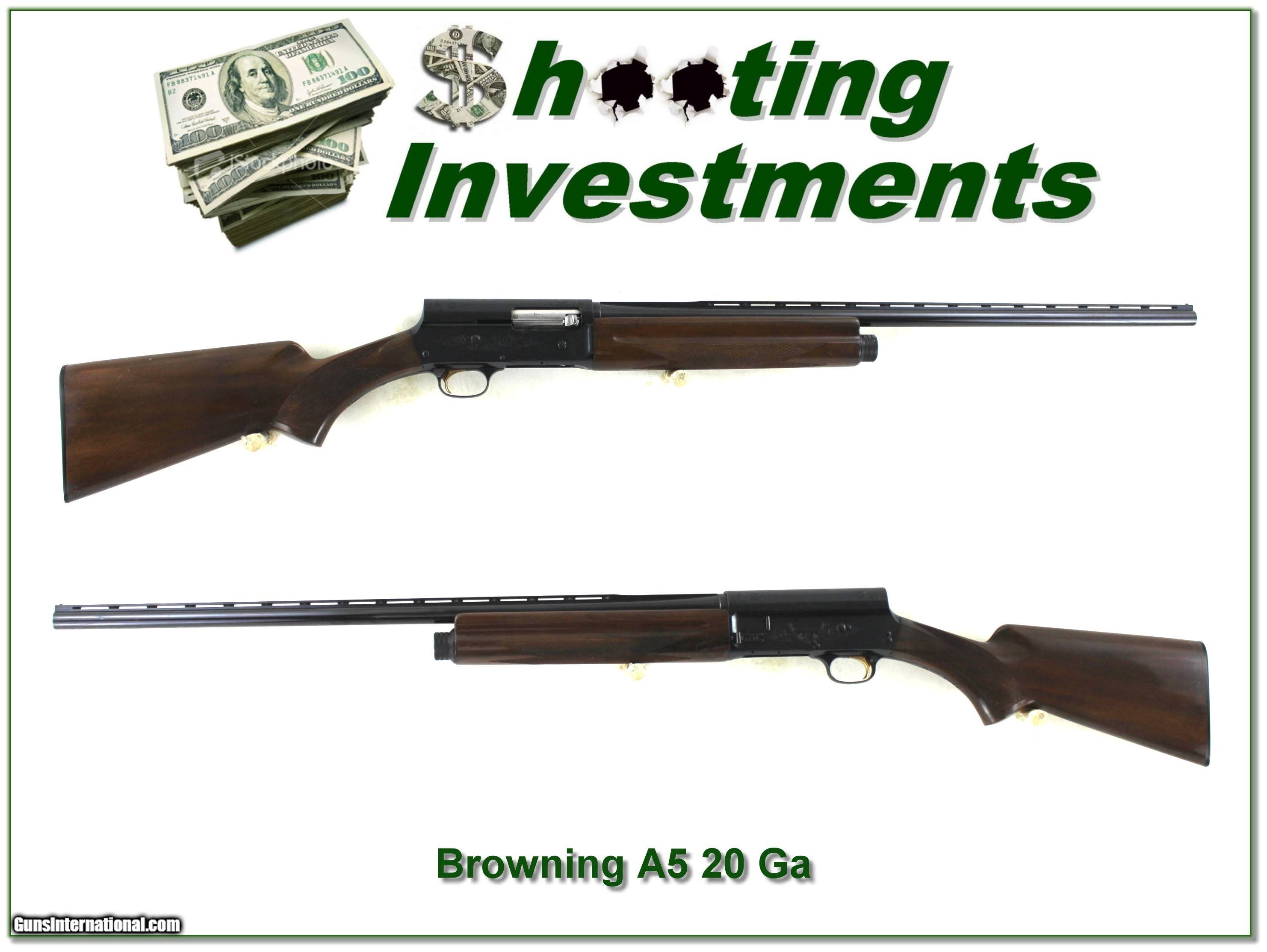 Description: Shooters, bird and rabbit hunters, this is a Browning A5 20 gauge the sought after 26in IC Vent Rib barrel. This one is a Japan made gun, and the blue is excellent with hardly any edge or recoil wear. The wood has a few marks as seen. It will make a classic field gun and these A5’s keep going up in value! Shipping and insurance is $49. Please email me with any questions or larger pictures. (Consign your quality firearms with Shooting Investments for only 12%! Let me know if you have any you would like to sell!) 25-0114 Payment: Payment is by Money Order, Cashier’s Check or Personal Check. I can now also accept Credit Cards (MasterCard, Visa, Discover & American Express) with a 3% convenience fee. Shipping: The shipping charge will be listed in each description. It is $49 for most firearms. Some heavy guns or those insured for over $2000 will be higher. Shipments to Alaska and Hawaii are higher because air shipment is required. Most firearms are shipped on Tuesday and Thursday and usually in 5 days of receipt of payment. We package all shipments carefully and insure them. Optics are shipped Priority Mail and most other non-firearm shipments are shipped First Class. Returns: Our return policy is simple. If for any reason you are not pleased with your purchase, you may return your item for a full refund of purchase price. Ammunition cannot be returned. It is important to us that you are happy. Guns cannot be fired or dissembled before returning them and they must be returned in the same condition as received. Notification of a return must occur within 3 days of receipt at your dealer. Shipping, convenience and dealer fees are not refundable and are the responsibility of the buyer. Lay-a-way: If needed, we offer a 60 day lay-a-way option on most firearms. It is 1/3 now, 1/3 in 30 days and 1/3 in 60 days. Lay-a-way firearm sales are final and cannot be returned. If a lay-a-way is not completed the first payment cannot be refunded. Consigning your firearms with Shooting Investments: We will help you get top dollar for your firearms. While most local guns shops charge 20% or more, our fee is only 12% with a minimum of $100. At your local gun shop it might take months to sell. Selling on-line provides instant access to thousands of interested buyers. You won’t find any other on-line dealer willing to sell your firearms for only 12% or listing every gun on 3 separate s. Selling through an House typically costs the seller 15% and the buyer an addition 15% (so 30%) and you have to wait several months to sell and longer to receive funds. If properly priced, we will sell your firearms within a few weeks. Send us an email or give us a call and we’ll explain how easy it is for you to get top dollar. Trading: Trading for us is really just buying your gun to re-sell. If you have a gun you want to trade, please email a picture and we will let you know what we can give for it. You will always get more if we sell it for you on consignment. SOLD |