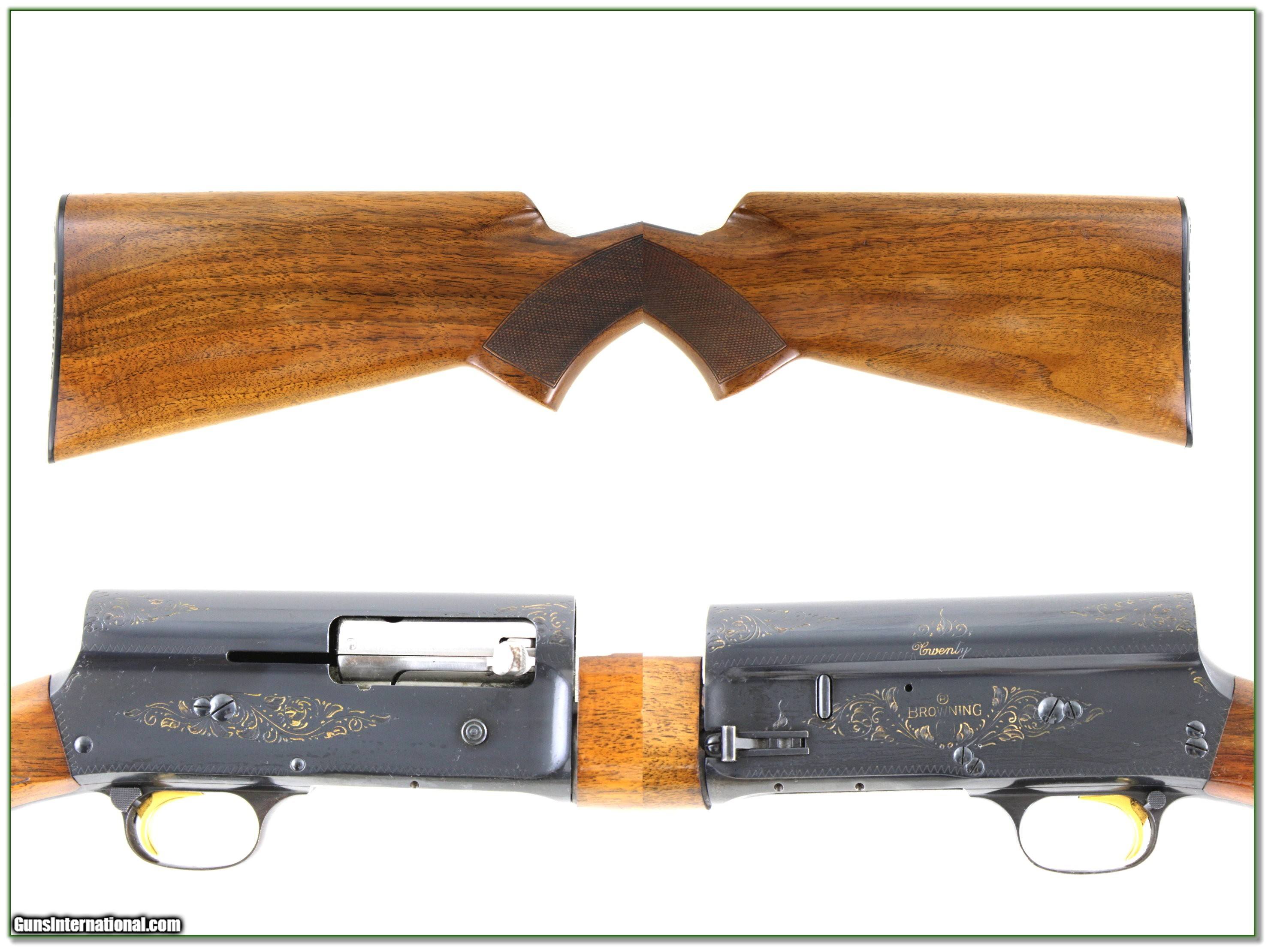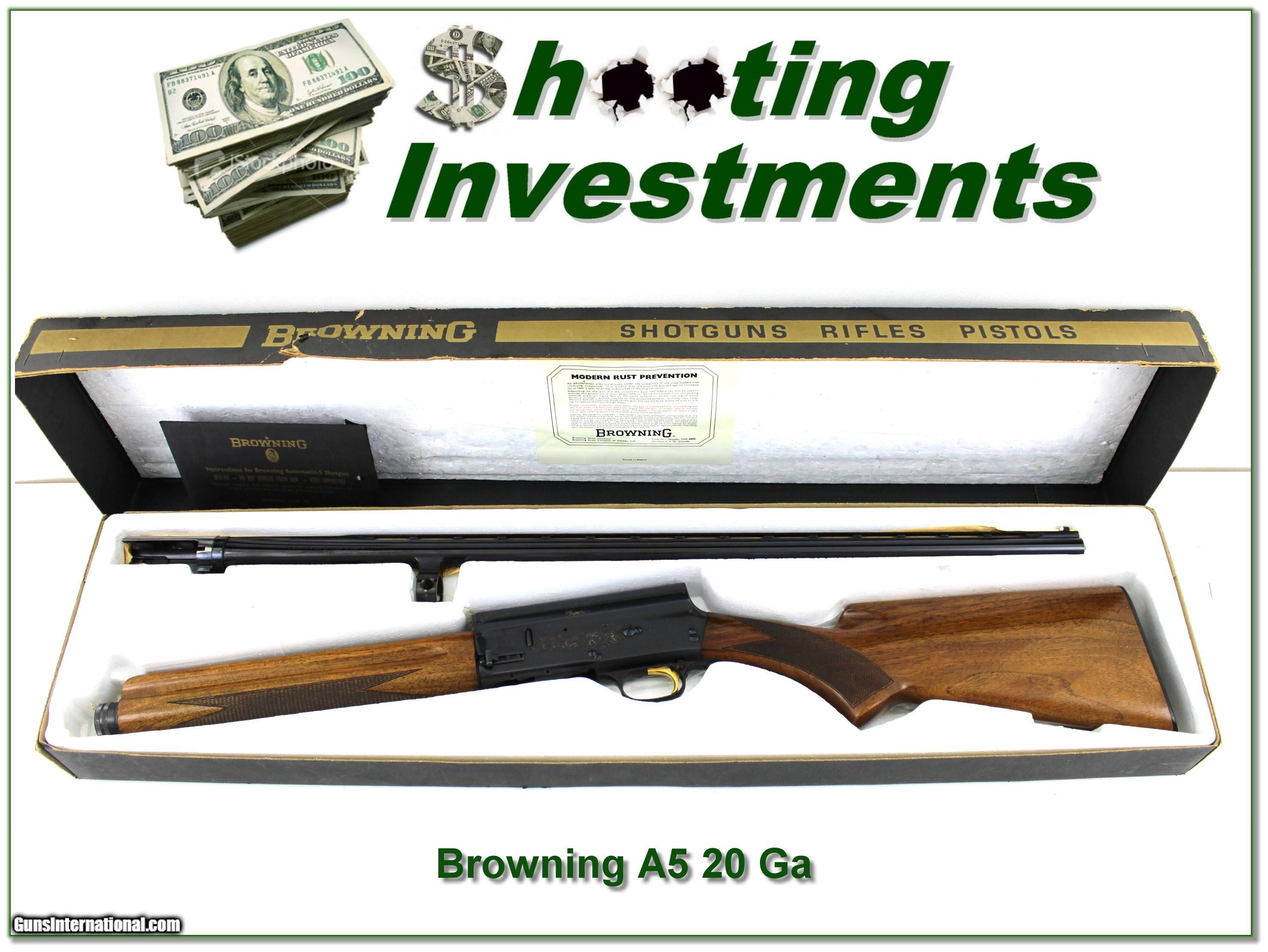 Description: Collector and bird hunters, this is a 1971 Belgium made Browning A5 20 Gauge. The blue is excellent with just very light thinning on the lower tang. I don’t see any gold trigger, recoil or edge wear. The barrel is a 28in Vent Rib Modified. It comes as seen in the original box with manual. The honey blond wood has some scattered minor marks as seen. These are getting hard to find in the original box. It could easily be restored to like new or will make an impressive field gun as is. Shipping and insurance is $59. Please email me with any questions or larger pictures. (Consign your quality firearms with Shooting Investments for only 12%! Let me know if you have any you would like to sell!) 25-0504 SOLD |