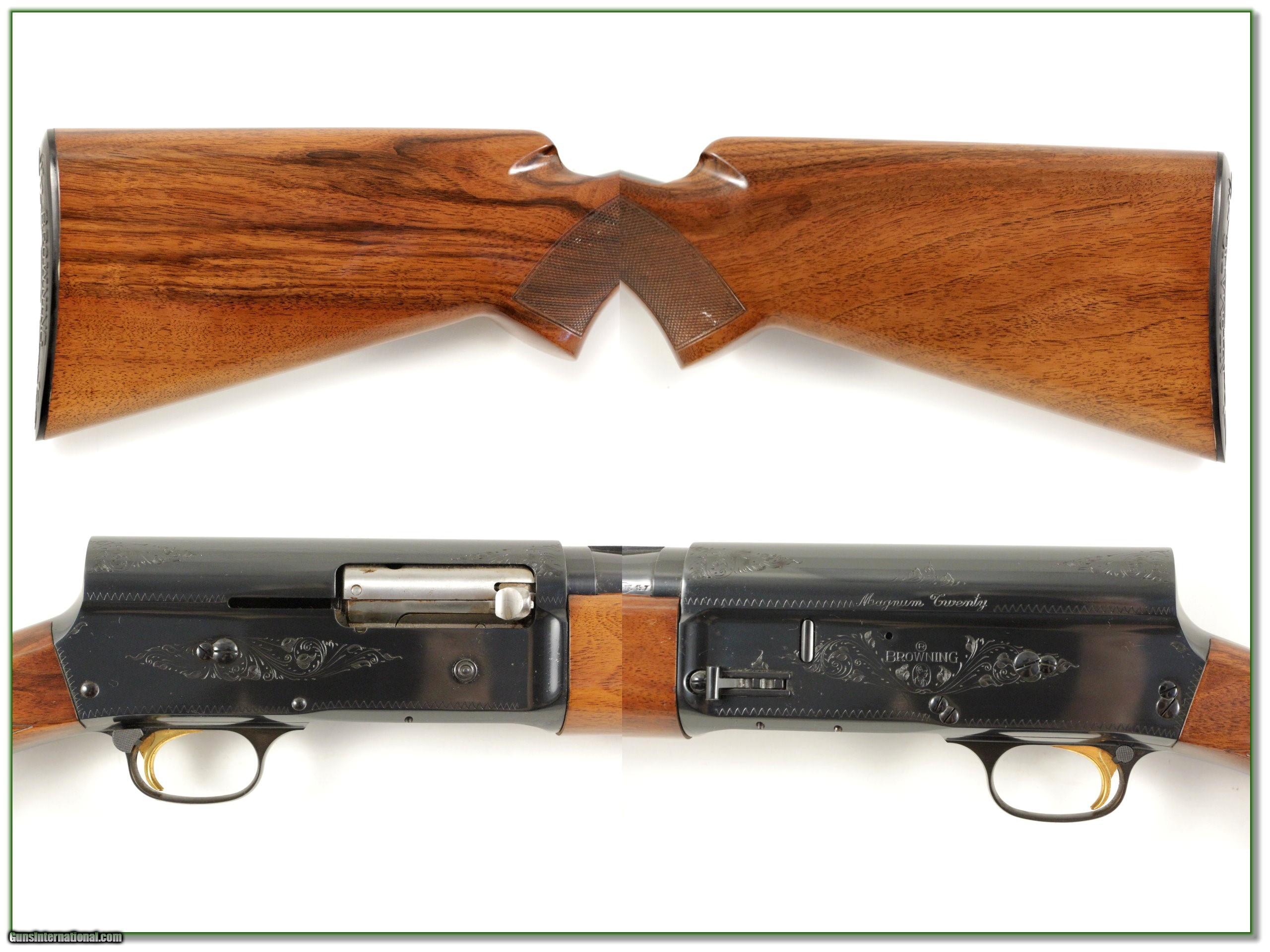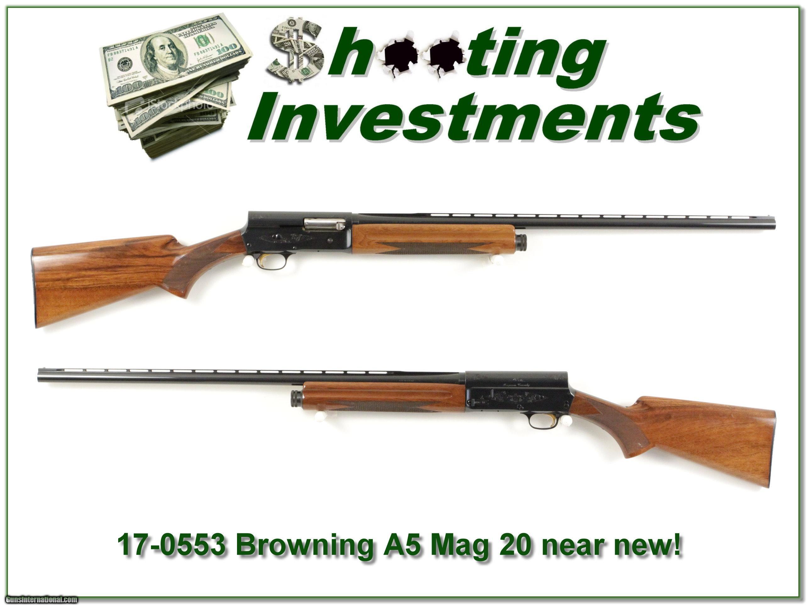 Description: Collectors, this is a near new Browning A5 20 Magnum. It was made in Belgium in 1969 and has MUCH nicer wood grin than most. The blue has no edge, recoil or gold trigger wear. The barrel is a 28in Vent Rib Modified. I see no marks of note on the wood. This will make a fine addition to your collection. It is a real Shooting Investment! Shipping and insurance is $35 or $15 more if you want it shipped in a new Plano hard case. Please email me with any questions or larger pictures. (Consign your quality firearms with Shooting Investments for only 10%! Let me know if you have any you would like to sell!) 17-0553 Payment: Payment is by Money Order, Cashiers Check or Personal Check. I can now also accept MasterCard and Visa with a 3% convenience fee. PayPal can be used for some items but never firearms. Please let us know if you would like to pay via PayPal. Shipping: The shipping charge will be listed in each description. It is $35 for most guns. Some heavy guns or those insured for over $2000 will be higher. Shipments to Alaska and Hawaii are higher because air shipment is required. Most firearms are shipped within 5 days of receipt of payment. We prefer shipping at the beginning of the week to avoid firearms in transit over weekends. We package all shipments carefully and insure them for the full purchase price, rounded up to the next $100. In the unlikely event that damage occurs, it is important that you save all packaging material for the claims process. Optics are shipped Priority Mail and most other non-firearm shipments are shipped First Class. Returns: Our return policy is simple. If for any reason you are not pleased with your purchase, you may return your item for a refund. The only exception is ammunition, it cannot be returned. It is important to us that you are happy. Guns cannot be fired or dissembled before returning them and must be returned in the same condition as received. Notification of a return must occur with-in 3 days of receipt at your dealer. Shipping, convenience and dealer fees are not refundable and are the responsibility of the buyer. Lay-a-way: If needed, we offer a 60 day lay-a-way option on most firearms. It is 1/3 now, 1/3 in 30 days and 1/3 in 60 days. Lay-a-way firearm sales are final. Consigning your firearms with Shooting Investments: We will help you get top dollar for your firearms. While most local guns shops charge 20% or more, our fee is only 10% with a minimum of $50. At your local gun shop it might take months to sell. Selling on-line provides instant access to thousands of interested buyers. You won’t find any other on-line dealer willing to sell your firearms for only 10% or listing every gun on 4 separate s. Selling through an House typically costs the seller 15% and the buyer an addition 15% (so 30%) and you have to wait several months to sell and longer to receive funds. If properly priced, we will sell your firearms in a week or two. Send us an email or give us a call and we’ll explain how easy it is for you to get top dollar. Trading: We collect guns and usually just trade for guns we want to add to our collections. We often sell guns for others wanting to purchase one of ours. We find this the most fair to both of us. Our Commission is only 10% and we hold the gun you want until yours sells. Please contact us if you want to sell one of yours to buy one of ours. Help for California Buyers: We are happy to ship to California. It is the buyer’s responsibility to make sure any item you buy is legal in your state. We are also happy to help with your purchase of a firearm from someone other than us. If you see a gun you would like to buy but the seller can’t or won’t ship to California we can help. You buy the gun and have it shipped to us. We’ll then ship it to your California dealer. The cost for this service is only $30 + shipping. Let me know if we can help! SOLD |