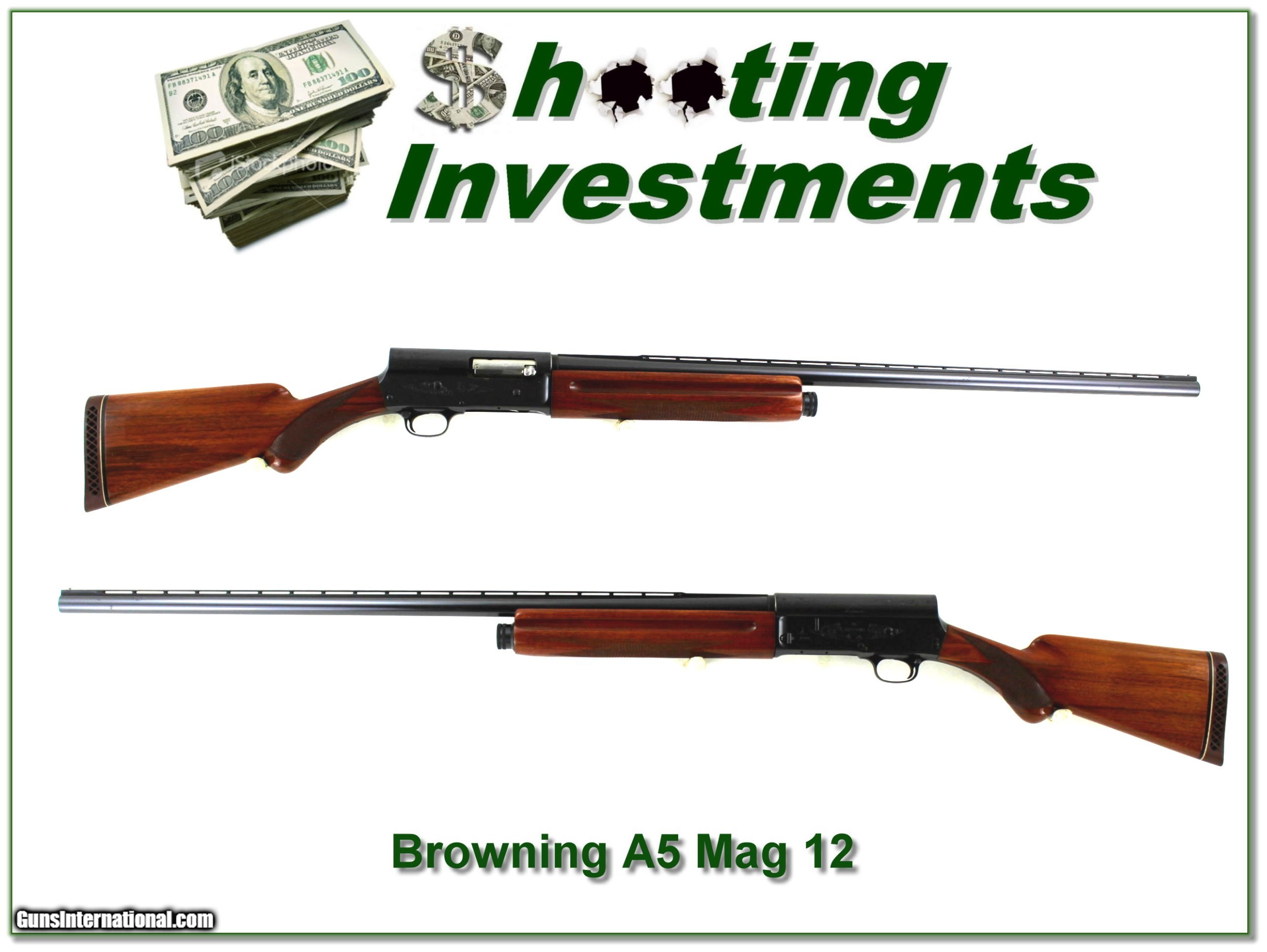 Description: Collectors and classic gun hunters, this is a beautiful and excellent condition 1962 Belgium made Browning A5 Magnum 12 Gauge. It has a 32in Vent Rib barrel and is all-original. The rust blue is excellent with no edge, recoil or trigger wear. I’m sure not many shells ever fired. The wood has only a few minor marks I’m sure more from storage than use. Not many early round knob Mag 12’s left this nice. I call it a Shooting Investment! Shipping and insurance is $49. Please email me with any questions or larger pictures. (Consign your quality firearms with Shooting Investments for only 12%! Let me know if you have any you would like to sell!) 22-1171 Payment: Payment is by Money Order, Cashiers Check or Personal Check. I can now also accept Credit Cards (MasterCard, Visa, Discover & American Express) with a 3% convenience fee. Shipping: The shipping charge will be listed in each description. It is $49 for most long guns. Some heavy guns, over 48in boxes or those insured for over $2000 will be higher. Shipments to Alaska and Hawaii are higher because air shipment is required. Most firearms are shipped on Tuesday and Thursday and usually in 5 days of receipt of payment. We package all shipments carefully and insure them. Optics are shipped Priority Mail and most other non-firearm shipments are shipped First Class. Returns: Our return policy is simple. If for any reason you are not pleased with your purchase, you may return your item for a full refund of purchase price. Ammunition cannot be returned. It is important to us that you are happy. Guns cannot be fired or dissembled before returning them and they must be returned in the same condition as received. Notification of a return must occur with-in 3 days of receipt at your dealer. Shipping, convenience and dealer fees are not refundable and are the responsibility of the buyer. Lay-a-way: If needed, we offer a 60 day lay-a-way option on most firearms. It is 1/3 now, 1/3 in 30 days and 1/3 in 60 days. Lay-a-way firearm sales are final and if not completed the first payment cannot be returned. Consigning your firearms with Shooting Investments: We will help you get top dollar for your firearms. While most local guns shops charge 20% or more, our fee is only 12% with a minimum of $75. At your local gun shop it might take months to sell. Selling on-line provides instant access to thousands of interested buyers. You won’t find any other on-line dealer willing to sell your firearms for only 12% or listing every gun on 3 separate s. Selling through an House typically costs the seller 15% and the buyer an addition 15% (so 30%) and you have to wait several months to sell and longer to receive funds. If properly priced, we will sell your firearms in a few weeks. Send us an email or give us a call and we’ll explain how easy it is for you to get top dollar. Trading: Trading for use is really just buying your gun to re-sell. If you have a gun you want to trade, please email a picture and we will let you know what we can give or it. You will always get more if we sell it for you on consignment. Help for California Buyers: We are happy to ship to California. It is the buyer’s responsibility to make sure any item you buy is legal in your state. We are also happy to help with your purchase of a firearm from someone other than us. If you see a gun you would like to buy but the seller can’t or won’t ship to California they can ship to use and we’ll then ship it to your California dealer. The cost for this service is only $30 + shipping. Let us know if we can help! SOLD |