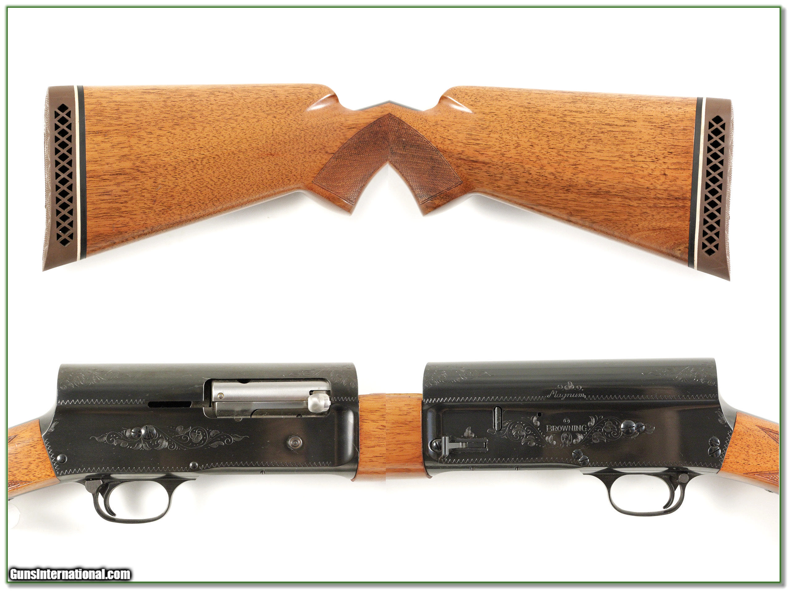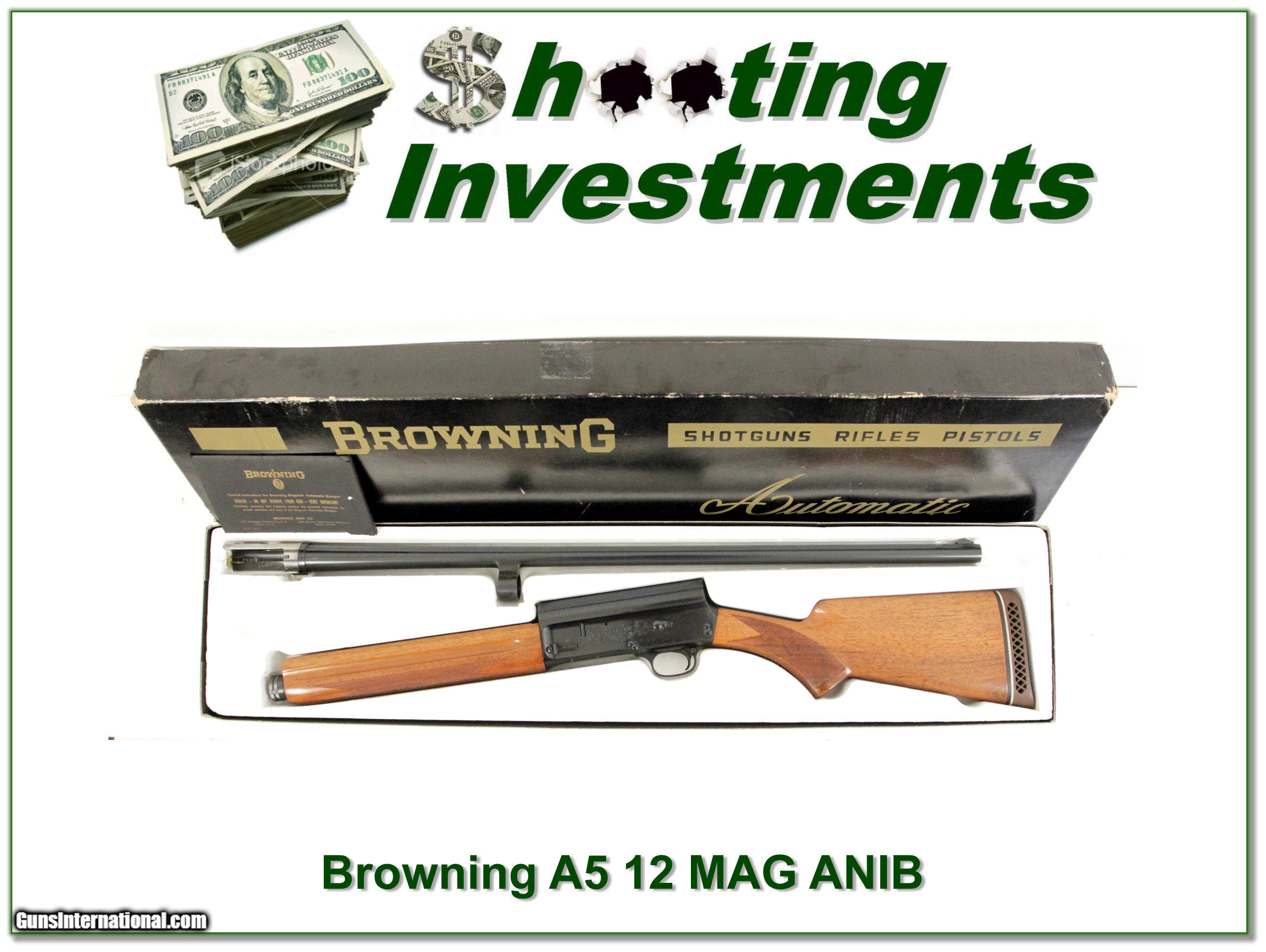Description: Collectors, this is a beautiful and early 3-digit first year 1967 Belgium Flat Knob A5 Magnum 12 Gauge. These are VERY HARD to find this nice and in the original box! It has blond wood and the blue looks new with no wear or signs of use. I am sure only a few shells fired and the wood has only a couple insignificant marks. It comes as seen in box with original manual. The barrel is a 30in full. Shipping and insurance is $35. Please email me with any questions or larger pictures. (Consign your quality firearms with Shooting Investments for only 10%! Let me know if you have any you would like to sell!) 17-0868 Payment: Payment is by Money Order, Cashiers Check or Personal Check. I can now also accept MasterCard and Visa with a 3% convenience fee. PayPal can be used for some items but never firearms. Please let us know if you would like to pay via PayPal. Shipping: The shipping charge will be listed in each description. It is $35 for most guns. Some heavy guns or those insured for over $2000 will be higher. Shipments to Alaska and Hawaii are higher because air shipment is required. Most firearms are shipped within 5 days of receipt of payment. We prefer shipping at the beginning of the week to avoid firearms in transit over weekends. We package all shipments carefully and insure them for the full purchase price, rounded up to the next $100. In the unlikely event that damage occurs, it is important that you save all packaging material for the claims process. Optics are shipped Priority Mail and most other non-firearm shipments are shipped First Class. Returns: Our return policy is simple. If for any reason you are not pleased with your purchase, you may return your item for a refund. The only exception is ammunition, it cannot be returned. It is important to us that you are happy. Guns cannot be fired or dissembled before returning them and must be returned in the same condition as received. Notification of a return must occur with-in 3 days of receipt at your dealer. Shipping, convenience and dealer fees are not refundable and are the responsibility of the buyer. Lay-a-way: If needed, we offer a 60 day lay-a-way option on most firearms. It is 1/3 now, 1/3 in 30 days and 1/3 in 60 days. Lay-a-way firearm sales are final. Consigning your firearms with Shooting Investments: We will help you get top dollar for your firearms. While most local guns shops charge 20% or more, our fee is only 10% with a minimum of $50. At your local gun shop it might take months to sell. Selling on-line provides instant access to thousands of interested buyers. You won’t find any other on-line dealer willing to sell your firearms for only 10% or listing every gun on 4 separate s. Selling through an House typically costs the seller 15% and the buyer an addition 15% (so 30%) and you have to wait several months to sell and longer to receive funds. If properly priced, we will sell your firearms in a week or two. Send us an email or give us a call and we’ll explain how easy it is for you to get top dollar. Trading: We collect guns and usually just trade for guns we want to add to our collections. We often sell guns for others wanting to purchase one of ours. We find this the most fair to both of us. Our Commission is only 10% and we hold the gun you want until yours sells. Please contact us if you want to sell one of yours to buy one of ours. Help for California Buyers: We are happy to ship to California. It is the buyer’s responsibility to make sure any item you buy is legal in your state. We are also happy to help with your purchase of a firearm from someone other than us. If you see a gun you would like to buy but the seller can’t or won’t ship to California we can help. You buy the gun and have it shipped to us. We’ll then ship it to your California dealer. The cost for this service is only $30 + shipping. Let me know if we can help! SOLD |