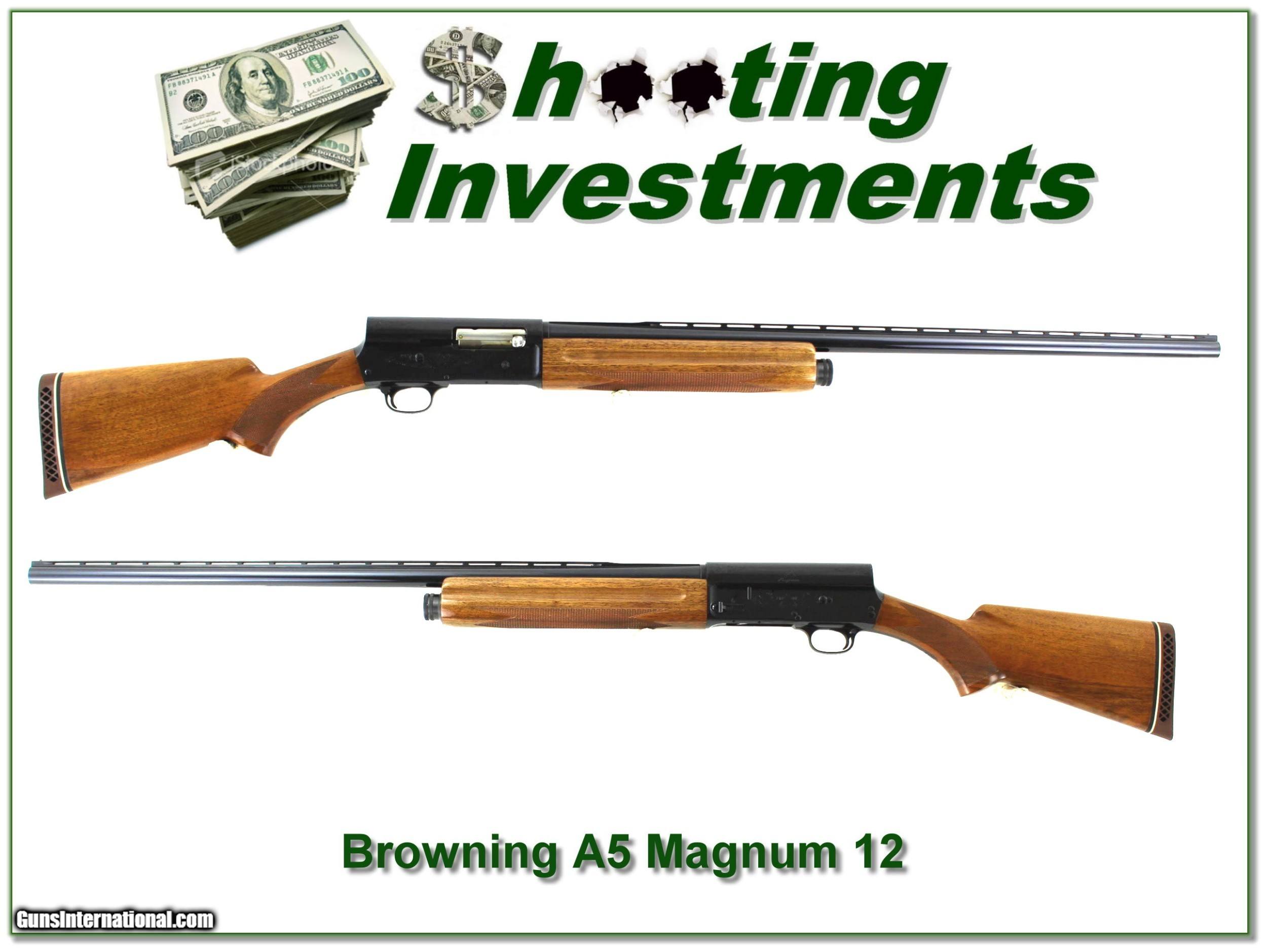 Description: Collectors, this is a beautiful honey blond Browning A5 Magnum 12 Gauge. It was made in Belgium in 1968 and I believe it is unfired. I find no marks on the metal or the wood. It has a 30in Vent Rib barrel. And it will make a fine addition to your collection! It is a real Shooting Investment for sure! Shipping and insurance is $49. Please email me with any questions or larger pictures. (Consign your quality firearms with Shooting Investments for only 12%! Let me know if you have any you would like to sell!) 22-0598 Payment: Payment is by Money Order, Cashiers Check or Personal Check. I can now also accept Credit Cards (MasterCard, Visa, Discover & American Express) with a 3% convenience fee. Shipping: The shipping charge will be listed in each description. It is $49 for most long guns. Some heavy guns, over 48in boxes or those insured for over $2000 will be higher. Shipments to Alaska and Hawaii are higher because air shipment is required. Most firearms are shipped on Tuesday and Thursday and usually in 5 days of receipt of payment. We package all shipments carefully and insure them. Optics are shipped Priority Mail and most other non-firearm shipments are shipped First Class. Returns: Our return policy is simple. If for any reason you are not pleased with your purchase, you may return your item for a full refund of purchase price. Ammunition cannot be returned. It is important to us that you are happy. Guns cannot be fired or dissembled before returning them and they must be returned in the same condition as received. Notification of a return must occur with-in 3 days of receipt at your dealer. Shipping, convenience and dealer fees are not refundable and are the responsibility of the buyer. Lay-a-way: If needed, we offer a 60 day lay-a-way option on most firearms. It is 1/3 now, 1/3 in 30 days and 1/3 in 60 days. Lay-a-way firearm sales are final and if not completed the first payment cannot be returned. Consigning your firearms with Shooting Investments: We will help you get top dollar for your firearms. While most local guns shops charge 20% or more, our fee is only 12% with a minimum of $75. At your local gun shop it might take months to sell. Selling on-line provides instant access to thousands of interested buyers. You won’t find any other on-line dealer willing to sell your firearms for only 12% or listing every gun on 3 separate s. Selling through an House typically costs the seller 15% and the buyer an addition 15% (so 30%) and you have to wait several months to sell and longer to receive funds. If properly priced, we will sell your firearms in a few weeks. Send us an email or give us a call and we’ll explain how easy it is for you to get top dollar. Trading: Trading for use is really just buying your gun to re-sell. If you have a gun you want to trade, please email a picture and we will let you know what we can give or it. You will always get more if we sell it for you on consignment. Help for California Buyers: We are happy to ship to California. It is the buyer’s responsibility to make sure any item you buy is legal in your state. We are also happy to help with your purchase of a firearm from someone other than us. If you see a gun you would like to buy but the seller can’t or won’t ship to California they can ship to use and we’ll then ship it to your California dealer. The cost for this service is only $30 + shipping. Let us know if we can help! SOLD |