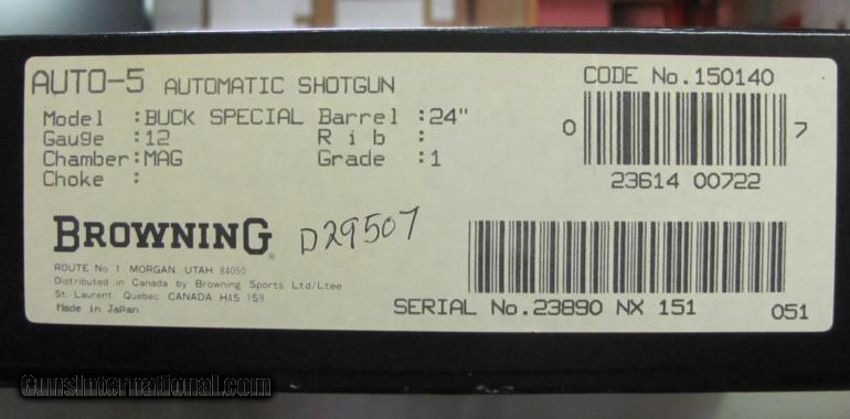 Description: BROWNING model A5-BUCK SPECIAL in 12 GA. CAL., with 24" barrel. Color BLUE. THIS 3" MAGNUM A5 HAS 2 SMALL RACK MARKS AT THE TOP OF THE COMB OTHERWISE AS NEW IN ITS FACTORY BOX WITH PAPERS, Condition 98% PLUS. SOLD |