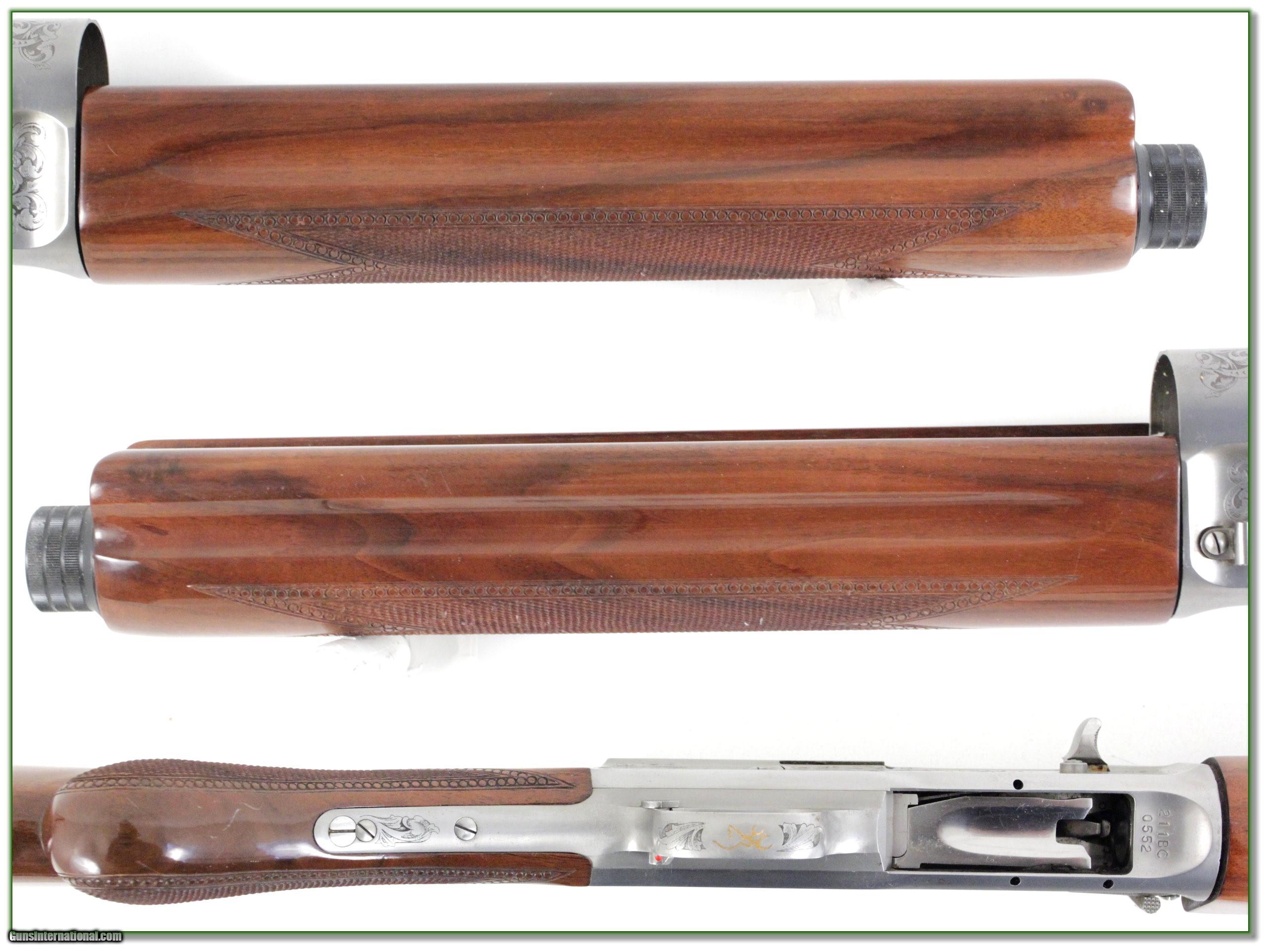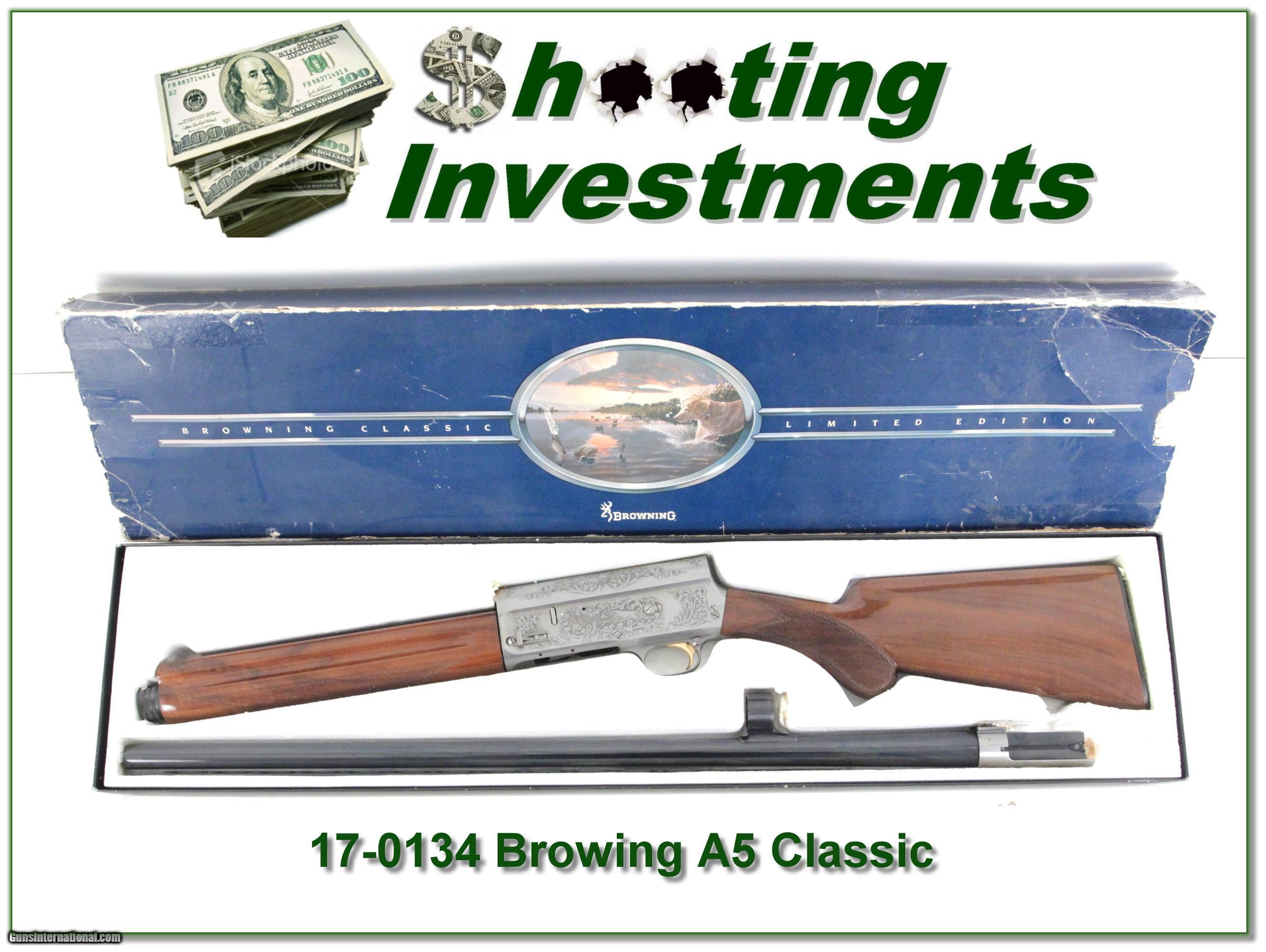 Description: If you ever wanted to add an A5 Classic to your collection here’s your chance to add one. It has beautiful wood. Looks to have possibly fired a couple shells with only a couple light handing marks. It comes with original box as seen. These all has 28in Vent Rib Modified barrels. It was signed by A Marcisz as best as I can see it. It will make a prized addition to your collection. Shipping and insurance is $45. Please email me with any questions or larger pictures. (I now consign quality firearms only 10%! Let me know if you have any you would like to sell!) [17-0134] Payment: Payment is by Money Order, Cashiers Check or Personal Check. I can now also accept MasterCard and Visa with a 3% convenience fee. PayPal can be used for some items but never firearms. Please let us know if you would like to pay via PayPal. Shipping: The shipping charge will be listed in each description. It is $35 for most guns. Some heavy guns or those insured for over $2000 will be higher. Shipments to Alaska and Hawaii are higher because air shipment is required. Most firearms are shipped within 5 days of receipt of payment. We prefer shipping at the beginning of the week to avoid firearms in transit over weekends. We package all shipments carefully and insure them for the full purchase price, rounded up to the next $100. In the unlikely event that damage occurs, it is important that you save all packaging material for the claims process. Optics are shipped Priority Mail and most other non-firearm shipments are shipped First Class. Returns: Our return policy is simple. If for any reason you are not pleased with your purchase, you may return your item for a refund. The only exception is ammunition, it cannot be returned. It is important to us that you are happy. Guns cannot be fired or dissembled before returning them and must be returned in the same condition as received. Notification of a return must occur with-in 3 days of receipt at your dealer. Shipping, convenience and dealer fees are not refundable and are the responsibility of the buyer. Lay-a-way: If needed, we offer a 60 day lay-a-way option on most firearms. It is 1/3 now, 1/3 in 30 days and 1/3 in 60 days. Lay-a-way firearm sales are final. Consigning your firearms with Shooting Investments: We will help you get top dollar for your firearms. While most local guns shops charge 20% or more, our fee is only 10% with a minimum of $50. At your local gun shop it might take months to sell. Selling on-line provides instant access to thousands of interested buyers. You won’t find any other on-line dealer willing to sell your firearms for only 10% or listing every gun on 4 separate s. Selling through an House typically costs the seller 15% and the buyer an addition 15% (so 30%) and you have to wait several months to sell and longer to receive funds. If properly priced, we will sell your firearms in a week or two. Send us an email or give us a call and we’ll explain how easy it is for you to get top dollar. Trading: We collect guns and usually just trade for guns we want to add to our collections. We often sell guns for others wanting to purchase one of ours. We find this the most fair to both of us. Our Commission is only 10% and we hold the gun you want until yours sells. Please contact us if you want to sell one of yours to buy one of ours. Help for California Buyers: We are happy to ship to California. It is the buyer’s responsibility to make sure any item you buy is legal in your state. We are also happy to help with your purchase of a firearm from someone other than us. If you see a gun you would like to buy but the seller can’t or won’t ship to California we can help. You buy the gun and have it shipped to us. We’ll then ship it to your California dealer. The cost for this service is only $30 + shipping. Let me know if we can help! SOLD |