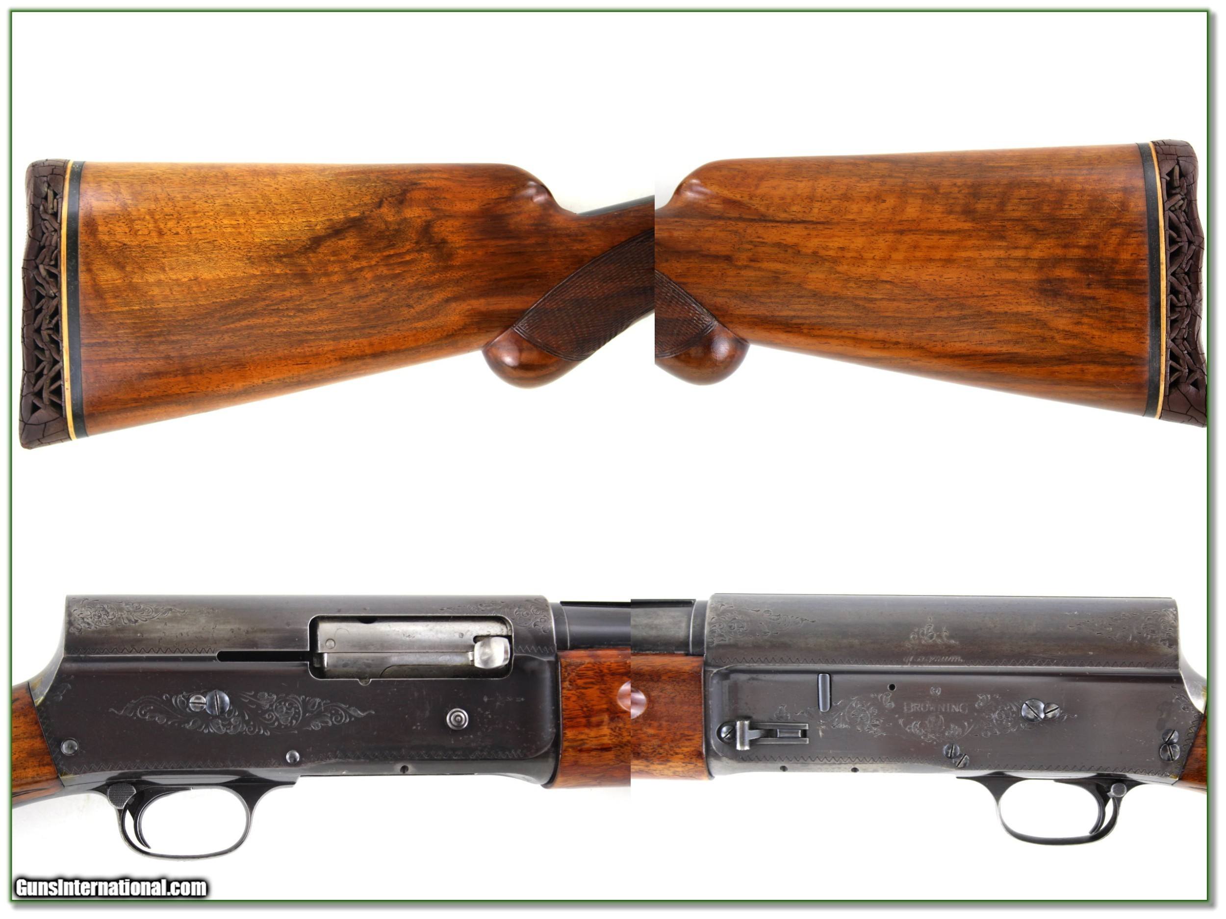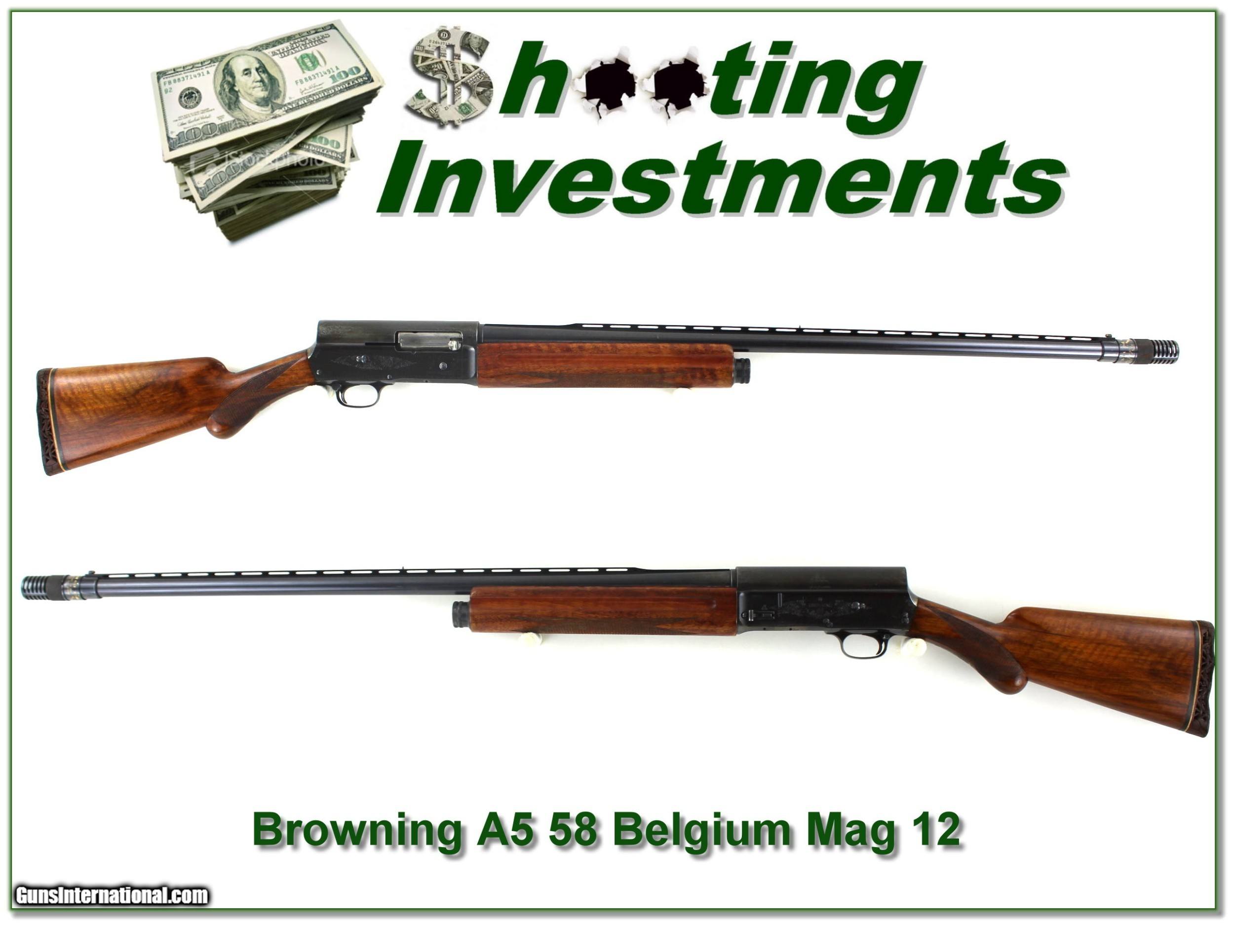 Description: This is a Browning A5 12 Magnum. It was made in 1958 the first year for the Belgium Magnum 12. These are hard to find. If you are an experienced collector, you will recognize the butt pad. Like all 1958 ones they get hard. Browning changed the pad for the 1959 year guns. This one is in very good used condition with a 32in barrel with poli-choke. The wood is sold with only a few marks. It could be restored to collector condition or enjoyed as the classic A5 it is. Shipping with insurance is $39. Please email me with any questions or larger pictures. (Consign your quality firearms with Shooting Investments for only 12%! Let me know if you have any you would like to sell!) 20-0243 Payment: Payment is by Money Order, Cashiers Check or Personal Check. I can now also accept Credit Cards (MasterCard, Visa, Discover & American Express) with a 3% convenience fee. PayPal can be used for some items but never for firearms. Shipping: The shipping charge will be listed in each description. It is $39 for most firearms. Some heavy guns or those insured for over $2000 will be higher. Shipments to Alaska and Hawaii are higher because air shipment is required. Most firearms are shipped on Tuesday and Thursday and usually in 5 days of receipt of payment. We package all shipments carefully and insure them. Optics are shipped Priority Mail and most other non-firearm shipments are shipped First Class. Returns: Our return policy is simple. If for any reason you are not pleased with your purchase, you may return your item for a full refund of purchase price. Ammunition cannot be returned. It is important to us that you are happy. Guns cannot be fired or dissembled before returning them and they must be returned in the same condition as received. Notification of a return must occur with-in 3 days of receipt at your dealer. Shipping, convenience and dealer fees are not refundable and are the responsibility of the buyer. Lay-a-way: If needed, we offer a 60 day lay-a-way option on most firearms. It is 1/3 now, 1/3 in 30 days and 1/3 in 60 days. Lay-a-way firearm sales are final and if not completed the first payment cannot be returned. Consigning your firearms with Shooting Investments: We will help you get top dollar for your firearms. While most local guns shops charge 20% or more, our fee is only 12% with a minimum of $75. At your local gun shop it might take months to sell. Selling on-line provides instant access to thousands of interested buyers. You won’t find any other on-line dealer willing to sell your firearms for only 12% or listing every gun on 3 separate s. Selling through an House typically costs the seller 15% and the buyer an addition 15% (so 30%) and you have to wait several months to sell and longer to receive funds. If properly priced, we will sell your firearms in a few weeks. Send us an email or give us a call and we’ll explain how easy it is for you to get top dollar. Trading: Trading for use is really just buying your gun to re-sell. If you have a gun you want to trade, please email a picture and we will let you know what we can give or it. You will always get more if we sell it for you on consignment. Help for California Buyers: We are happy to ship to California. It is the buyer’s responsibility to make sure any item you buy is legal in your state. We are also happy to help with your purchase of a firearm from someone other than us. If you see a gun you would like to buy but the seller can’t or won’t ship to California they can ship to use and we’ll then ship it to your California dealer. The cost for this service is only $30 + shipping. Let us know if we can help! SOLD |