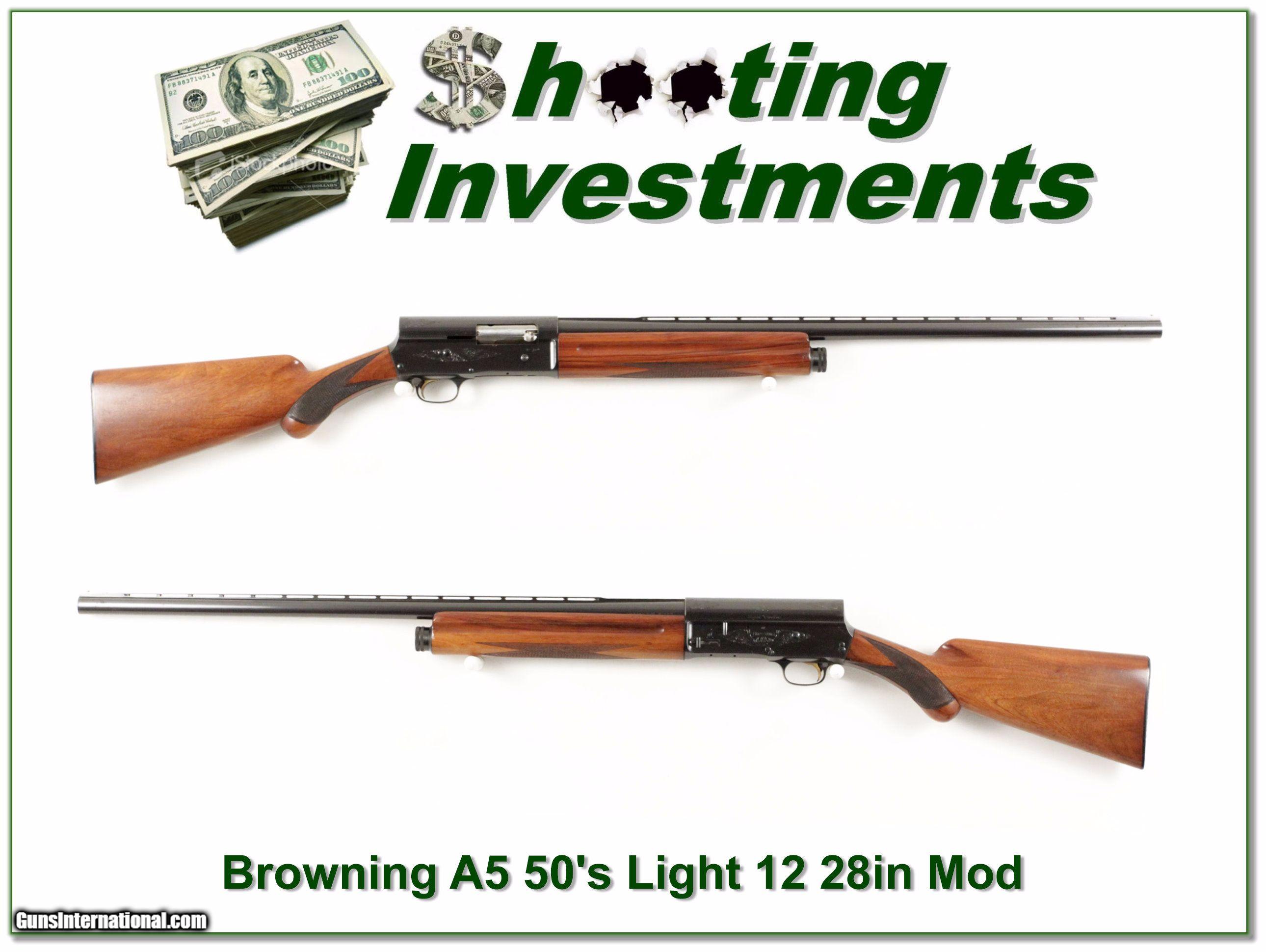 Description: This is an excellent condition Browning A5 Light 12. It was made in Belgium in 1957 and has beautiful rust blue. The barrel is a Vent Rib 28in Modified. The wood has only a few minor marks and the horn butt plate is excellent. It will make a super nice classic field gun or fine addition to your collection. In either case it is a real Shooing Investment! Shipping and insurance is $39. Please email me with any questions or larger pictures. (Consign your quality firearms with Shooting Investments for only 10%! Let me know if you have any you would like to sell!) 17-1115 Payment: Payment is by Money Order, Cashiers Check or Personal Check. I can now also accept MasterCard and Visa with a 3% convenience fee. PayPal can be used for some items but never firearms. Please let us know if you would like to pay via PayPal. Shipping: The shipping charge will be listed in each description. It is $39 for most long guns and $29 for most handguns. Some heavy guns or those insured for over $2000 will be higher. Shipments to Alaska and Hawaii are higher because air shipment is required. Most firearms are shipped on Tuesday and Thursday and usually in 5 days of receipt of payment. We package all shipments carefully and insure them. For long guns you can purchase a new Plano case for $19. They now cost us $22 when buying 100 at a time. Optics are shipped Priority Mail and most other non-firearm shipments are shipped First Class. Returns: Our return policy is simple. If for any reason you are not pleased with your purchase, you may return your item for a full refund of purchase price. Ammunition cannot be returned. It is important to us that you are happy. Guns cannot be fired or dissembled before returning them and they must be returned in the same condition as received. Notification of a return must occur with-in 3 days of receipt at your dealer. Shipping, convenience and dealer fees are not refundable and are the responsibility of the buyer. Lay-a-way: If needed, we offer a 60 day lay-a-way option on most firearms. It is 1/3 now, 1/3 in 30 days and 1/3 in 60 days. Lay-a-way firearm sales are final and if not completed the first payment cannot be returned. Consigning your firearms with Shooting Investments: We will help you get top dollar for your firearms. While most local guns shops charge 20% or more, our fee is only 10% with a minimum of $75. At your local gun shop it might take months to sell. Selling on-line provides instant access to thousands of interested buyers. You won’t find any other on-line dealer willing to sell your firearms for only 10% or listing every gun on 3 separate s. Selling through an House typically costs the seller 15% and the buyer an addition 15% (so 30%) and you have to wait several months to sell and longer to receive funds. If properly priced, we will sell your firearms in a few weeks. Send us an email or give us a call and we’ll explain how easy it is for you to get top dollar. Trading: Trading for use is really just buying your gun to re-sell. If you have a gun you want to trade, please email a picture and we will let you know what we can give or it. You will always get more if we sell it for you on consignment. Help for California Buyers: We are happy to ship to California. It is the buyer’s responsibility to make sure any item you buy is legal in your state. We are also happy to help with your purchase of a firearm from someone other than us. If you see a gun you would like to buy but the seller can’t or won’t ship to California they can ship to use and we’ll then ship it to your California dealer. The cost for this service is only $30 + shipping. Let us know if we can help! SOLD |