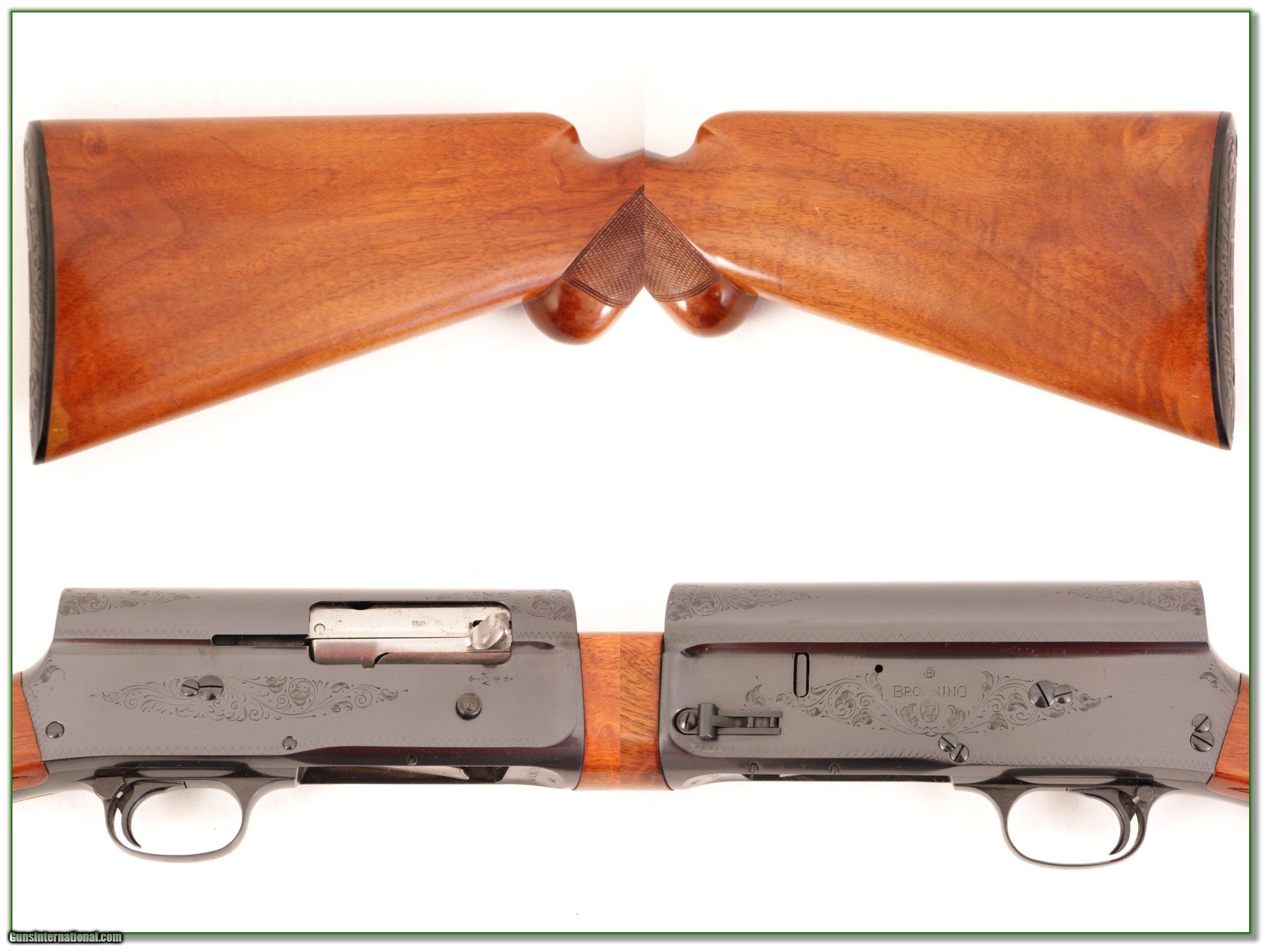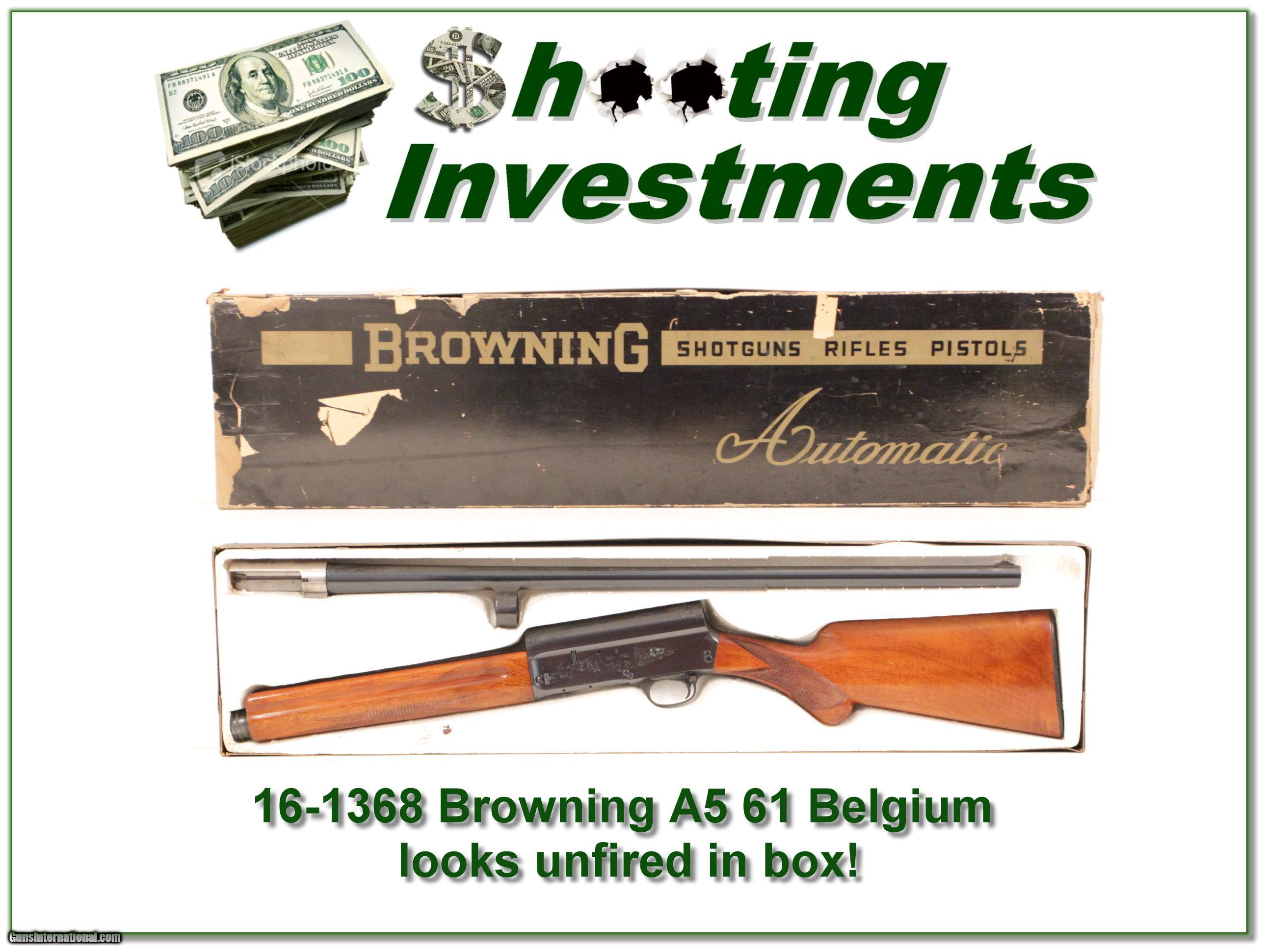 Description: Collectors this a Browning A5 Light 12 made in Belgium in 1961! I believe it is unfired! It comes in box as shown. I am sure original although the end label is partly missing. The blue is perfect and I find only one small mark on the stock. These are HARD to find like this and it will make a find addition to your collection. The barrel is a 28in Modified. Shipping and insurance is $35. Please email me with any questions or larger pictures. (I now consign quality firearms only 10%! Let me know if you have any you would like to sell!) [16-1368] Payment: Payment is by Money Order, Cashiers Check or Personal Check. I can now also accept MasterCard and Visa with a 3% convenience fee. PayPal can be used for some items but never firearms. Please let us know if you would like to pay via PayPal. Shipping: The shipping charge will be listed in each description. It is $35 for most guns. Some heavy guns or those insured for over $2000 will be higher. Shipments to Alaska and Hawaii are higher because air shipment is required. Most firearms are shipped within 5 days of receipt of payment. We prefer shipping at the beginning of the week to avoid firearms in transit over weekends. We package all shipments carefully and insure them for the full purchase price, rounded up to the next $100. In the unlikely event that damage occurs, it is important that you save all packaging material for the claims process. Optics are shipped Priority Mail and most other non-firearm shipments are shipped First Class. Returns: Our return policy is simple. If for any reason you are not pleased with your purchase, you may return your item for a refund. The only exception is ammunition, it cannot be returned. It is important to us that you are happy. Guns cannot be fired or dissembled before returning them and must be returned in the same condition as received. Notification of a return must occur with-in 3 days of receipt at your dealer. Shipping, convenience and dealer fees are not refundable and are the responsibility of the buyer. Lay-a-way: If needed, we offer a 60 day lay-a-way option on most firearms. It is 1/3 now, 1/3 in 30 days and 1/3 in 60 days. Lay-a-way firearm sales are final. Consigning your firearms with Shooting Investments: We will help you get top dollar for your firearms. While most local guns shops charge 20% or more, our fee is only 10% with a minimum of $50. At your local gun shop it might take months to sell. Selling on-line provides instant access to thousands of interested buyers. You won’t find any other on-line dealer willing to sell your firearms for only 10% or listing every gun on 4 separate s. Selling through an House typically costs the seller 15% and the buyer an addition 15% (so 30%) and you have to wait several months to sell and longer to receive funds. If properly priced, we will sell your firearms in a week or two. Send us an email or give us a call and we’ll explain how easy it is for you to get top dollar. Trading: We collect guns and usually just trade for guns we want to add to our collections. We often sell guns for others wanting to purchase one of ours. We find this the most fair to both of us. Our Commission is only 10% and we hold the gun you want until yours sells. Please contact us if you want to sell one of yours to buy one of ours. Help for California Buyers: We are happy to ship to California. It is the buyer’s responsibility to make sure any item you buy is legal in your state. We are also happy to help with your purchase of a firearm from someone other than us. If you see a gun you would like to buy but the seller can’t or won’t ship to California we can help. You buy the gun and have it shipped to us. We’ll then ship it to your California dealer. The cost for this service is only $30 + shipping. Let me know if we can help! SOLD |