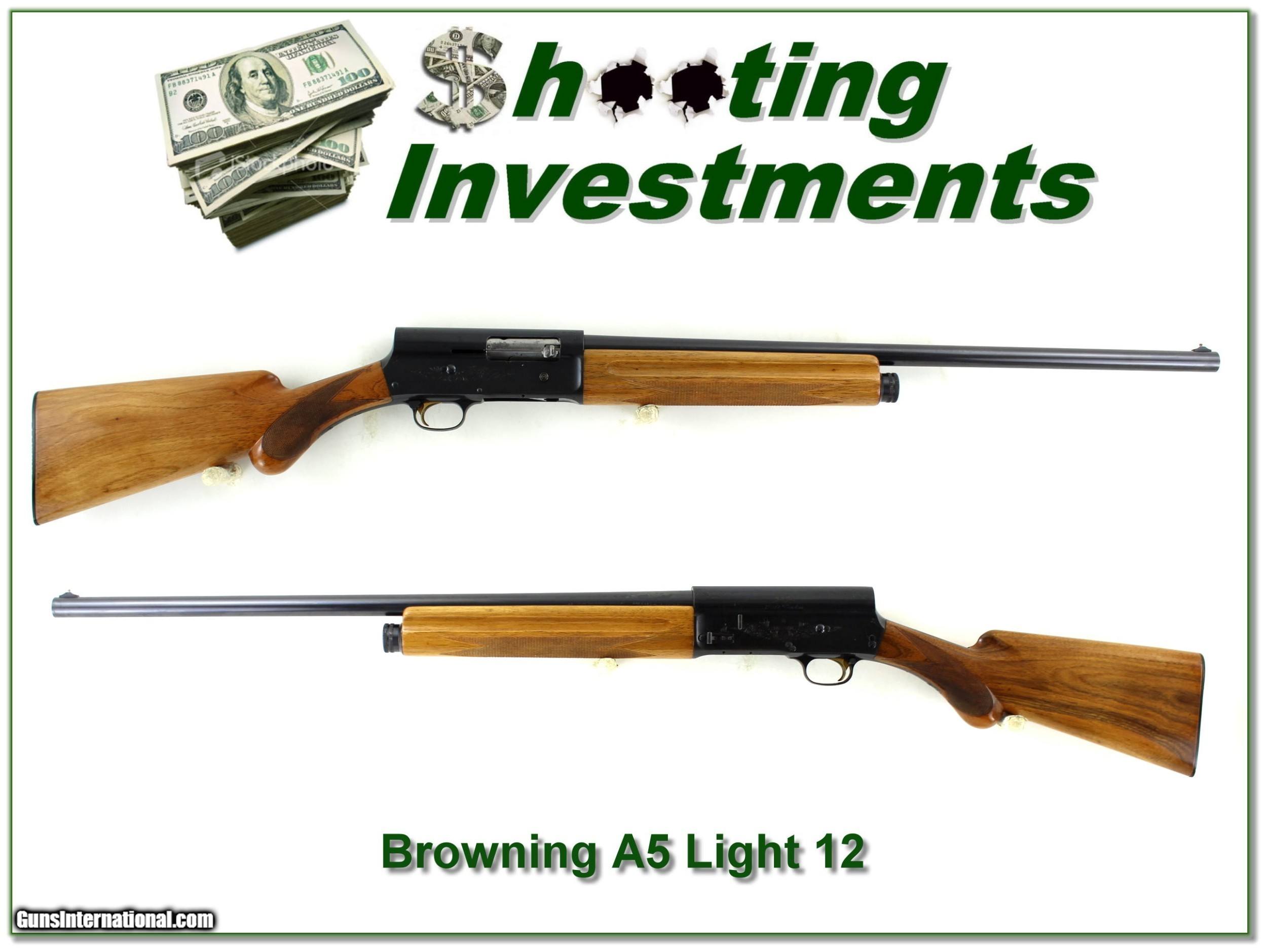 Description: This is a beautiful 1964 Belgium made Browning A5 Light 12. These 1964 guns seem to have the lightest blond wood of them all. And this one has extra nice wood! I find only a couple insignificant marks on it. You will look hard to find nicer wood. The barrel is a 26in IC choke. I find some freckles on the receiver from likely damp storage. It will make an impressive A5 for the field! Shipping and insurance is $49. Please email me with any questions or larger pictures. (Consign your quality firearms with Shooting Investments for only 12%! Let me know if you have any you would like to sell!) 22-0306 Payment: Payment is by Money Order, Cashiers Check or Personal Check. I can now also accept Credit Cards (MasterCard, Visa, Discover & American Express) with a 3% convenience fee. Shipping: The shipping charge will be listed in each description. It is $49 for most long guns. Some heavy guns, over 48in boxes or those insured for over $2000 will be higher. Shipments to Alaska and Hawaii are higher because air shipment is required. Most firearms are shipped on Tuesday and Thursday and usually in 5 days of receipt of payment. We package all shipments carefully and insure them. Optics are shipped Priority Mail and most other non-firearm shipments are shipped First Class. Returns: Our return policy is simple. If for any reason you are not pleased with your purchase, you may return your item for a full refund of purchase price. Ammunition cannot be returned. It is important to us that you are happy. Guns cannot be fired or dissembled before returning them and they must be returned in the same condition as received. Notification of a return must occur with-in 3 days of receipt at your dealer. Shipping, convenience and dealer fees are not refundable and are the responsibility of the buyer. Lay-a-way: If needed, we offer a 60 day lay-a-way option on most firearms. It is 1/3 now, 1/3 in 30 days and 1/3 in 60 days. Lay-a-way firearm sales are final and if not completed the first payment cannot be returned. Consigning your firearms with Shooting Investments: We will help you get top dollar for your firearms. While most local guns shops charge 20% or more, our fee is only 12% with a minimum of $75. At your local gun shop it might take months to sell. Selling on-line provides instant access to thousands of interested buyers. You won’t find any other on-line dealer willing to sell your firearms for only 12% or listing every gun on 3 separate s. Selling through an House typically costs the seller 15% and the buyer an addition 15% (so 30%) and you have to wait several months to sell and longer to receive funds. If properly priced, we will sell your firearms in a few weeks. Send us an email or give us a call and we’ll explain how easy it is for you to get top dollar. Trading: Trading for use is really just buying your gun to re-sell. If you have a gun you want to trade, please email a picture and we will let you know what we can give or it. You will always get more if we sell it for you on consignment. Help for California Buyers: We are happy to ship to California. It is the buyer’s responsibility to make sure any item you buy is legal in your state. We are also happy to help with your purchase of a firearm from someone other than us. If you see a gun you would like to buy but the seller can’t or won’t ship to California they can ship to use and we’ll then ship it to your California dealer. The cost for this service is only $30 + shipping. Let us know if we can help! SOLD |