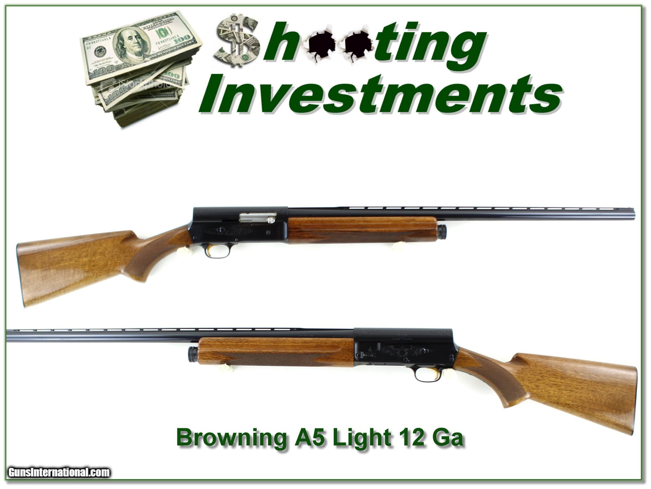 Description: This is a like new condition 1970 Belgium made Browning A5 Light 12. From the bolt face it looks to be unfired. It has a Vent Rib 28in Modified barrel. I see no marks or signs if use! I am selling this one on consignment and as such lay-a-way can’t be used. It does of course have the standard 3-day inspection. Shipping and insurance is $39. Please email me with any questions or larger pictures. (Consign your quality firearms with Shooting Investments for only 12%! Let me know if you have any you would like to sell!) 20-0085 Payment: Payment is by Money Order, Cashiers Check or Personal Check. I can now also accept Credit Cards (MasterCard, Visa, Discover & American Express) with a 3% convenience fee. PayPal can be used for some items but never for firearms. Shipping: The shipping charge will be listed in each description. It is $39 for most firearms. Some heavy guns or those insured for over $2000 will be higher. Shipments to Alaska and Hawaii are higher because air shipment is required. Most firearms are shipped on Tuesday and Thursday and usually in 5 days of receipt of payment. We package all shipments carefully and insure them. Optics are shipped Priority Mail and most other non-firearm shipments are shipped First Class. Returns: Our return policy is simple. If for any reason you are not pleased with your purchase, you may return your item for a full refund of purchase price. Ammunition cannot be returned. It is important to us that you are happy. Guns cannot be fired or dissembled before returning them and they must be returned in the same condition as received. Notification of a return must occur with-in 3 days of receipt at your dealer. Shipping, convenience and dealer fees are not refundable and are the responsibility of the buyer. Lay-a-way: If needed, we offer a 60 day lay-a-way option on most firearms. It is 1/3 now, 1/3 in 30 days and 1/3 in 60 days. Lay-a-way firearm sales are final and if not completed the first payment cannot be returned. Consigning your firearms with Shooting Investments: We will help you get top dollar for your firearms. While most local guns shops charge 20% or more, our fee is only 12% with a minimum of $75. At your local gun shop it might take months to sell. Selling on-line provides instant access to thousands of interested buyers. You won’t find any other on-line dealer willing to sell your firearms for only 12% or listing every gun on 3 separate s. Selling through an House typically costs the seller 15% and the buyer an addition 15% (so 30%) and you have to wait several months to sell and longer to receive funds. If properly priced, we will sell your firearms in a few weeks. Send us an email or give us a call and we’ll explain how easy it is for you to get top dollar. Trading: Trading for use is really just buying your gun to re-sell. If you have a gun you want to trade, please email a picture and we will let you know what we can give or it. You will always get more if we sell it for you on consignment. Help for California Buyers: We are happy to ship to California. It is the buyer’s responsibility to make sure any item you buy is legal in your state. We are also happy to help with your purchase of a firearm from someone other than us. If you see a gun you would like to buy but the seller can’t or won’t ship to California they can ship to use and we’ll then ship it to your California dealer. The cost for this service is only $30 + shipping. Let us know if we can help! SOLD |