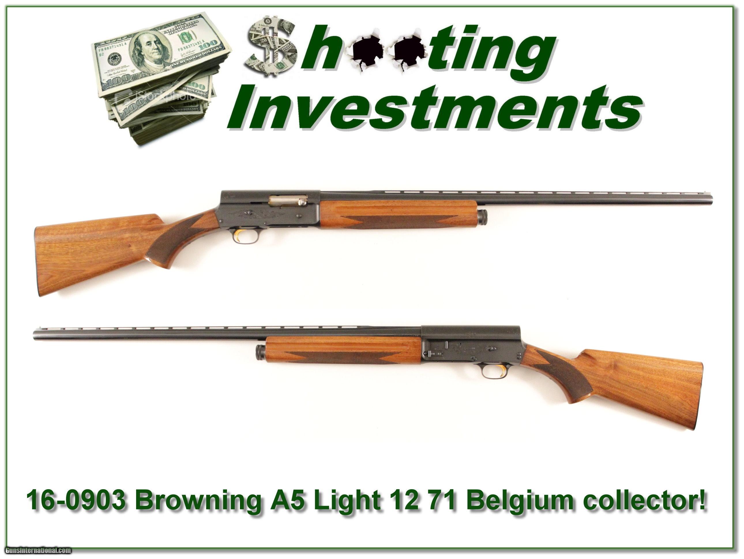 Description: This is a Browning A5 Light 12. It was made I Belgium in 1971 and is in excellent collector condition. I am sure never fired more than a few shells. It has a Vent Rib 30in full barrels. The wood is a nice honey color with a lot of character. This is a real Shooting Investment! Shipping and insurance is $35 or $15 more if you want it shipped in a new Plano hard case. Please email me with any questions or larger pictures. (I now consign quality firearms only 10%! Let me know if you have any you would like to sell!) [16-0903] Payment: Payment is by Money Order, Cashiers Check or Personal Check. I can now also accept MasterCard and Visa with a 3% convenience fee. PayPal can be used for some items but never firearms. Please let us know if you would like to pay via PayPal. Shipping: The shipping charge will be listed in each description. It is $35 for most guns. Some heavy guns or those insured for over $2000 will be higher. Shipments to Alaska and Hawaii are higher because air shipment is required. Most firearms are shipped within 5 days of receipt of payment. We prefer shipping at the beginning of the week to avoid firearms in transit over weekends. We package all shipments carefully and insure them for the full purchase price, rounded up to the next $100. In the unlikely event that damage occurs, it is important that you save all packaging material for the claims process. Optics are shipped Priority Mail and most other non-firearm shipments are shipped First Class. Returns: Our return policy is simple. If for any reason you are not pleased with your purchase, you may return your item for a refund. The only exception is ammunition, it cannot be returned. It is important to us that you are happy. Guns cannot be fired or dissembled before returning them and must be returned in the same condition as received. Notification of a return must occur with-in 3 days of receipt at your dealer. Shipping, convenience and dealer fees are not refundable and are the responsibility of the buyer. Lay-a-way: If needed, we offer a 60 day lay-a-way option on most firearms. It is 1/3 now, 1/3 in 30 days and 1/3 in 60 days. Lay-a-way firearm sales are final. Consigning your firearms with Shooting Investments: We will help you get top dollar for your firearms. While most local guns shops charge 20% or more, our fee is only 10% with a minimum of $50. At your local gun shop it might take months to sell. Selling on-line provides instant access to thousands of interested buyers. You won’t find any other on-line dealer willing to sell your firearms for only 10% or listing every gun on 4 separate s. Selling through an House typically costs the seller 15% and the buyer an addition 15% (so 30%) and you have to wait several months to sell and longer to receive funds. If properly priced, we will sell your firearms in a week or two. Send us an email or give us a call and we’ll explain how easy it is for you to get top dollar. Trading: We collect guns and usually just trade for guns we want to add to our collections. We often sell guns for others wanting to purchase one of ours. We find this the most fair to both of us. Our Commission is only 10% and we hold the gun you want until yours sells. Please contact us if you want to sell one of yours to buy one of ours. Help for California Buyers: We are happy to ship to California. It is the buyer’s responsibility to make sure any item you buy is legal in your state. We are also happy to help with your purchase of a firearm from someone other than us. If you see a gun you would like to buy but the seller can’t or won’t ship to California we can help. You buy the gun and have it shipped to us. We’ll then ship it to your California dealer. The cost for this service is only $30 + shipping. Let me know if we can help! SOLD |