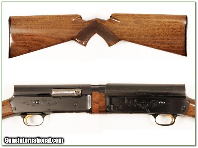 Description: This is an A5 Light 12 made in Belgium in 1972. It is all original with light use and a vent rib full choked barrel. It will make a nice gun you can use yet still expect to increase in value over time. That’s what a Shooting Investment is. Shipping and insurance is $30 or $18 more if you want it shipped in a new Plano hard case. (I now consign quality firearms only 10%! Let me know if you have any you would like to sell!) [13-954] Terms & Conditions Payment: Payment is by Money Order, Cashiers Check or Personal Check. I can now also accept MasterCard and Visa with a 3% convenience fee. PayPal can be used for some items but never firearms. Please let us know if you would like to pay via PayPal. Shipping: The shipping charge will be listed in each description. It is $30 for most guns. Some heavy guns or those insured for over $2000 may be higher. Shipments to Alaska and Hawaii are higher because air shipment is required. Most firearms are shipped within 5 days of receipt of payment. We prefer shipping at the beginning of the week to avoid firearms in transit over weekends. We package all shipments carefully and insure them for the full purchase price, rounded up to the next $100. In the unlikely event that damage occurs, it is important that you save all packaging material for the claims process. Optics are shipped Priority Mail and most other non-firearm shipments are shipped First Class. Returns: Our return policy is simple. If for any reason you are not pleased with your purchase, you may return your item for a refund. The only exception is ammunition, it cannot be returned. It is important to us that you are happy. Guns cannot be fired or dissembled before returning them and must be returned in the same condition as received. Notification of a return must occur with-in 3 days of receipt at your dealer. Shipping, convenience and dealer fees are not refundable and are the responsibility of the buyer. Lay-a-way: If needed, we offer a 60 day lay-a-way option on most firearms. It is 1/3 now, 1/3 in 30 days and 1/3 in 60 days. Lay-a-way firearm sales are final. Consigning your firearms with Shooting Investments: We will help you get top dollar for your firearms. While most local guns shops charge 20% or more, our fee is only 10% with a minimum of $50. At your local gun shop it might take months to sell. Selling on-line provides instant access to thousands of interested buyers. You won’t find any other on-line dealer willing to sell your firearms for only 10% or listing every gun on 4 separate s. Selling through an House typically costs 15% and you have to wait several months to sell and longer to receive funds. If properly priced, we will sell your firearms in a week or two. Send us an email or give us a call and we’ll explain how easy it is for you to get top dollar. Trading: We collect guns and usually just trade for guns we want to add to our collections. We often sell guns for others wanting to purchase one of ours. We find this the most fair to both of us. Our Commission is only 10% and we hold the gun you want until yours sells. Please contact us if you want to sell one of yours to buy one of ours. Help for California Buyers: We are happy to ship to California. It is the buyer’s responsibility to make sure any item you buy is legal in your state. We are also happy to help with your purchase of a firearm from someone other than us. If you see a gun you would like to buy but the seller can’t or won’t ship to California we can help. You buy the gun and have it shipped to us. We’ll then ship it to your California dealer. The cost for this service is only $30 + shipping. Let me know if we can help! SOLD |