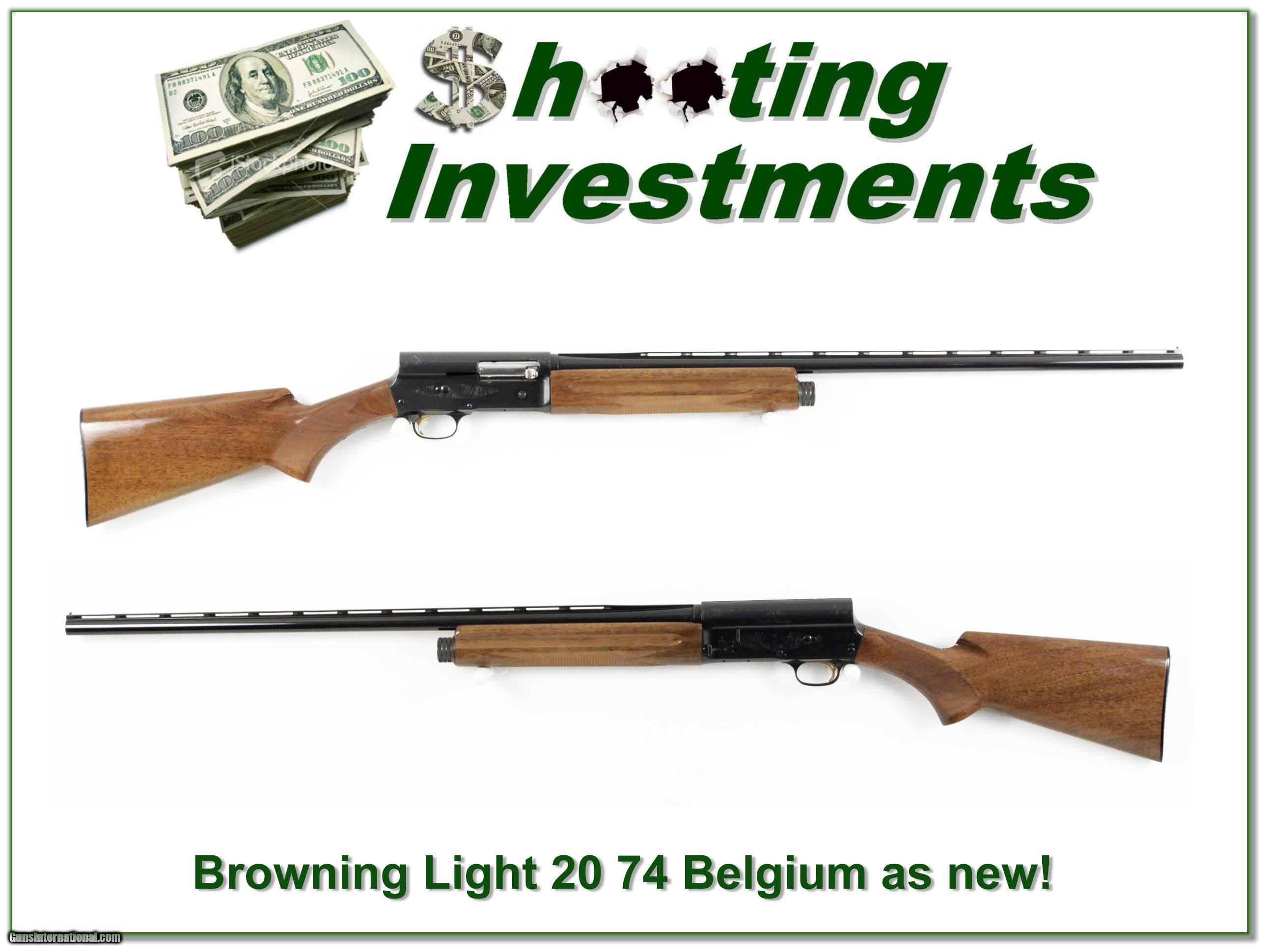 Description: Collectors, this is a near new 1974 Belgium made Browning Light 20. The blue is mint and the barrel is a 28in Vent Rib Modified. I see only a couple insignificant storage marks on the honey colored wood. It will be hard to find a nicer one! Shipping and insurance is $45 or $15 more if you want it shipped in a new Plano hard case. Please email me with any questions or larger pictures. (Consign your quality firearms with Shooting Investments for only 10%! Let me know if you have any you would like to sell!) 17-0430 Payment: Payment is by Money Order, Cashiers Check or Personal Check. I can now also accept MasterCard and Visa with a 3% convenience fee. PayPal can be used for some items but never firearms. Please let us know if you would like to pay via PayPal. Shipping: The shipping charge will be listed in each description. It is $35 for most guns. Some heavy guns or those insured for over $2000 will be higher. Shipments to Alaska and Hawaii are higher because air shipment is required. Most firearms are shipped within 5 days of receipt of payment. We prefer shipping at the beginning of the week to avoid firearms in transit over weekends. We package all shipments carefully and insure them for the full purchase price, rounded up to the next $100. In the unlikely event that damage occurs, it is important that you save all packaging material for the claims process. Optics are shipped Priority Mail and most other non-firearm shipments are shipped First Class. Returns: Our return policy is simple. If for any reason you are not pleased with your purchase, you may return your item for a refund. The only exception is ammunition, it cannot be returned. It is important to us that you are happy. Guns cannot be fired or dissembled before returning them and must be returned in the same condition as received. Notification of a return must occur with-in 3 days of receipt at your dealer. Shipping, convenience and dealer fees are not refundable and are the responsibility of the buyer. Lay-a-way: If needed, we offer a 60 day lay-a-way option on most firearms. It is 1/3 now, 1/3 in 30 days and 1/3 in 60 days. Lay-a-way firearm sales are final. Consigning your firearms with Shooting Investments: We will help you get top dollar for your firearms. While most local guns shops charge 20% or more, our fee is only 10% with a minimum of $50. At your local gun shop it might take months to sell. Selling on-line provides instant access to thousands of interested buyers. You won’t find any other on-line dealer willing to sell your firearms for only 10% or listing every gun on 4 separate s. Selling through an House typically costs the seller 15% and the buyer an addition 15% (so 30%) and you have to wait several months to sell and longer to receive funds. If properly priced, we will sell your firearms in a week or two. Send us an email or give us a call and we’ll explain how easy it is for you to get top dollar. Trading: We collect guns and usually just trade for guns we want to add to our collections. We often sell guns for others wanting to purchase one of ours. We find this the most fair to both of us. Our Commission is only 10% and we hold the gun you want until yours sells. Please contact us if you want to sell one of yours to buy one of ours. Help for California Buyers: We are happy to ship to California. It is the buyer’s responsibility to make sure any item you buy is legal in your state. We are also happy to help with your purchase of a firearm from someone other than us. If you see a gun you would like to buy but the seller can’t or won’t ship to California we can help. You buy the gun and have it shipped to us. We’ll then ship it to your California dealer. The cost for this service is only $30 + shipping. Let me know if we can help! SOLD |