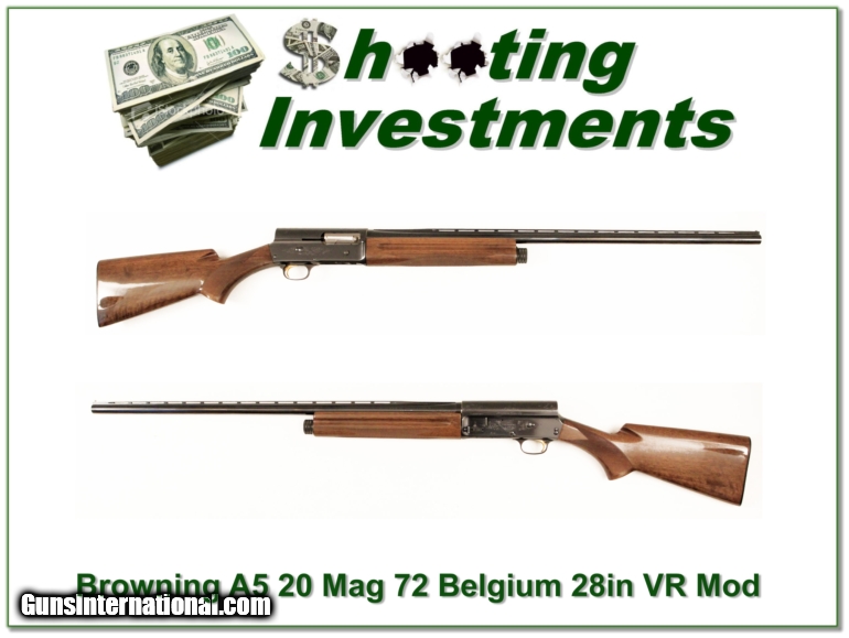 Description: This is a Browning A5 Magnum 20 gauge. It was made in Belgium in 1972. Both 3in and 2 3/4in shells can be used. It is in excellent condition. The blue is near new with no edge, recoil or gold trigger wear. The wood has only a few minor marks. The barrel is a 28in Vent Rib Modified! It will make a nice addition to your collection or be an impressive classic field gun. It is one you can expect to increase in value over time and that makes it a Shooting Investment. I am selling this one on consignment and as such lay-a-way can’t be used. It does of course have the standard 3 day inspection. Shipping and insurance is $30 or $18 more if you want it shipped in a new Plano hard case. Please email me with any questions or larger pictures. (I now consign quality firearms only 10%! Let me know if you have any you would like to sell!) [15-0549] Payment: Payment is by Money Order, Cashiers Check or Personal Check. I can now also accept MasterCard and Visa with a 3% convenience fee. PayPal can be used for some items but never firearms. Please let us know if you would like to pay via PayPal. Shipping: The shipping charge will be listed in each description. It is $30 for most guns. Some heavy guns or those insured for over $2000 may be higher. Shipments to Alaska and Hawaii are higher because air shipment is required. Most firearms are shipped within 5 days of receipt of payment. We prefer shipping at the beginning of the week to avoid firearms in transit over weekends. We package all shipments carefully and insure them for the full purchase price, rounded up to the next $100. In the unlikely event that damage occurs, it is important that you save all packaging material for the claims process. Optics are shipped Priority Mail and most other non-firearm shipments are shipped First Class. Returns: Our return policy is simple. If for any reason you are not pleased with your purchase, you may return your item for a refund. The only exception is ammunition, it cannot be returned. It is important to us that you are happy. Guns cannot be fired or dissembled before returning them and must be returned in the same condition as received. Notification of a return must occur with-in 3 days of receipt at your dealer. Shipping, convenience and dealer fees are not refundable and are the responsibility of the buyer. Lay-a-way: If needed, we offer a 60 day lay-a-way option on most firearms. It is 1/3 now, 1/3 in 30 days and 1/3 in 60 days. Lay-a-way firearm sales are final. Consigning your firearms with Shooting Investments: We will help you get top dollar for your firearms. While most local guns shops charge 20% or more, our fee is only 10% with a minimum of $50. At your local gun shop it might take months to sell. Selling on-line provides instant access to thousands of interested buyers. You won’t find any other on-line dealer willing to sell your firearms for only 10% or listing every gun on 4 separate s. Selling through an House typically costs the seller 15% and the buyer an addition 15% (so 30%) and you have to wait several months to sell and longer to receive funds. If properly priced, we will sell your firearms in a week or two. Send us an email or give us a call and we’ll explain how easy it is for you to get top dollar. Trading: We collect guns and usually just trade for guns we want to add to our collections. We often sell guns for others wanting to purchase one of ours. We find this the most fair to both of us. Our Commission is only 10% and we hold the gun you want until yours sells. Please contact us if you want to sell one of yours to buy one of ours. Help for California Buyers: We are happy to ship to California. It is the buyer’s responsibility to make sure any item you buy is legal in your state. We are also happy to help with your purchase of a firearm from someone other than us. If you see a gun you would like to buy but the seller can’t or won’t ship to California we can help. You buy the gun and have it shipped to us. We’ll then ship it to your California dealer. The cost for this service is only $30 + shipping. Let me know if we can help! SOLD |
