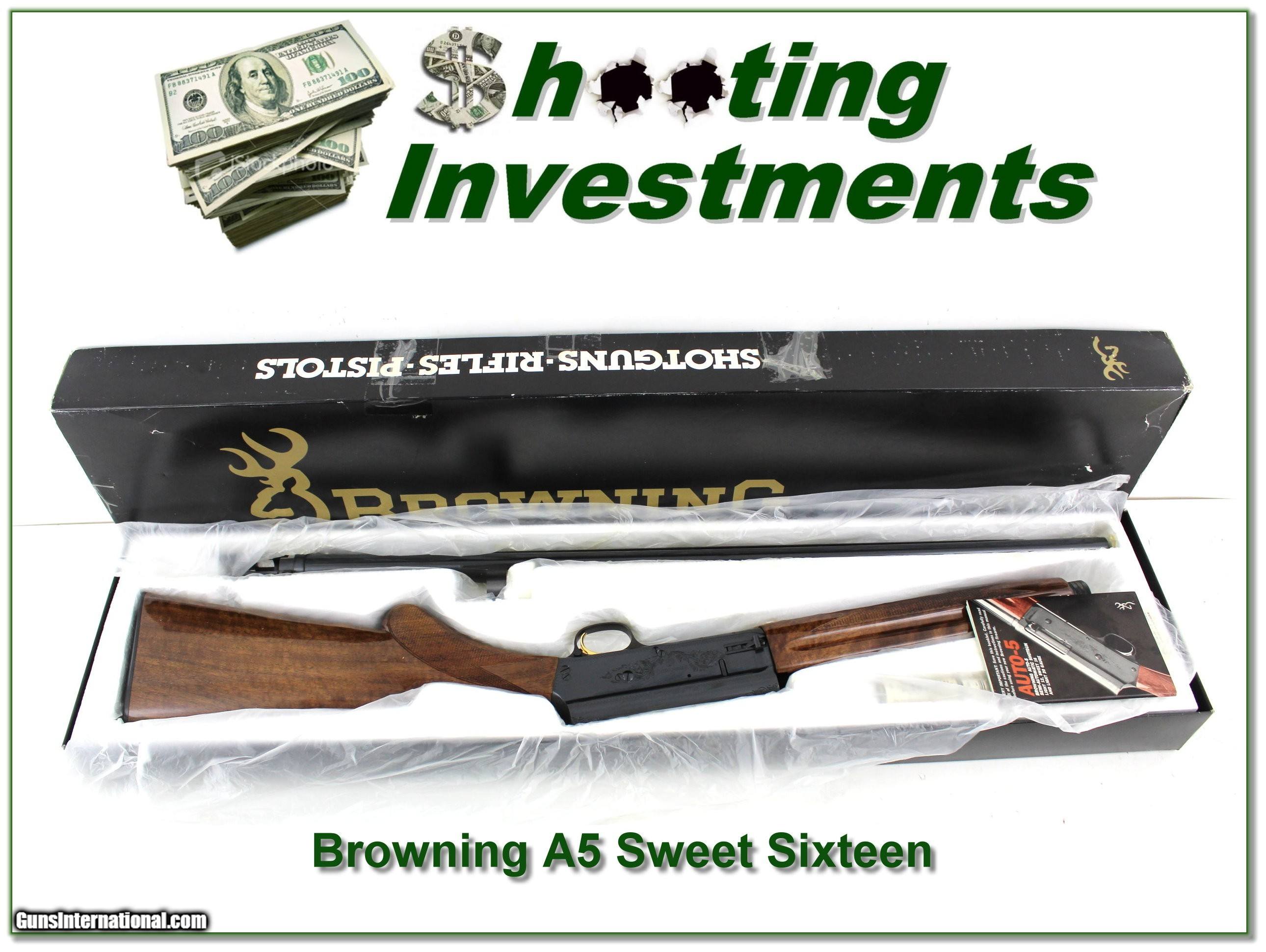 Description: Collectors, shooters and hunters, this is a new and unfired Browning A5 Sweet Sixteen. It has a 26in Vent Rib Invector barrel and comes as seen in box with papers and 3 choke tubes. The wood is much nicer than most. You will look hard to find a nicer one. Shipping and insurance is $59. Please email me with any questions or larger pictures. (Consign your quality firearms with Shooting Investments for only 12%! Let me know if you have any you would like to sell!) 24-0952 Payment: Payment is by Money Order, Cashier’s Check or Personal Check. I can now also accept Credit Cards (MasterCard, Visa, Discover & American Express) with a 3% convenience fee. Shipping: The shipping charge will be listed in each description. It is $49 for most firearms. Some heavy guns or those insured for over $2000 will be higher. Shipments to Alaska and Hawaii are higher because air shipment is required. Most firearms are shipped on Tuesday and Thursday and usually in 5 days of receipt of payment. We package all shipments carefully and insure them. Optics are shipped Priority Mail and most other non-firearm shipments are shipped First Class. Returns: Our return policy is simple. If for any reason you are not pleased with your purchase, you may return your item for a full refund of purchase price. Ammunition cannot be returned. It is important to us that you are happy. Guns cannot be fired or dissembled before returning them and they must be returned in the same condition as received. Notification of a return must occur within 3 days of receipt at your dealer. Shipping, convenience and dealer fees are not refundable and are the responsibility of the buyer. Lay-a-way: If needed, we offer a 60 day lay-a-way option on most firearms. It is 1/3 now, 1/3 in 30 days and 1/3 in 60 days. Lay-a-way firearm sales are final and cannot be returned. If a lay-a-way is not completed the first payment cannot be refunded. Consigning your firearms with Shooting Investments: We will help you get top dollar for your firearms. While most local guns shops charge 20% or more, our fee is only 12% with a minimum of $75. At your local gun shop it might take months to sell. Selling on-line provides instant access to thousands of interested buyers. You won’t find any other on-line dealer willing to sell your firearms for only 12% or listing every gun on 3 separate s. Selling through an House typically costs the seller 15% and the buyer an addition 15% (so 30%) and you have to wait several months to sell and longer to receive funds. If properly priced, we will sell your firearms within a few weeks. Send us an email or give us a call and we’ll explain how easy it is for you to get top dollar. Trading: Trading for us is really just buying your gun to re-sell. If you have a gun you want to trade, please email a picture and we will let you know what we can give for it. You will always get more if we sell it for you on consignment. SOLD |