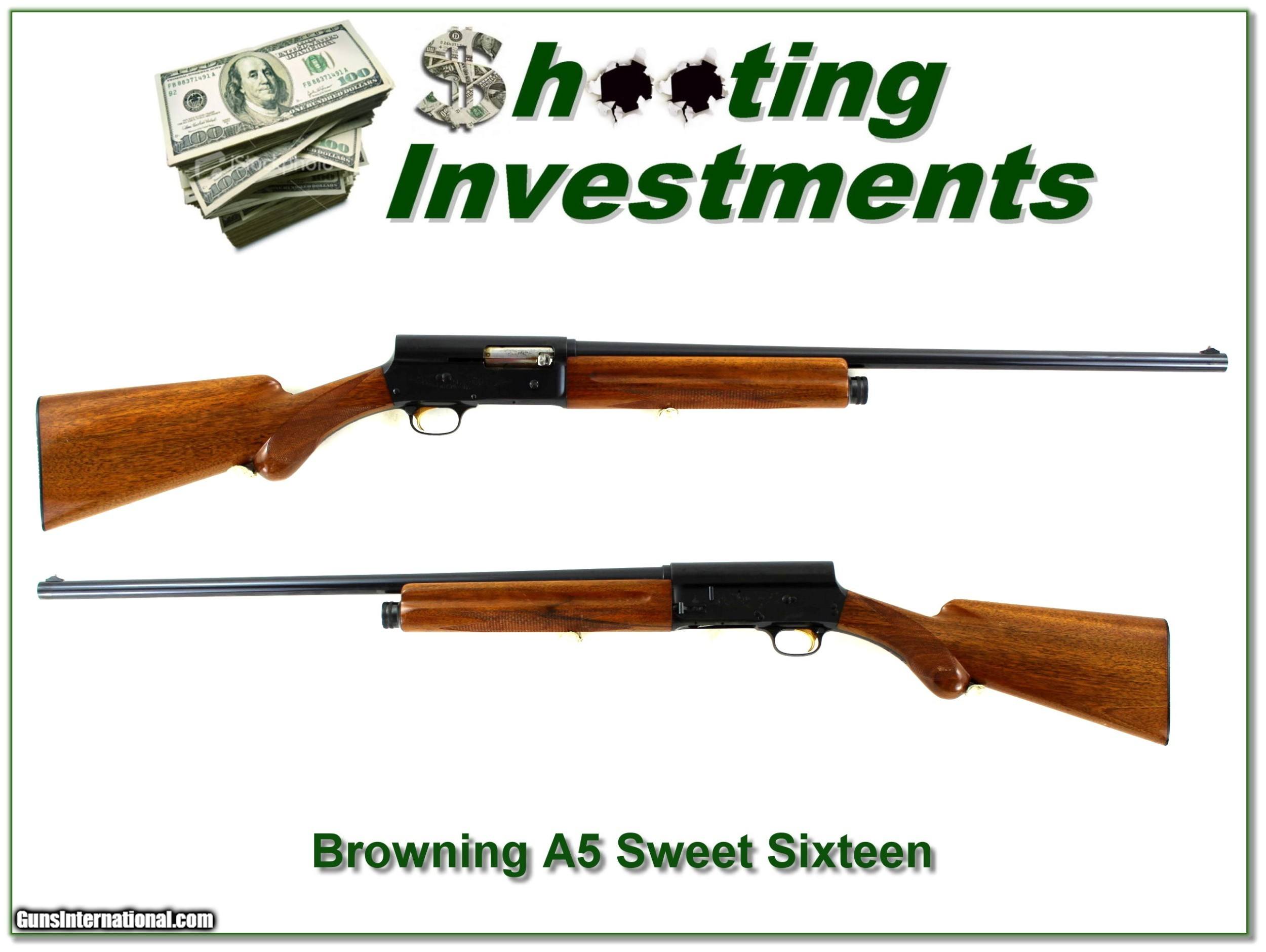 Description: This is a 1964 Belgium made Browning A5 Sweet Sixteen. It has beautiful honey blond wood. The blue has only very light edge carry thinning and no recoil wear. I see no wear to the gold trigger. The wood has a few marks from some use. The barrel is a 28in Modified. This one will make a classic field gun and these A5’s keep going up in value. They are real Shooting Investments! Shipping and insurance is $49. Please email me with any questions or larger pictures. (Consign your quality firearms with Shooting Investments for only 12%! Let me know if you have any you would like to sell!) 22-0668 Payment: Payment is by Money Order, Cashiers Check or Personal Check. I can now also accept Credit Cards (MasterCard, Visa, Discover & American Express) with a 3% convenience fee. Shipping: The shipping charge will be listed in each description. It is $49 for most long guns. Some heavy guns, over 48in boxes or those insured for over $2000 will be higher. Shipments to Alaska and Hawaii are higher because air shipment is required. Most firearms are shipped on Tuesday and Thursday and usually in 5 days of receipt of payment. We package all shipments carefully and insure them. Optics are shipped Priority Mail and most other non-firearm shipments are shipped First Class. Returns: Our return policy is simple. If for any reason you are not pleased with your purchase, you may return your item for a full refund of purchase price. Ammunition cannot be returned. It is important to us that you are happy. Guns cannot be fired or dissembled before returning them and they must be returned in the same condition as received. Notification of a return must occur with-in 3 days of receipt at your dealer. Shipping, convenience and dealer fees are not refundable and are the responsibility of the buyer. Lay-a-way: If needed, we offer a 60 day lay-a-way option on most firearms. It is 1/3 now, 1/3 in 30 days and 1/3 in 60 days. Lay-a-way firearm sales are final and if not completed the first payment cannot be returned. Consigning your firearms with Shooting Investments: We will help you get top dollar for your firearms. While most local guns shops charge 20% or more, our fee is only 12% with a minimum of $75. At your local gun shop it might take months to sell. Selling on-line provides instant access to thousands of interested buyers. You won’t find any other on-line dealer willing to sell your firearms for only 12% or listing every gun on 3 separate s. Selling through an House typically costs the seller 15% and the buyer an addition 15% (so 30%) and you have to wait several months to sell and longer to receive funds. If properly priced, we will sell your firearms in a few weeks. Send us an email or give us a call and we’ll explain how easy it is for you to get top dollar. Trading: Trading for use is really just buying your gun to re-sell. If you have a gun you want to trade, please email a picture and we will let you know what we can give or it. You will always get more if we sell it for you on consignment. Help for California Buyers: We are happy to ship to California. It is the buyer’s responsibility to make sure any item you buy is legal in your state. We are also happy to help with your purchase of a firearm from someone other than us. If you see a gun you would like to buy but the seller can’t or won’t ship to California they can ship to use and we’ll then ship it to your California dealer. The cost for this service is only $30 + shipping. Let us know if we can help! SOLD |