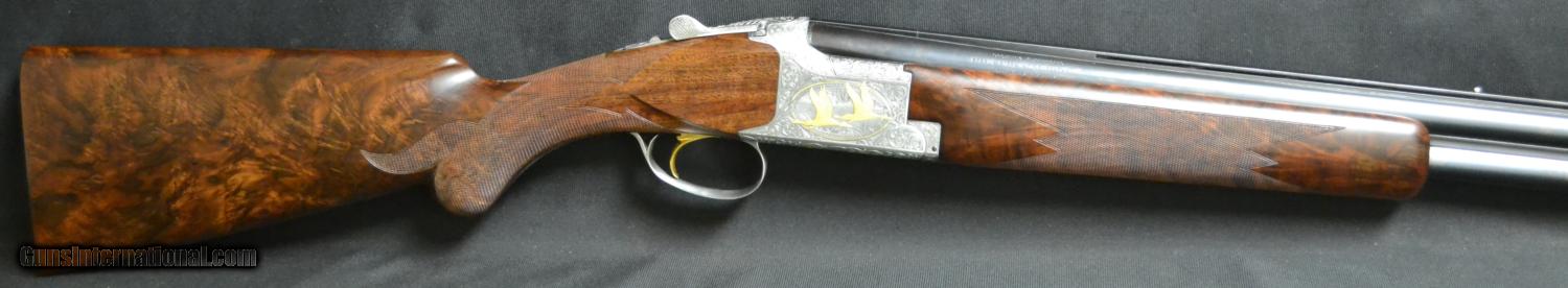 Description: Browning – American Pintail, 12ga., 28" barrels, M/F choked, gorgeous exhibition grade pistol grip walnut stock, skipline checkered butt, highest quality Belgian manufacture, factory Midas pattern checkering on stock, gold single selective trigger, ventilated rib, automatic ejectors, oil finish, engraving features gold inlaid pintail ducks with detailed backgrounds and full coverage scroll, number 386 of 500 manufactured, this gun remains in 100% perfect as-new condition and appears unfired, available for immediate delivery.