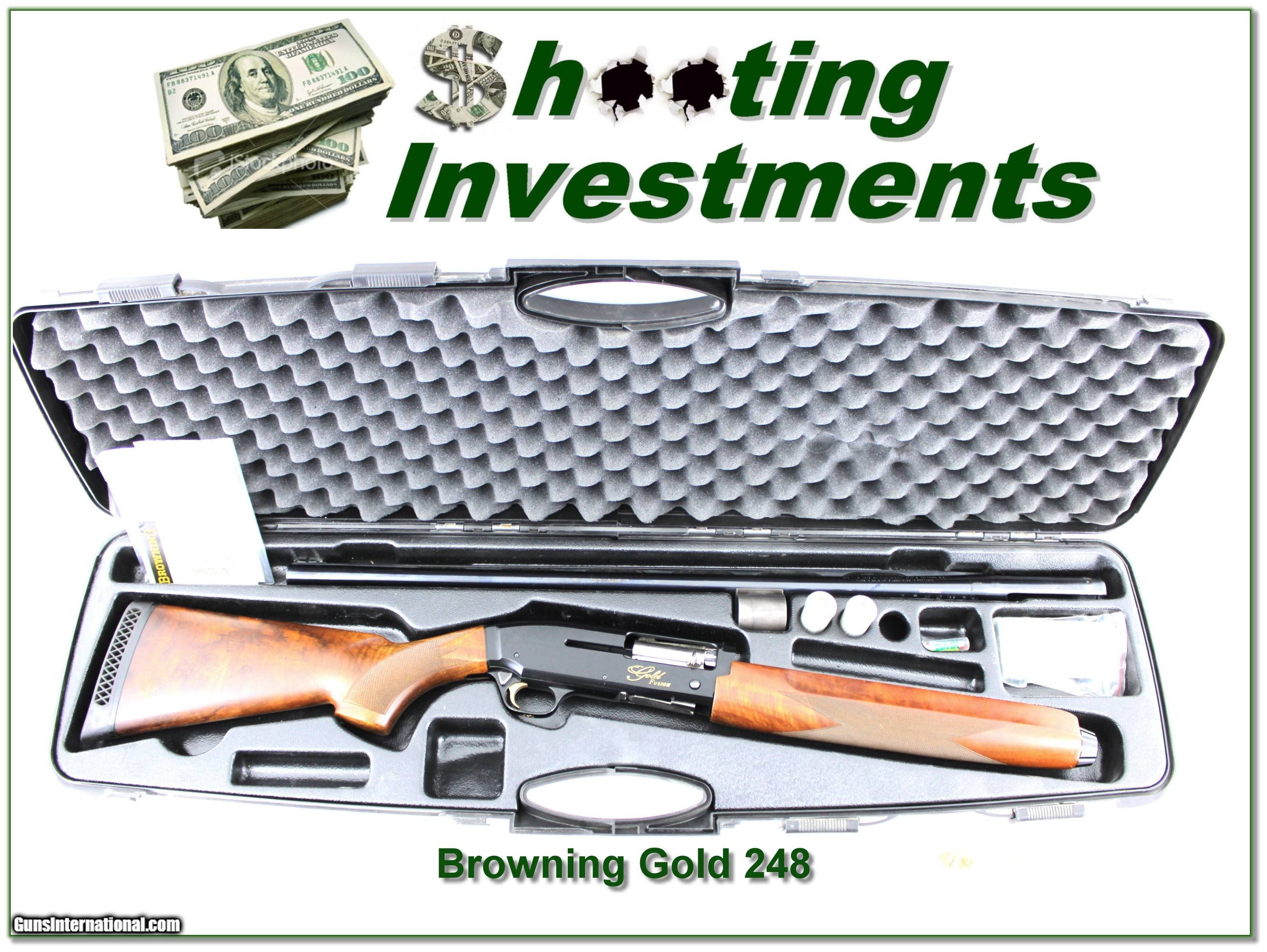 Description: This is a beautiful Browning Gold Fusion 12 Gauge. It has much nicer wood than most and a 26in Vent Rib barrel. It comes in factory case with manual and 3 choke tubes. I find a few marks mostly on the left side of the stock. It will make an excellent gun for the field or range. Shipping and insurance is $49. Please email me with any questions or larger pictures. (Consign your quality firearms with Shooting Investments for only 12%! Let me know if you have any you would like to sell!) 25-0248 Payment: Payment is by Money Order, Cashier’s Check or Personal Check. I can now also accept Credit Cards (MasterCard, Visa, Discover & American Express) with a 3% convenience fee. Shipping: The shipping charge will be listed in each description. It is $49 for most firearms. Some heavy guns or those insured for over $2000 will be higher. Shipments to Alaska and Hawaii are higher because air shipment is required. Most firearms are shipped on Tuesday and Thursday and usually in 5 days of receipt of payment. We package all shipments carefully and insure them. Optics are shipped Priority Mail and most other non-firearm shipments are shipped First Class. Returns: Our return policy is simple. If for any reason you are not pleased with your purchase, you may return your item for a full refund of purchase price. Ammunition cannot be returned. It is important to us that you are happy. Guns cannot be fired or dissembled before returning them and they must be returned in the same condition as received. Notification of a return must occur within 3 days of receipt at your dealer. Shipping, convenience and dealer fees are not refundable and are the responsibility of the buyer. Lay-a-way: If needed, we offer a 60 day lay-a-way option on most firearms. It is 1/3 now, 1/3 in 30 days and 1/3 in 60 days. Lay-a-way firearm sales are final and cannot be returned. If a lay-a-way is not completed the first payment cannot be refunded. Consigning your firearms with Shooting Investments: We will help you get top dollar for your firearms. While most local guns shops charge 20% or more, our fee is only 12% with a minimum of $100. At your local gun shop it might take months to sell. Selling on-line provides instant access to thousands of interested buyers. You won’t find any other on-line dealer willing to sell your firearms for only 12% or listing every gun on 3 separate s. Selling through an House typically costs the seller 15% and the buyer an addition 15% (so 30%) and you have to wait several months to sell and longer to receive funds. If properly priced, we will sell your firearms within a few weeks. Send us an email or give us a call and we’ll explain how easy it is for you to get top dollar. Trading: Trading for us is really just buying your gun to re-sell. If you have a gun you want to trade, please email a picture and we will let you know what we can give for it. You will always get more if we sell it for you on consignment. SOLD |