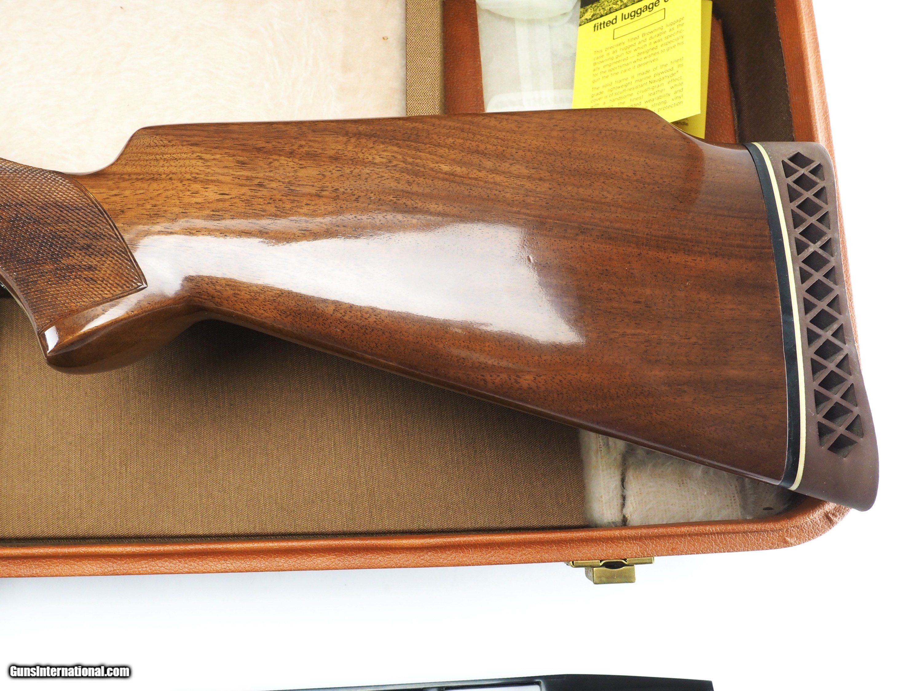 Description: Manufactured in 1978 (RP serial date code), this gun was bought new and stored in preservative. Ad the original owner recently passed away, the gun is now available. As you can see in the photos, the breechface appearance indicates that the in has never been fired. There are, however, a couple of handling marks in the wood as well as a frosty patch at the front face of the forearm wood finish. The gun appears to be completely unmodified, as it left the factory. The ribs have significant convergence with the barrel, indicating a POI of somewhere between 80/20 and 90/10. This will be a real shooter! Both barrels are serial-numbered to the gun. The gun comes complete in its original Browning factory case. Make: Browning Model: BT99 combo Hand: Right Barrel length: 32” + 34” POI: 80/20 to 90/10 range Gauge: 12 34” Barrel bore/choke: .725”/.043” 32” Barrel bore/choke: .726”/.013” LOP: 14 3/8” DAC: 1.3” (33mm) DAMC: 1.34” (34mm) DAH: 2.00” (51mm) Accessories: Browning case pamphlet, case keys Case: original Browning factory 2-barrel SOLD |