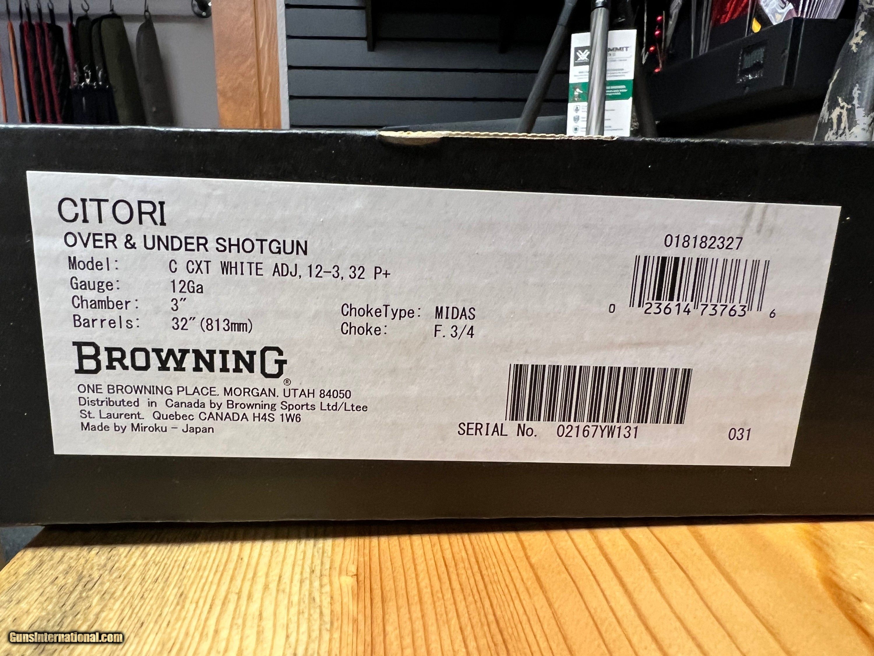 Description: The Browning Citori C CXT White 12g 32" is a crossover gun that leans to Trap, featuring 70/30 POI, floating rib and mid-bead. We are a Browning Gold Dealer... It took over a year to get this into inventory! Don't miss out on this one. Citori CXT Features