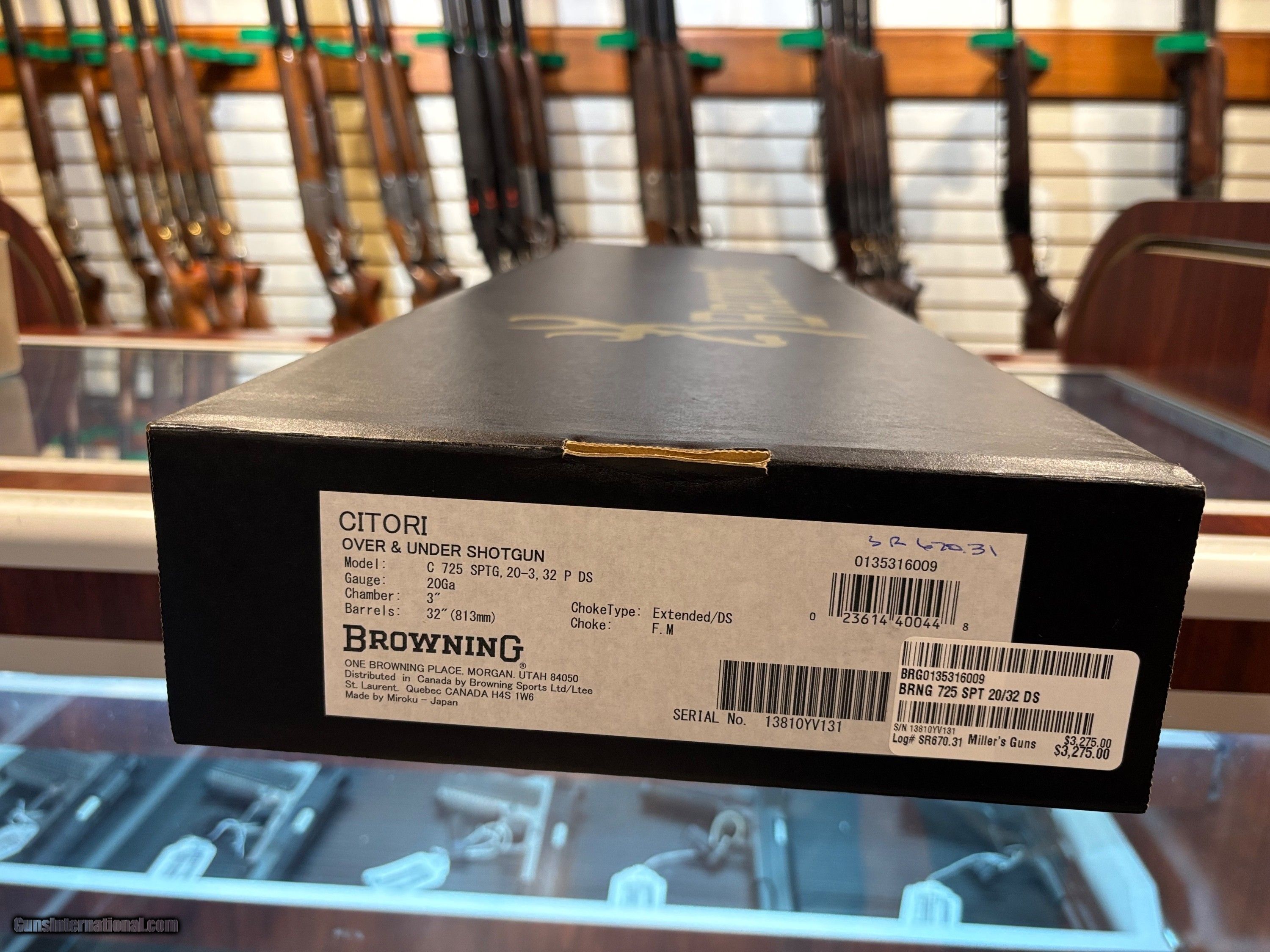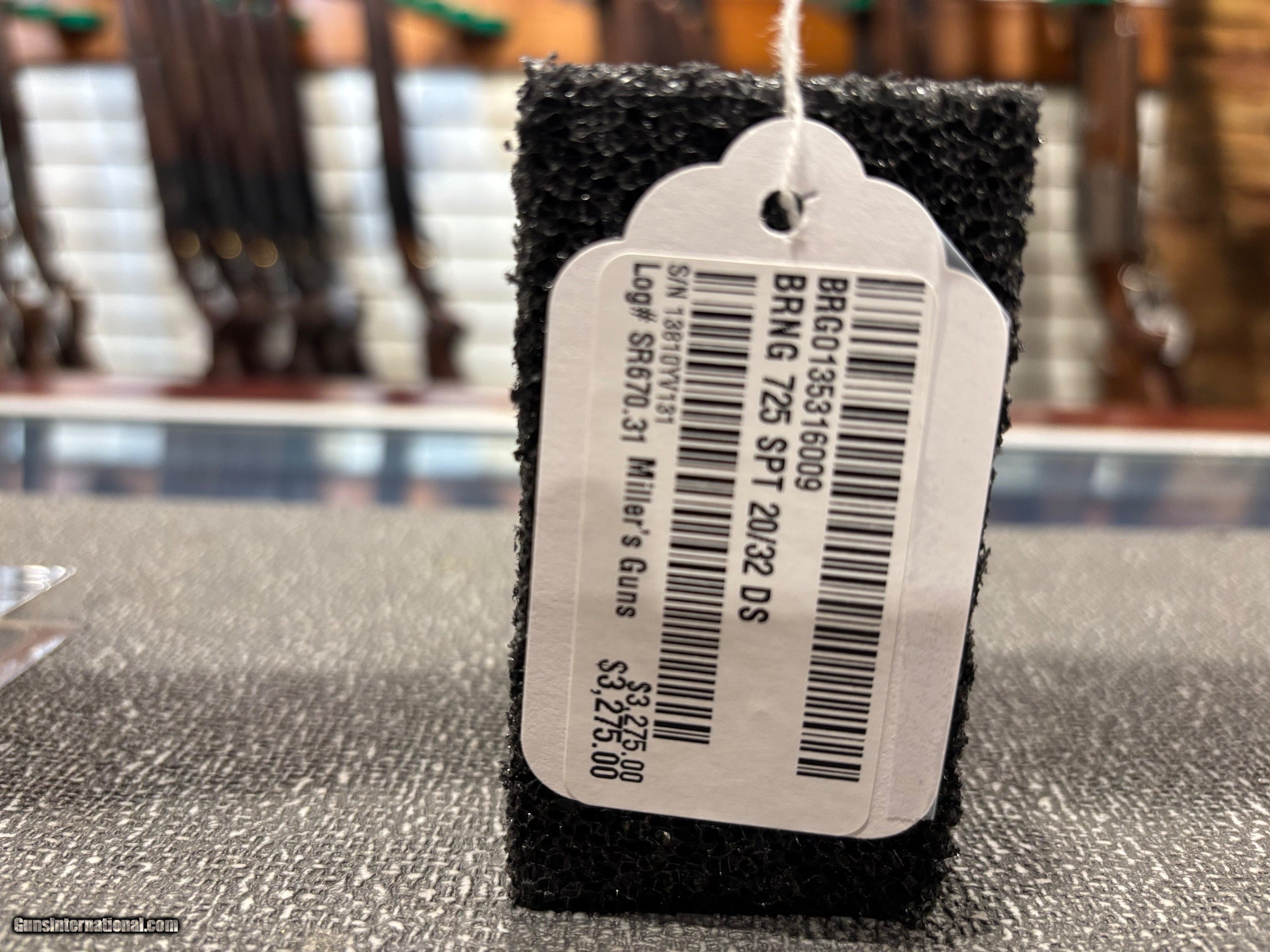 Description: Browning Citori 725 Sporting 20ga 32" barrel 3" chamber 50" OAL 14 3/4" LOP 7lbs 3oz F,IM,M,IC,SK chokes included Shotgun Gauge: 20 Gauge Manufacturer: Browning Model: Citori 725 Sporting Serial Number: 13810YV131 Barrel Length: 32 Condition: NEW Price: $3,275.00 Contact Seller |