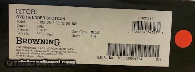 Description: Browning Citori CXS 28 gauge 32" LNIB. Unfired. All accessories. Super clean. Not many 28g CXS around. Do not miss out! Call or email for additional information. SOLD Shotgun Gauge: 28 Gauge Manufacturer: Browning Model: Citori CXS Serial Number: BRJP33050YZ131 Chambers: 2 3/4 Ejectors: Yes Condition: Excellent Metal Condition: Excellent Wood Condition: Excellent Bore Condition: Excellent Triggers: Single Selective Stock Dimensions: 1 1/2" 2 1/4" 14 3/4 Stock Cast: 1/8" off Butt Pad: Factory Original Weight: 7 lbs. Sights: Multiple Hiviz Chokes: IC/IC/M/F Case: Factory Box Item Location: Vermont |