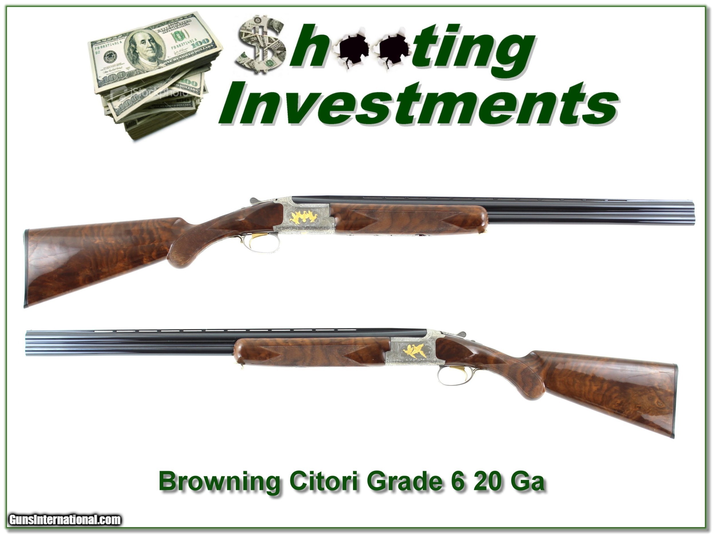 Description: This is a beautiful Citori Grade 6 20 Gauge. It is in new and I believe unfired condition. It has XX Wood and 26in barrels with invector chokes. It has a 3in chamber and shoots bot 2 3/4in and 3in shells. It comes with IC and Mod tubes. It will make a high-end field gun or be a fine addition to your collection. They just don’t make them like they used too! Shipping with insurance is $59. Please email me with any questions or larger pictures. (Consign your quality firearms with Shooting Investments for only 12%! Let me know if you have any you would like to sell!) 20-0684 Payment: Payment is by Money Order, Cashiers Check or Personal Check. I can now also accept Credit Cards (MasterCard, Visa, Discover & American Express) with a 3% convenience fee. Shipping: The shipping charge will be listed in each description. It is $39 for most firearms. Some heavy guns or those insured for over $2000 will be higher. Shipments to Alaska and Hawaii are higher because air shipment is required. Most firearms are shipped on Tuesday and Thursday and usually in 5 days of receipt of payment. We package all shipments carefully and insure them. Optics are shipped Priority Mail and most other non-firearm shipments are shipped First Class. Returns: Our return policy is simple. If for any reason you are not pleased with your purchase, you may return your item for a full refund of purchase price. Ammunition cannot be returned. It is important to us that you are happy. Guns cannot be fired or dissembled before returning them and they must be returned in the same condition as received. Notification of a return must occur with-in 3 days of receipt at your dealer. Shipping, convenience and dealer fees are not refundable and are the responsibility of the buyer. Lay-a-way: If needed, we offer a 60 day lay-a-way option on most firearms. It is 1/3 now, 1/3 in 30 days and 1/3 in 60 days. Lay-a-way firearm sales are final and if not completed the first payment cannot be returned. Consigning your firearms with Shooting Investments: We will help you get top dollar for your firearms. While most local guns shops charge 20% or more, our fee is only 12% with a minimum of $75. At your local gun shop it might take months to sell. Selling on-line provides instant access to thousands of interested buyers. You won’t find any other on-line dealer willing to sell your firearms for only 12% or listing every gun on 3 separate s. Selling through an House typically costs the seller 15% and the buyer an addition 15% (so 30%) and you have to wait several months to sell and longer to receive funds. If properly priced, we will sell your firearms in a few weeks. Send us an email or give us a call and we’ll explain how easy it is for you to get top dollar. Trading: Trading for use is really just buying your gun to re-sell. If you have a gun you want to trade, please email a picture and we will let you know what we can give or it. You will always get more if we sell it for you on consignment. Help for California Buyers: We are happy to ship to California. It is the buyer’s responsibility to make sure any item you buy is legal in your state. We are also happy to help with your purchase of a firearm from someone other than us. If you see a gun you would like to buy but the seller can’t or won’t ship to California they can ship to use and we’ll then ship it to your California dealer. The cost for this service is only $30 + shipping. Let us know if we can help! SOLD |