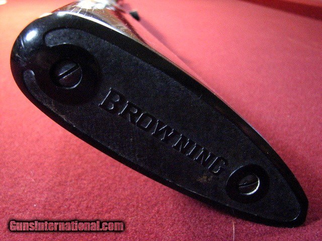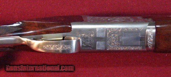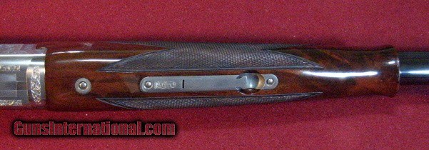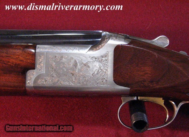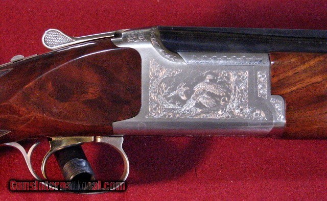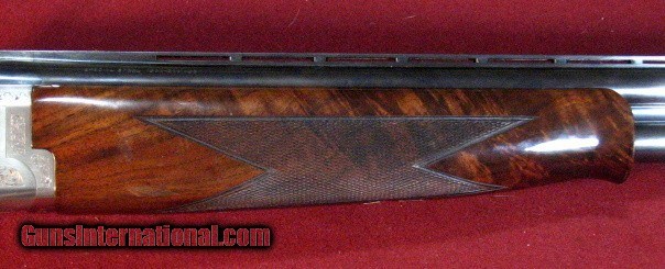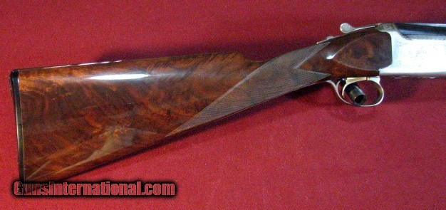 Description: Grade III Browning Superlight in 12 gauge with 26" vent rib ejector barrels with Invector chokes. Manufactured in 1986. Chambers are 2 3/4". French Silver receiver with Mallards engraved on the left and Pheasants on the right. Gold plated single selective trigger. Very highly figured straight grip stock. Schnabel forend also well figured. 14 1/4" LOP to factory buttplate. Weighs 7lb 1oz A very nice gun showing only very minimal handling marks. Pictures show alot of reflection in the high gloss stock finish. Not scuff marks. Remains very tight. Appears to have been fired little if at all. Only two chokes included [IC & Mod] SOLD |
