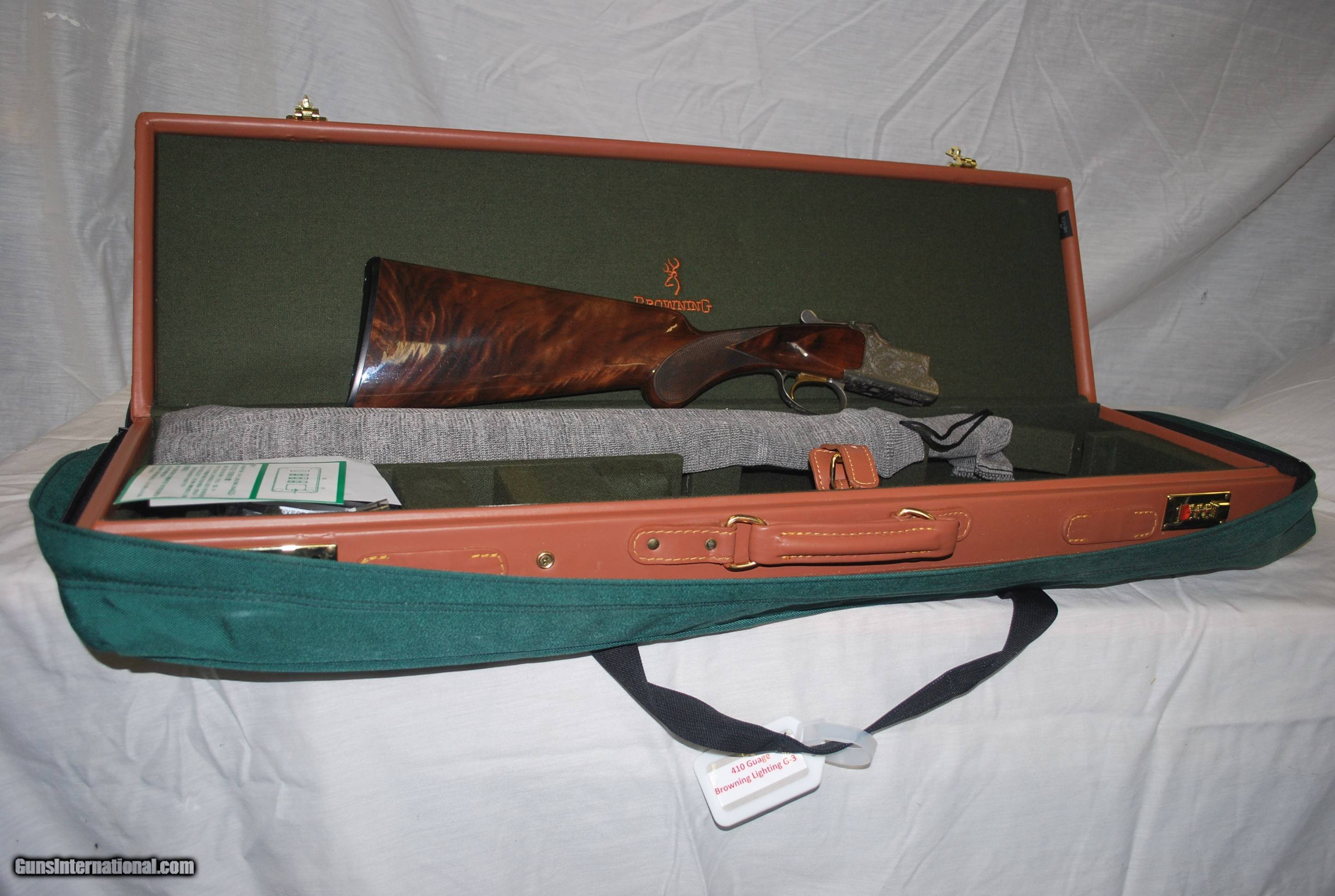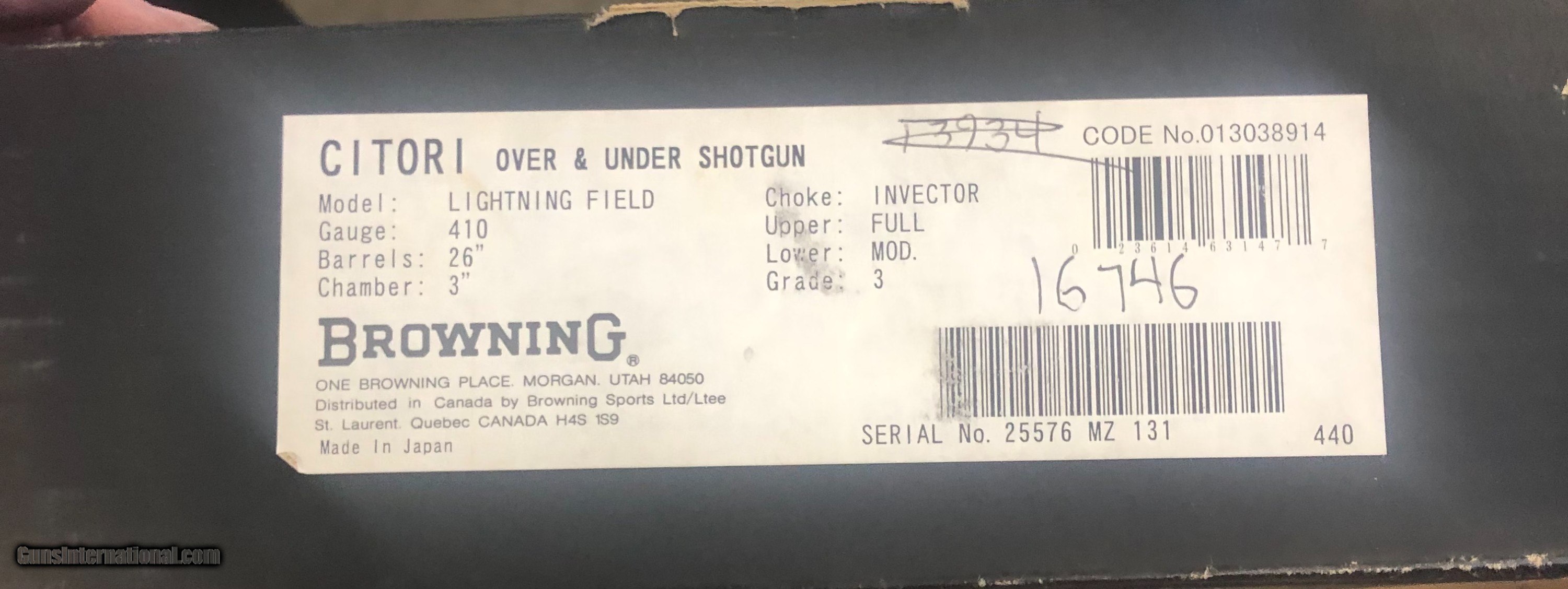Description: Browning Citori Lighting O/U 410 Grade 3 26” 3" Invector F&M New in box not fired, and never assembled. OEM Boxes available. OEM leather case and Cardura HD zip case cover by Big Sky Case Covers of Missoula, MT. Gun socks for barrel and receive plus snap caps, and OEM choke tubes. Condition is 100%. ”Private Party Transfer” Sales Tax does NOT apply in this purchase. Buyer pays for shipping and insurance of full purchase price. ?Evaluation Guidelines are to the best of my ability consulting 44th Edition of “ Blue Book of Gun Values”, Nevertheless it is my intention to deliver an accurate opinion without biases. In efforts to mitigate misunderstandings it is advisable to ask questions about the listing of your interest. Thank you kindly. SOLD Shotgun Gauge: .410 Gauge Manufacturer: Browning Model: Citori Lighting O/U 410 Grade 3 Serial Number: 25576MZ131 Barrel Length: 26 Condition: 100% Metal Condition: New Wood Condition: New Bore Condition: New |