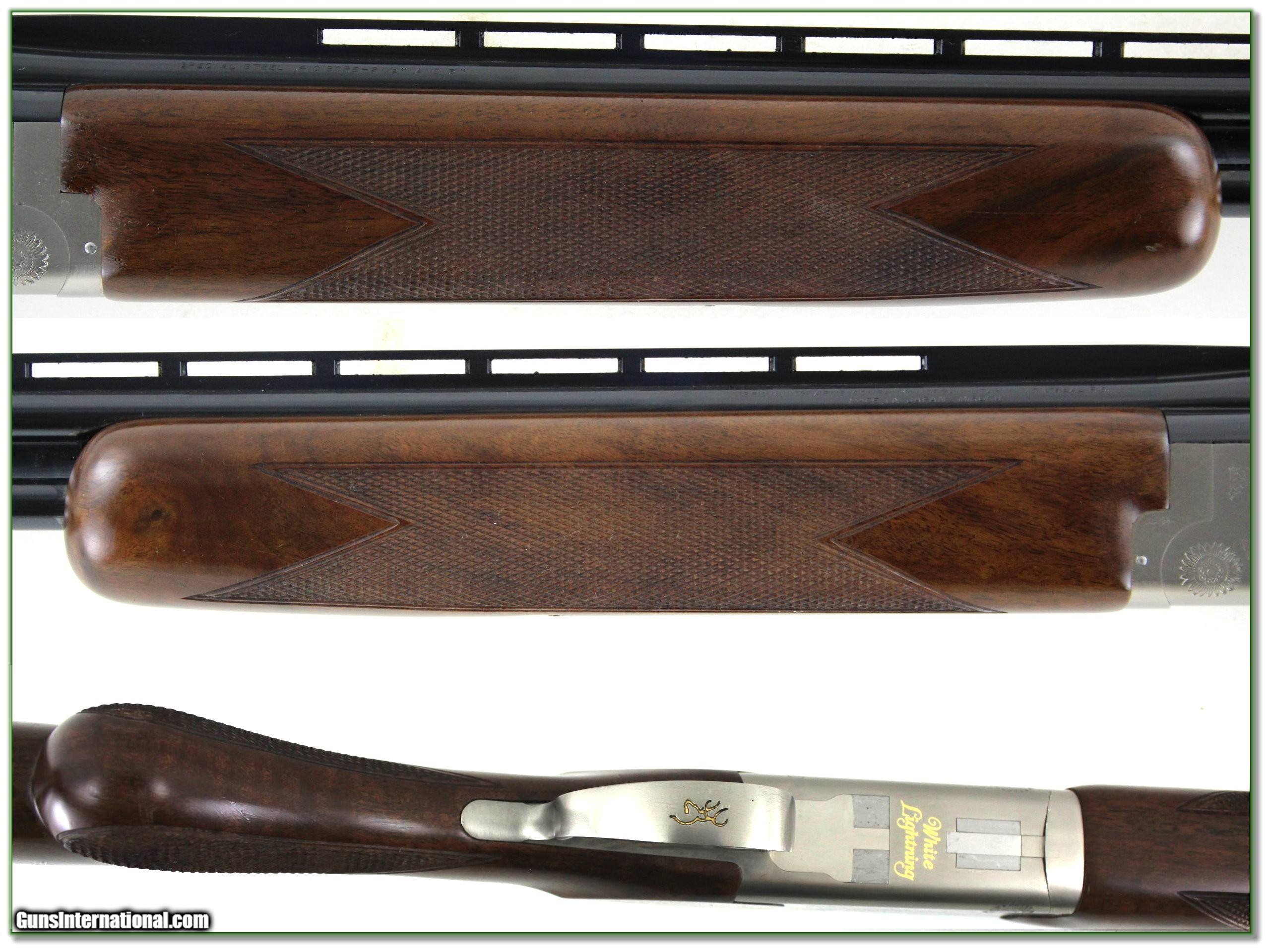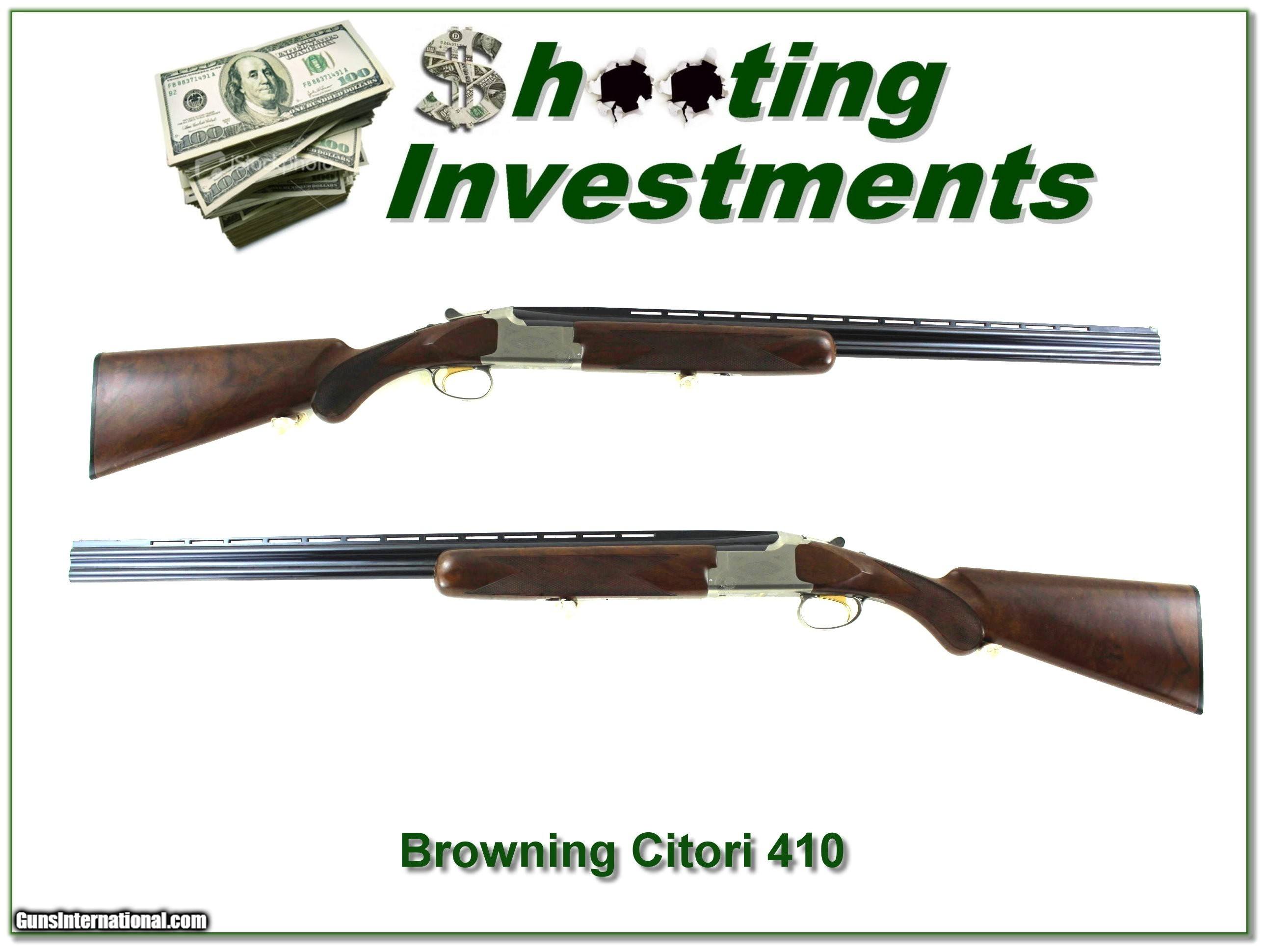 Description: Shooters, this is a beautiful Browning Citori White Lightning in the hard to find 410 Bore. From the bolt face it looks unfired. It has 26in barrels and comes with Full and Mod tubes. The wood has outstanding figure and I found just a few minor marks I expect from storage. The guns lockup it like new too! Shipping and insurance is $49. Please email me with any questions or larger pictures. (Consign your quality firearms with Shooting Investments for only 12%! Let me know if you have any you would like to sell!) 23-1228 Payment: Payment is by Money Order, Cashier’s Check or Personal Check. I can now also accept Credit Cards (MasterCard, Visa, Discover & American Express) with a 3% convenience fee. Shipping: The shipping charge will be listed in each description. It is $49 for most firearms. Some heavy guns or those insured for over $2000 will be higher. Shipments to Alaska and Hawaii are higher because air shipment is required. Most firearms are shipped on Tuesday and Thursday and usually in 5 days of receipt of payment. We package all shipments carefully and insure them. Optics are shipped Priority Mail and most other non-firearm shipments are shipped First Class. Returns: Our return policy is simple. If for any reason you are not pleased with your purchase, you may return your item for a full refund of purchase price. Ammunition cannot be returned. It is important to us that you are happy. Guns cannot be fired or dissembled before returning them and they must be returned in the same condition as received. Notification of a return must occur within 3 days of receipt at your dealer. Shipping, convenience and dealer fees are not refundable and are the responsibility of the buyer. Lay-a-way: If needed, we offer a 60 day lay-a-way option on most firearms. It is 1/3 now, 1/3 in 30 days and 1/3 in 60 days. Lay-a-way firearm sales are final and cannot be returned. If a lay-a-way is not completed the first payment cannot be refunded. Consigning your firearms with Shooting Investments: We will help you get top dollar for your firearms. While most local guns shops charge 20% or more, our fee is only 12% with a minimum of $75. At your local gun shop it might take months to sell. Selling on-line provides instant access to thousands of interested buyers. You won’t find any other on-line dealer willing to sell your firearms for only 12% or listing every gun on 3 separate s. Selling through an House typically costs the seller 15% and the buyer an addition 15% (so 30%) and you have to wait several months to sell and longer to receive funds. If properly priced, we will sell your firearms within a few weeks. Send us an email or give us a call and we’ll explain how easy it is for you to get top dollar. Trading: Trading for us is really just buying your gun to re-sell. If you have a gun you want to trade, please email a picture and we will let you know what we can give for it. You will always get more if we sell it for you on consignment. SOLD |