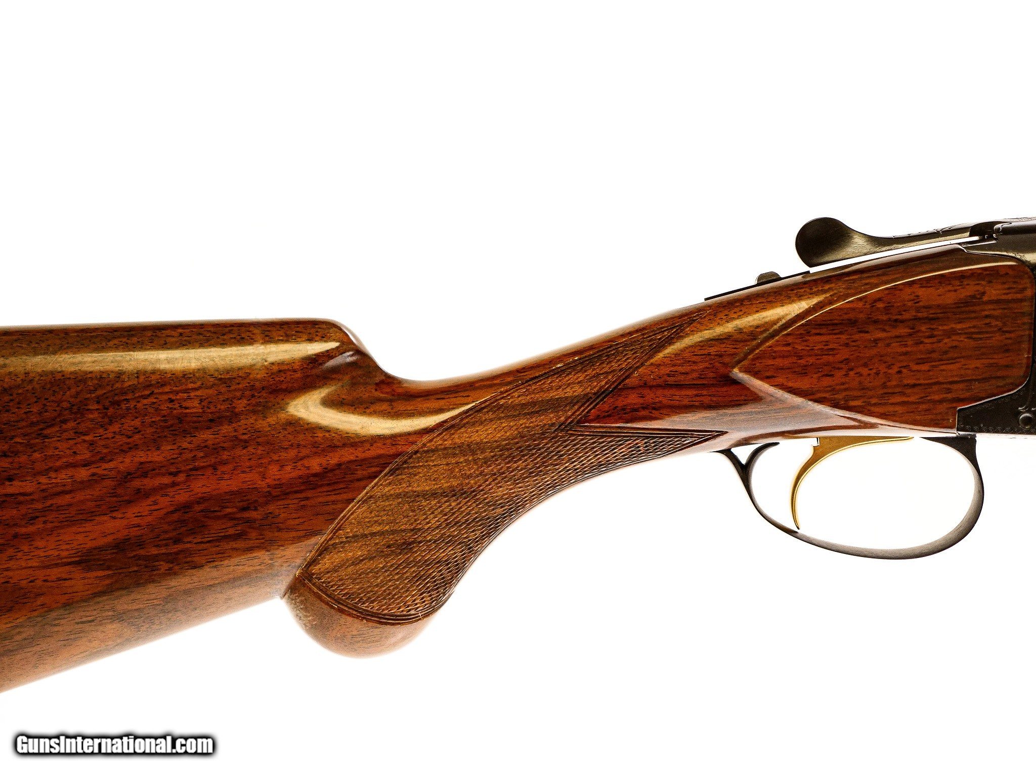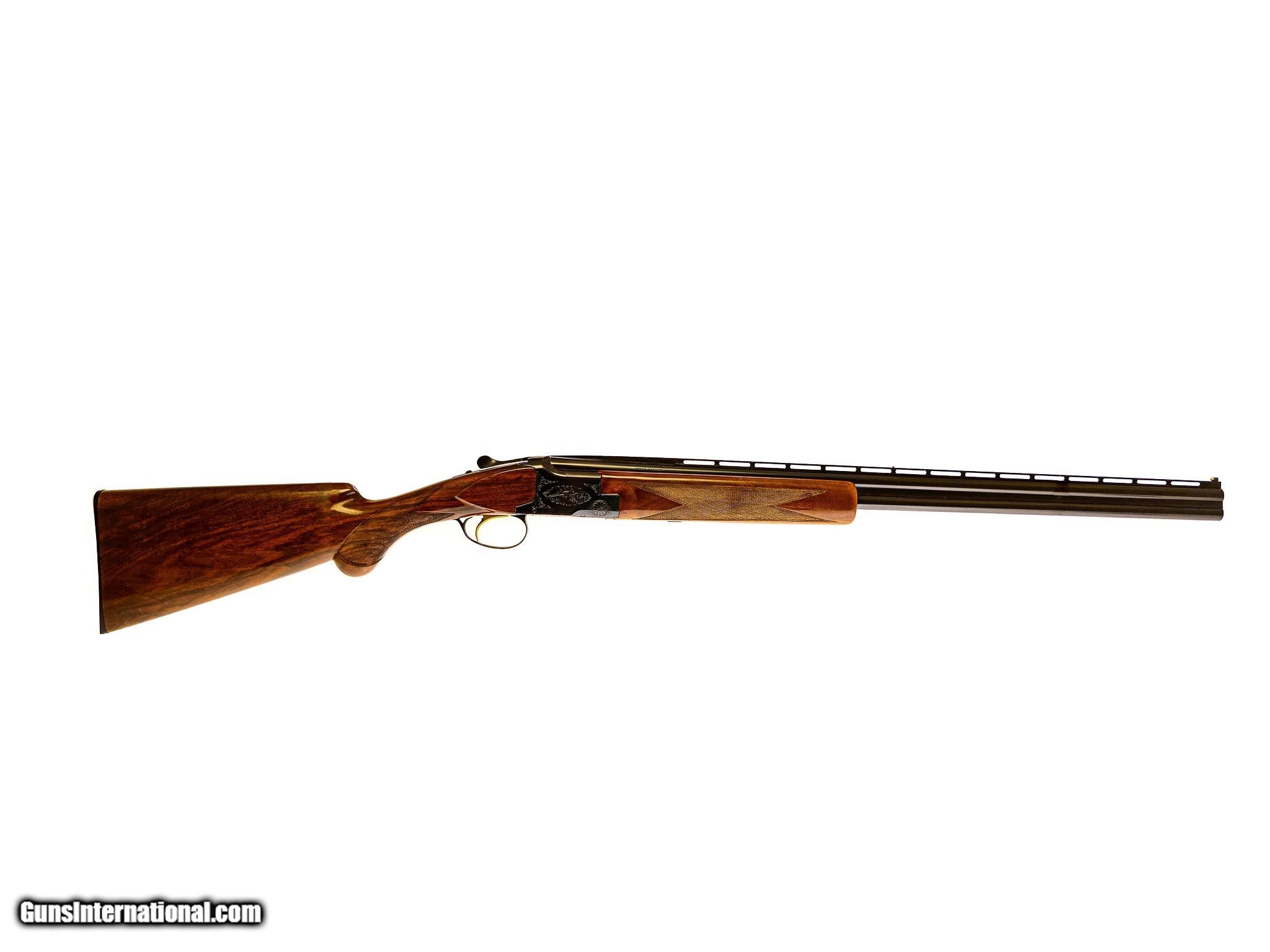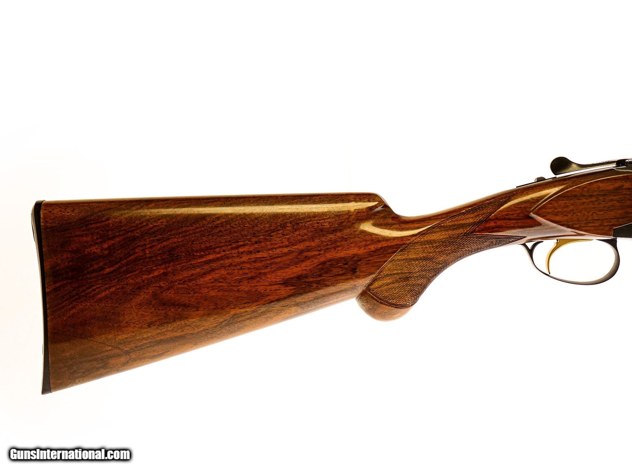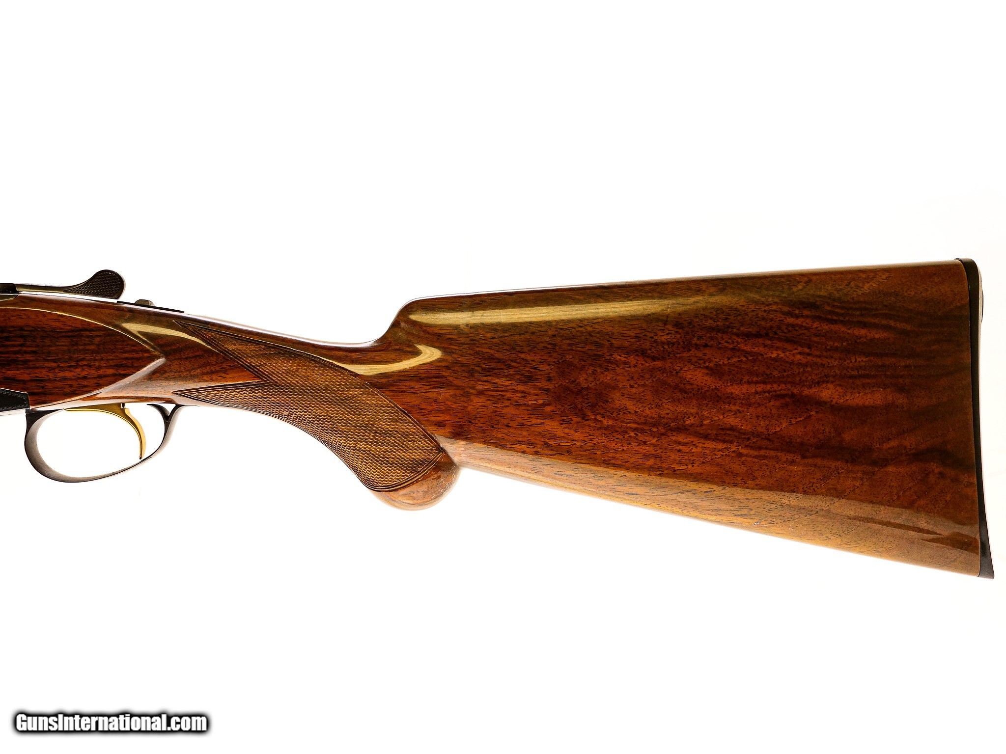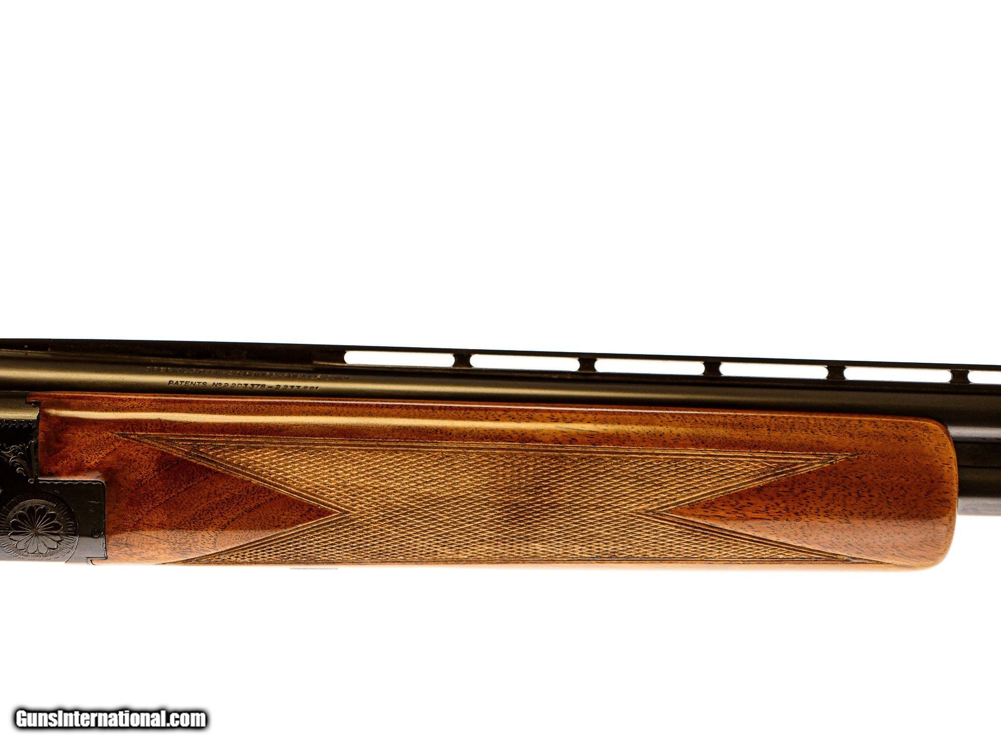 Description: Browning - Grade 1, 28ga. 26 ½” Barrels Choked SK/SK. 26 ½” Barrels Choked SKEET/SKEET, Round knob, short tang, 1968 manufacturer, no salt. 14 1/8” LOP over original Browning butt plate. Appears brand new and unfired. No marks on the face of the gun, blue, or wood. Checkering sharp and clean. No finish or handling marks anywhere. Very sought after gun. Inv: 61567 6 lbs. 10 oz. $8,995.00 SOLD |