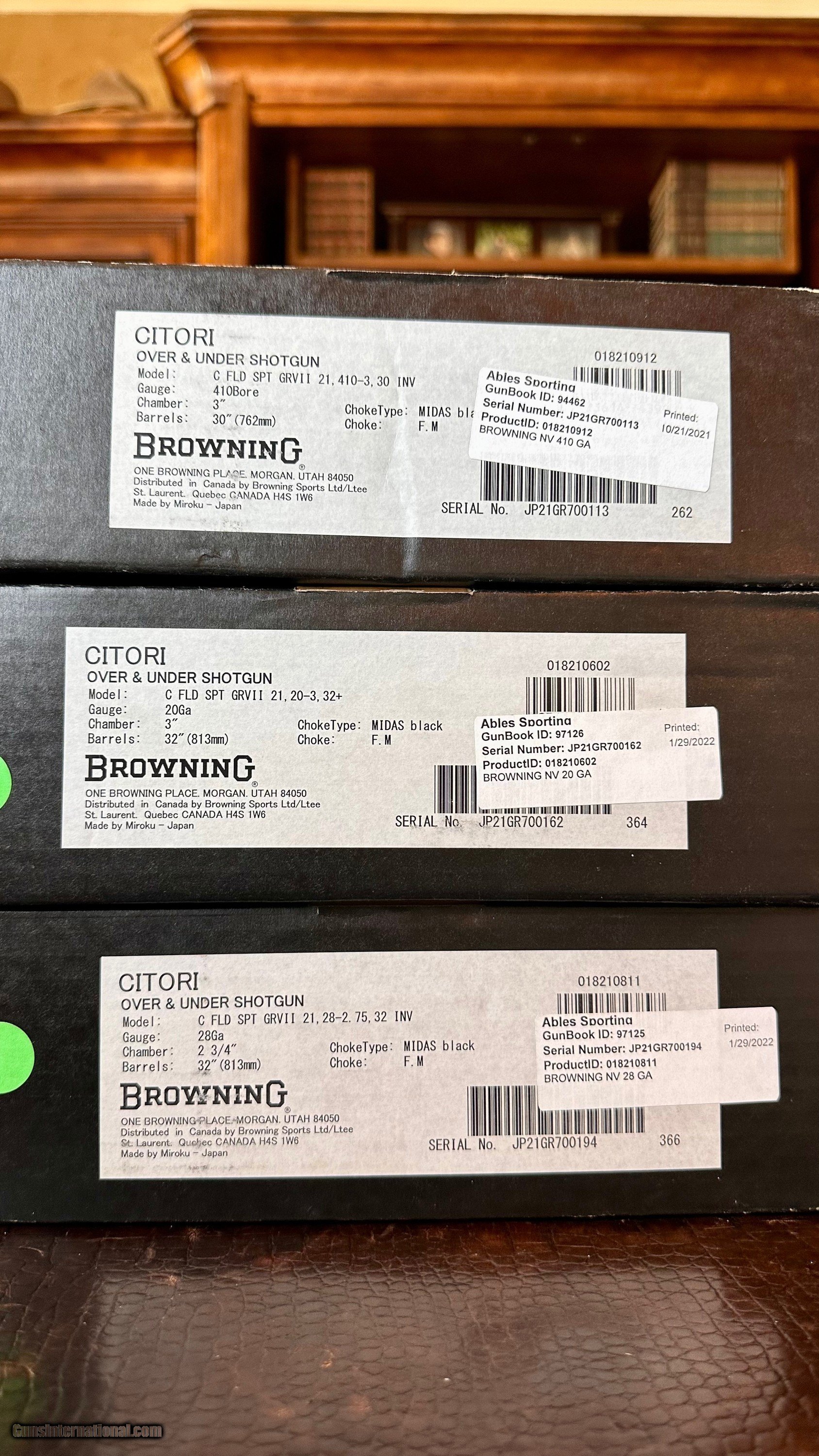 BROWNING GRADE VII FIELD SPORT 410GA 28GA 20GA NIB NIC UNFIRED TRÍO OF THE FINEST BROWNING 32” 30” HIGH GRADE PROGRAM