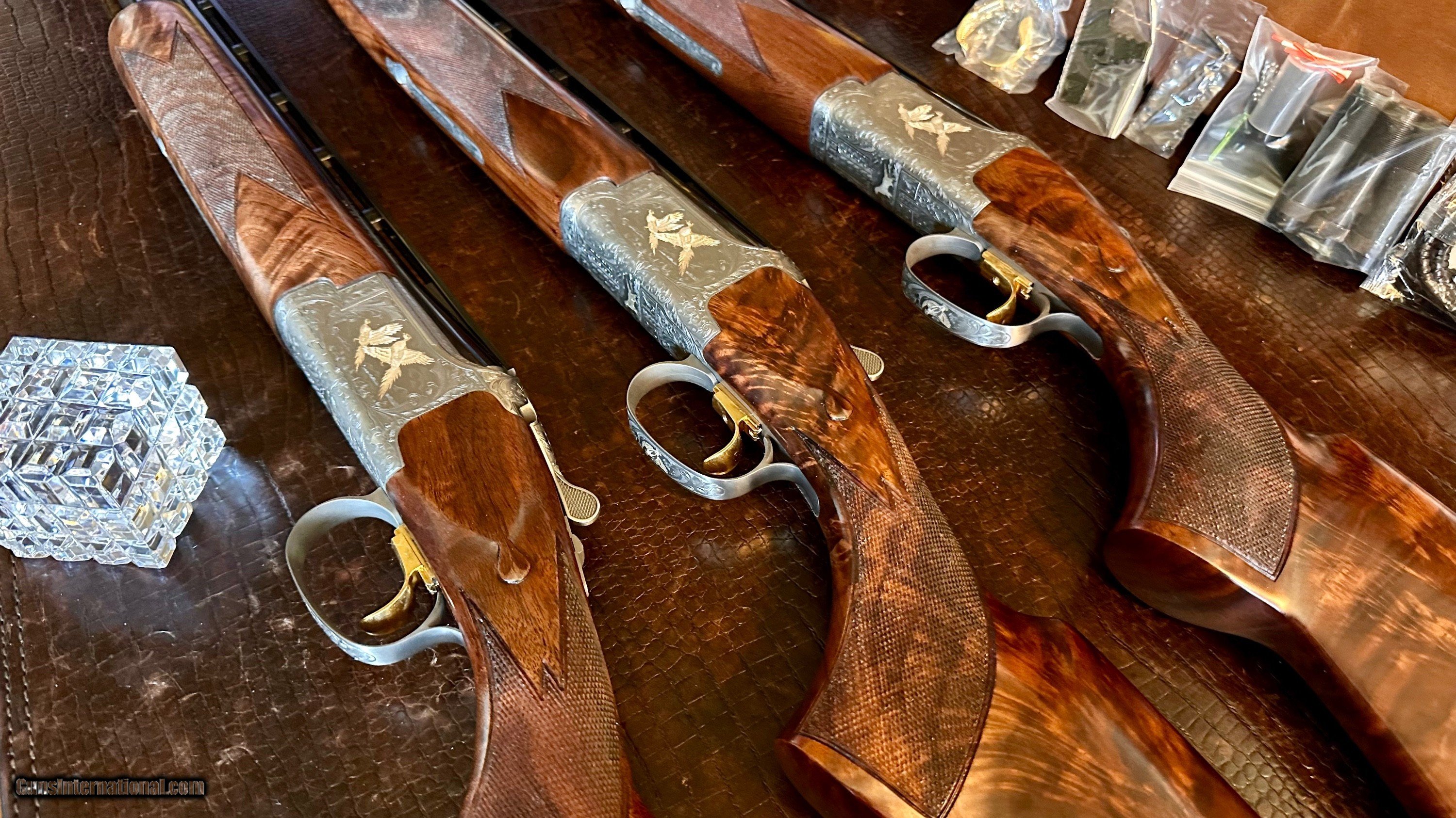 Description: BROWNING GRADE VII FIELD SPORT 410GA 28GA 20GA NIB NIC UNFIRED TRÍO OF THE FINEST BROWNING 32” 30” HIGH GRADE PROGRAM -- SOLD AS A SET -- PLEASE INQUIRE ABOUT INDIVIDUAL GUN PURCHASES FROM THIS TRIO ***SILVER INLAYS... NOT GOLD TOP: 20GA MIDDLE: 28GA BOTTOM: 410GA Browning Citori Sporting Grade VII Sub Gauge Set, 410/28/20 Gauge, NIB Description: This is a Sub Gauge Set of Browning Citori Field Sporting Grade VII Shotguns chambered in 410, 28 Gauge and 20 Gauge. The 410 gauge features a 30 inch barrel with a 3" chamber. The 28 Gauge features a 32 inch barrel with a 2 3/4 inch chamber and the 20 gauge features a 32 inch barrel with a 3" inch chamber. All three shotguns are brand new in box, never been transferred, never been fired. Ahead of the field, on the range. A finely-crafted over and under shotgun radiates class and elicits stares from shotgun enthusiasts the moment it is extracted from the confines of its case. For 2021, the Browning High Grade Program is pleased to offer just such a firearm. Like the 12 gauge counterpart offered in 2020, the Citori Sporting Grade VII - now available in three subgauge models - will be a highlight of any firearms collection. Extensive receiver engraving covers the receiver and features silver accented game birds. Richly finished Grade VI-VII walnut is near seamlessly fit to the receiver. Because looks aren't everything, the Citori Field Sporting is built to function and perform at a level that exceeds the beautiful appearance. Be aware, if you purchase one of these limited edition models that it will be difficult to resist bringing this fine shotgun to the range - or even the field - to display its full potential. Beautiful engraving with silver bird and dog accents Gloss oil finish Grade VI/VII walnut stock with name plate inlay for owner's initials Triple Trigger System with three trigger shoes HiViz Pro Comp sight and ivory mid-bead Five extended black Midas Grade choke tubes Ideal for sporting clays/skeet/hunting Specifications: Gauge: 410 Chamber Length: 3" Barrel Length: 30" Overall Length: 47 1/2" Length of Pull: 14 3/4" Drop at Comb: 1 1/2" Drop at Heel: 2 1/4" Weight: 7 lbs 6 oz Rib Width: 3/8 - 1/2" Barrel Finish: Polished Blued Stock Finish: Gloss Oil Browning Citori Sporting Grade VII Sub Gauge Set, 410/28/20 Gauge, NIB - Over Under Shotguns Wood Grade: Grade VI/VII Chokes Included: Full, Improved Modified, Modified, Improved Cylinder, Skeet Receiver Finish: Silver Nitride Chamber Finish: Chrome Plated Chamber Front Sight: HiViz Pro-Comp Choke System: Standard Invector Midas Barrel Material: Steel Stock Material: Black Walnut Recoil Pad: Inflex 2, Large Checkering: Cut 20 LPI Sling Swivel Studs: None Receiver Material: Steel Trigger Finish: Gold Plated Trigger Guard Finish: Silver Nitride Trigger Material: Alloy Trigger Guard Material: Steel Trigger Guard Engraving: Roll/Hand with silver Choke Wrench Included: T-Wrench 28 Gauge Specifications: Gauge: 28 Chamber Length: 2 3/4" Barrel Length: 32" Overall Length: 49 1/2" Length of Pull: 14 3/4" Drop at Comb: 1 1/2' Drop at Heel: 2 1/4" Weight: 7 lbs 6 oz Rib Width: 3/8 - 1/2" Barrel Finish: Polished Blued Stock Finish: Gloss Oil Wood Grade: Grade VIVII Chokes Included: Full, Improved Modified, Modified, Improved Cylinder, Skeet Receiver Finish: Silver Nitride Dura Touch Finish: No Chamber Finish: Chrome Plated Chamber Front Sight: HiViz Pro-Comp Choke System: Standard Invector Midas Barrel Material: Steel Stock Material: Black Walnut Recoil Pad: Inflex 2, Large Checkering: Cut 20 LPI Sling Swivel Studs: None Receiver Material: Steel Trigger Finish: Gold Plated Trigger Guard Finish: Silver Nitride Trigger Material: Alloy Trigger Guard Material: Steel Trigger Guard Engraving: Roll/Hand with silver Choke Wrench Included: T-Wrench 20 Gauge Specifications: Gauge: 20 Browning Citori Sporting Grade VII Sub Gauge Set, 410/28/20 Gauge, NIB - Over Under Shotguns Barrel Length: 32" 49 1/2" Length of Pull: 14 3/4" Drop at Comb: 1 1/2" Browning Rib Width: 3/8 - 1/2" Model Barrel Finish: Polished Bitted Barrel Length: Finish: Gloss Oil WOOD Grade: VII Total Capacheckiver Finish: Silver Nitroved Mogie Motied, Improved Cylinder, Skeet Dura Touch Finish: No sh: Chrome Plated Chamber Choke System: Standard Invector Midas Barrel Material: Steel Stock Material: Black Walnut Recoil Pad: Inflex 2, Large Checkering: Cut 20 LPI Sling Swivel Studs: None Receiver Material: Steel Trigger Finish: Gold Plated Trigger Guard Finish: Silver Nitride Trigger Material: Alloy Trigger Guard Material: Steel Trigger Guard Engraving: Roll/Hand with silver Choke Wrench Included: T-Wrench Over / Under 410/28/20 Gauge 30/32 Inch SOLD Shotgun Gauge: 20 Gauge, 28 Gauge, .410 Gauge Manufacturer: BROWNING Model: CITORI FIELD SPORT GRADE VII Serial Number: SEE BOX LABELS Barrel Length: SEEE BOX LABELS Chambers: 410 3” — 28 2 3/4” — 20GA 3” Condition: NEW LOP: SEE DETAILS IN DESCRIPTION Finish: HAND RUBBED OIL Manufacture Date: 2021 Engraving: SILVER |