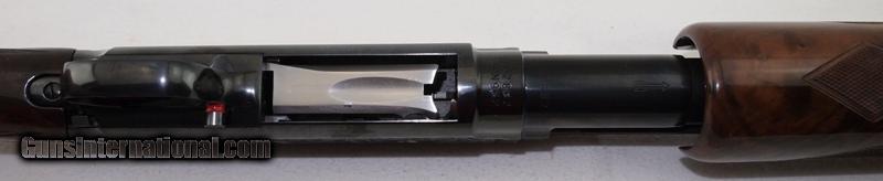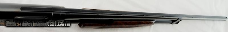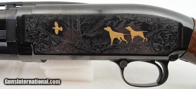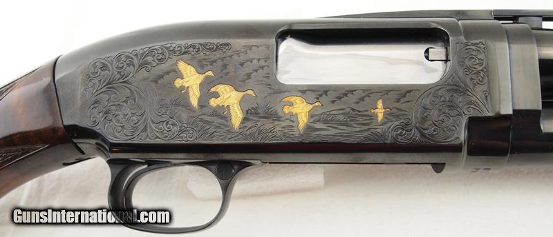 Description: Browning, M-12, Grade V, 20GA 2 3/4", 26" modified bore bbl, vented rib, 99% blued finish, extensive game scene engraving with gold inlays, and select walnut checkered stock. There were only 4,000 of these shotguns mfg in 1988 only. This is a beautifully crafted remake of the original Winchester Model 12 patent by John Browning. Add 3% for Credit Card Shipping $25.00 SOLD |